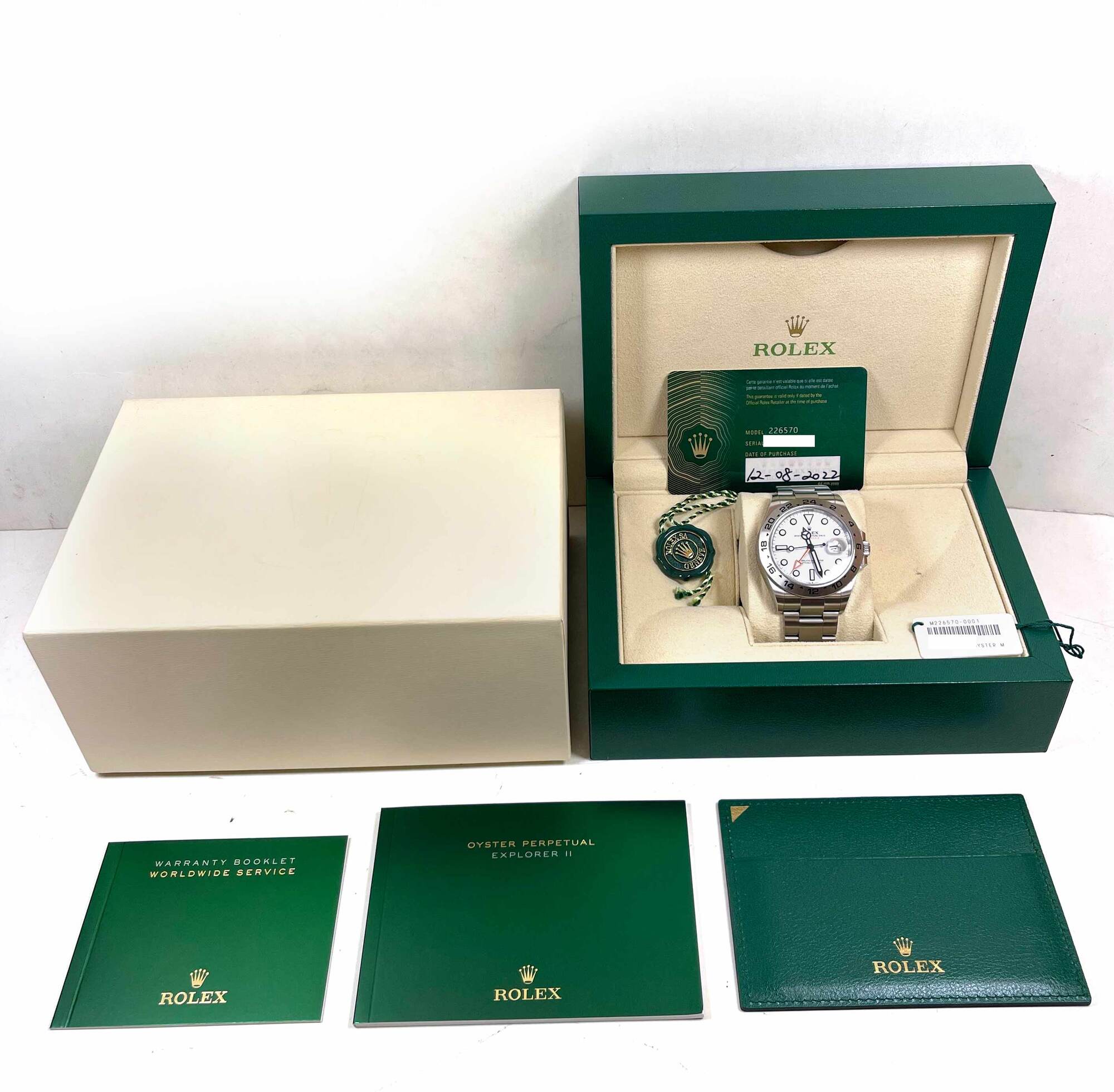 THIS ROLEX IS IN GREAT OVERALL CONDITION AND COMES WITH ITS BOX, BOOKLETS, BOTH HANG TAGS, AND WARRANTY CARD DATED AUGUST 12TH, 2022 AS SHOWN IN THE PICTURES ATTACHED. THIS WATCH IS IN STOCK AND AVAILABLE TO SHIP IMMEDIATELY!