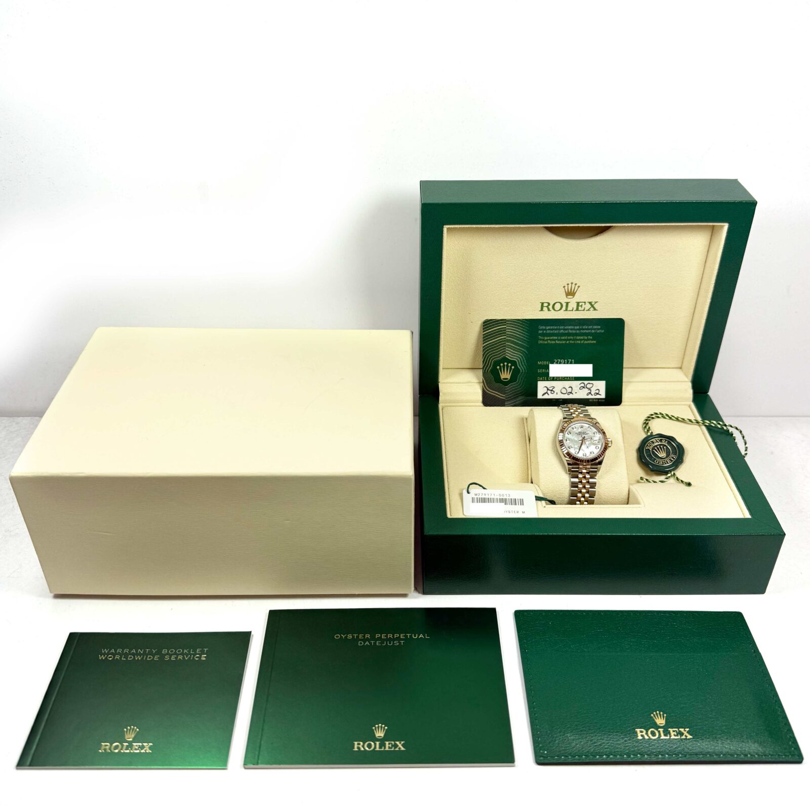 this rolex is in excellent overall condition showing some light signs of surface wear consistent with preowned watches. This comes with its box, booklets, hang tags, and warranty card dated february 28th, 2022 as shown in the pictures attached. This watch is in stock and available to ship immediately!