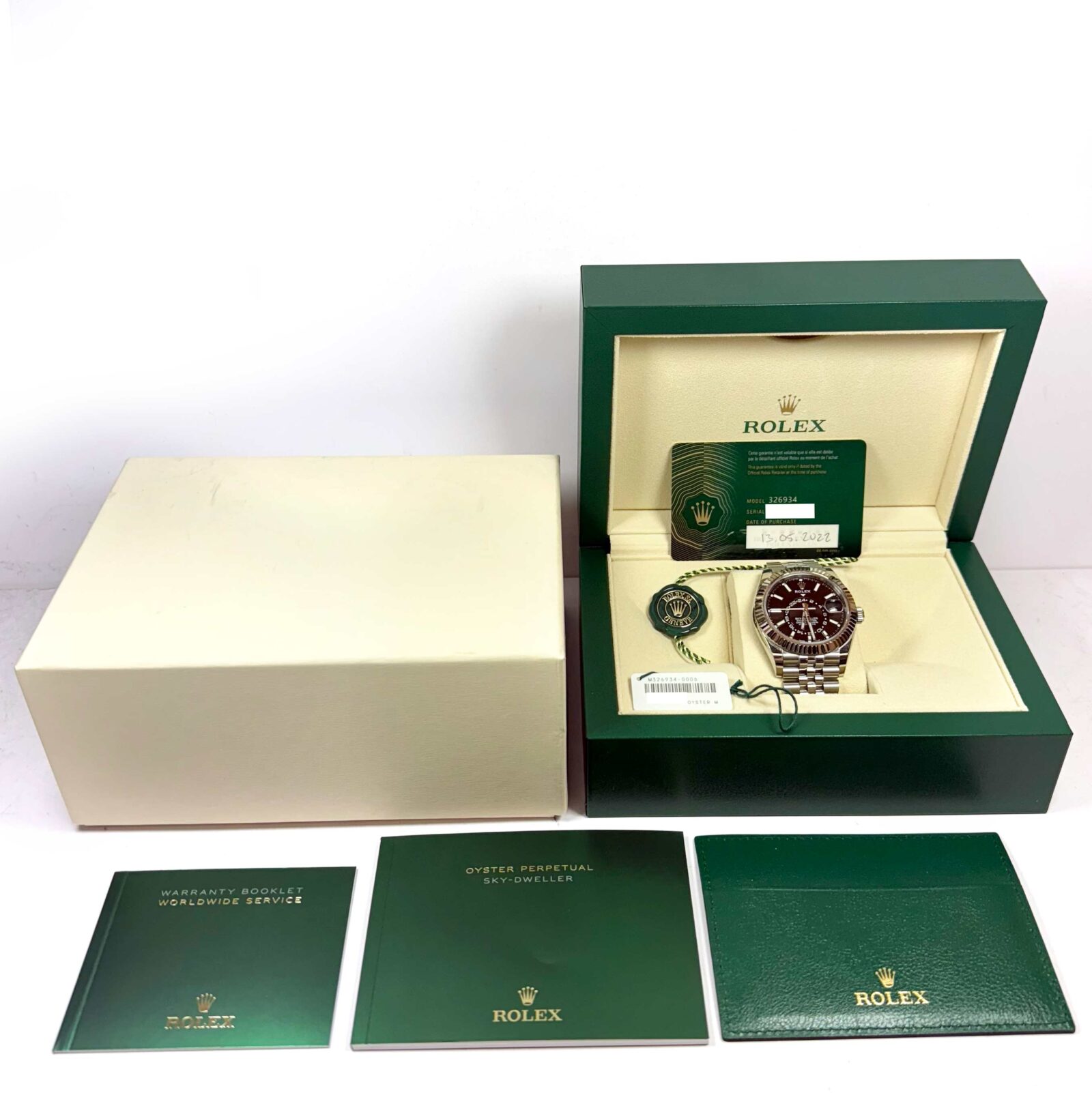this rolex watch is in excellent overall condition showing some light signs of surface wear consistent with preowned watches. This comes with its box, booklets, hang tags, and warranty card dated may 13th, 2022 as shown in the pictures attached. This watch is in stock and available to ship immediately!