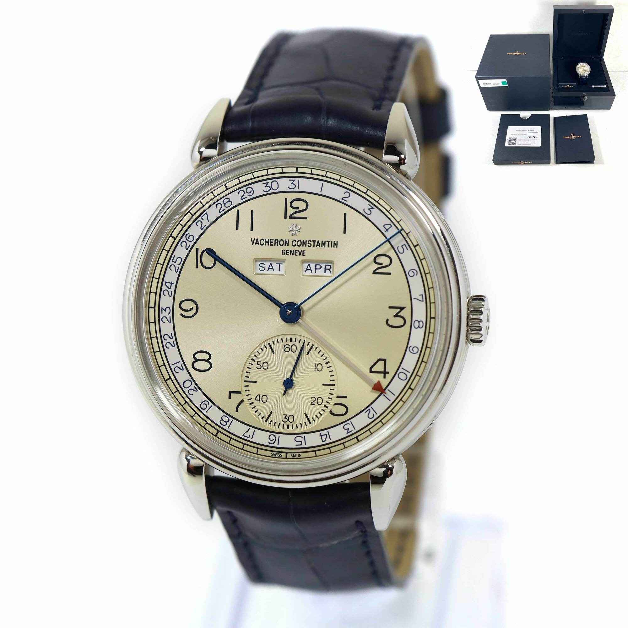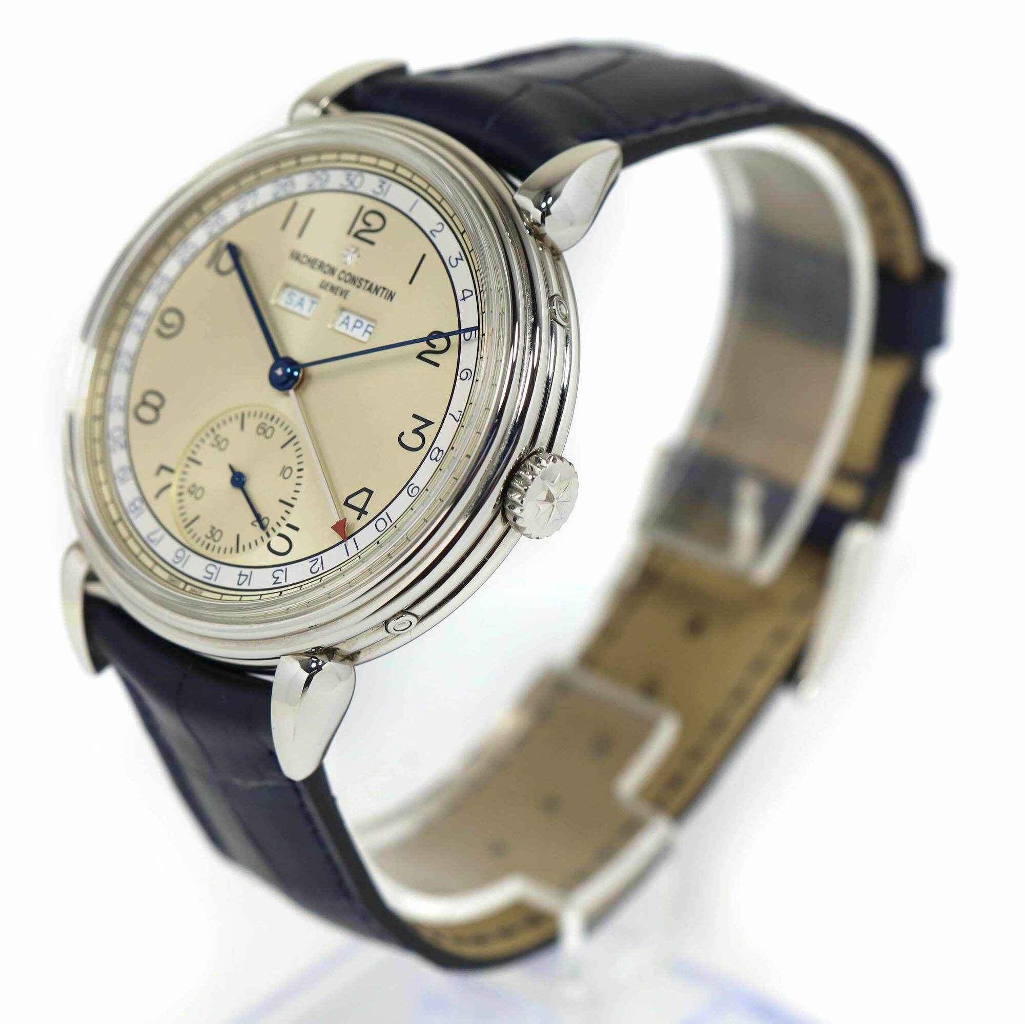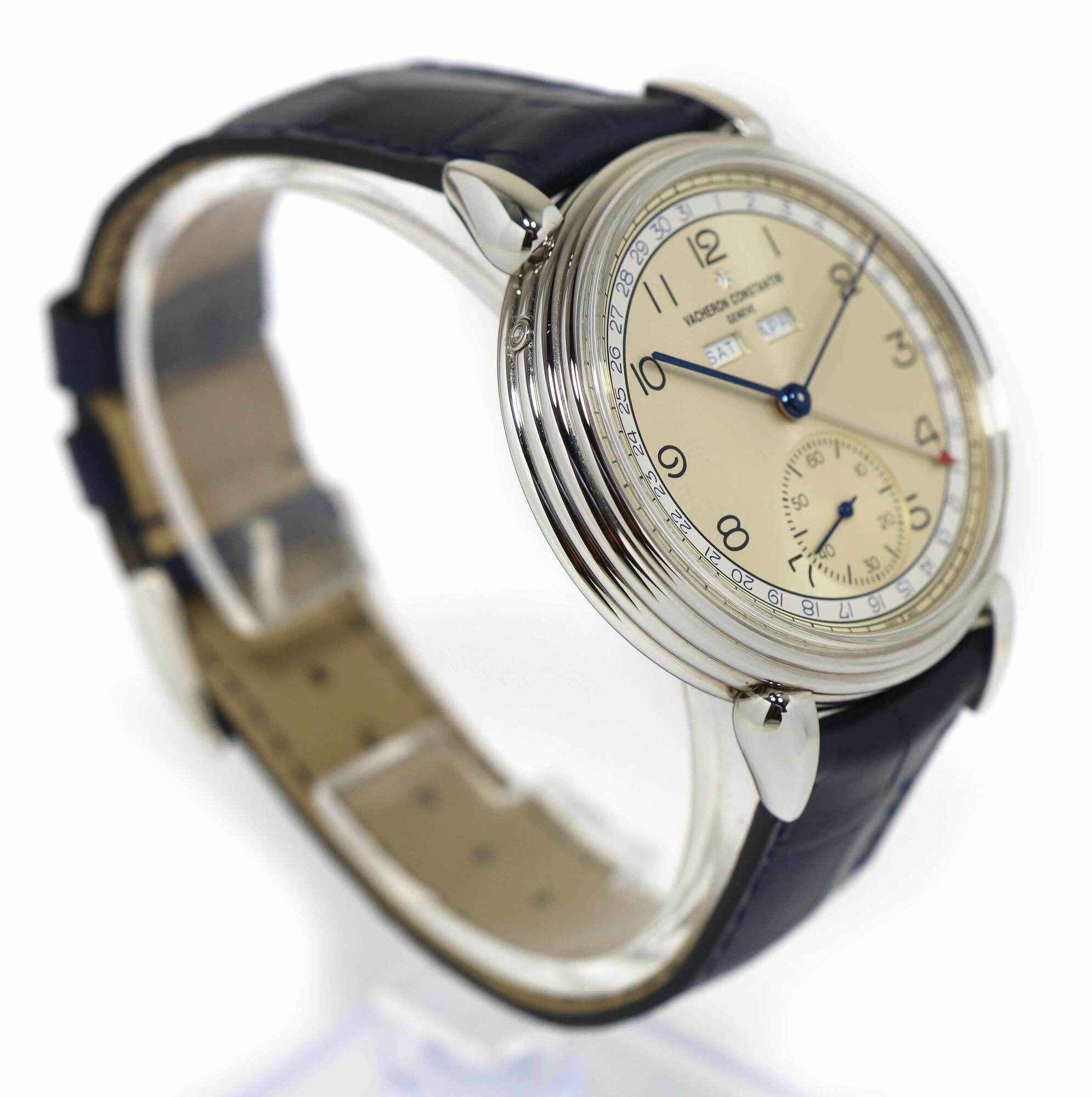 Read Morethis vacheron is in excellent condition and comes with its box, hang tag, vacheron tool, and warranty card dated october 11th, 2022 as shown in the pictures attached. The inside box for this watch does not latch shut. This watch features a 40mm stainless steel case that surrounds a beige dial and comes on a blue alligator strap with a stainless steel tang buckle. The watch functions include hours, minutes, seconds, date, day and month. This watch is in stock and available to ship immediately!