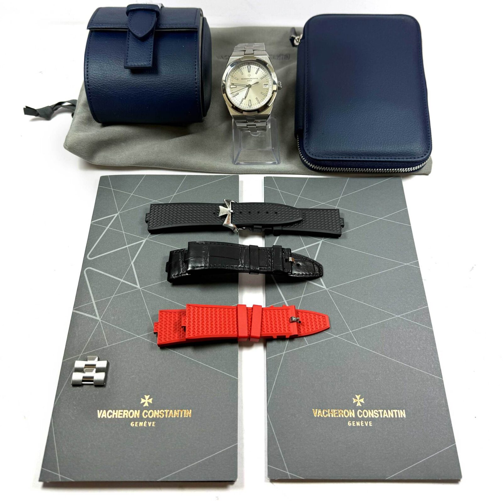 this vacheron constantin watch is in great overall condition showing some signs of surface wear consistent with preowned watches. This comes with its box, booklets, original sales receipt, 3 spare straps, spare links, travel case, and warranty card dated september 10th, 2022 as shown in the pictures attached. This watch is in stock and available to ship immediately!