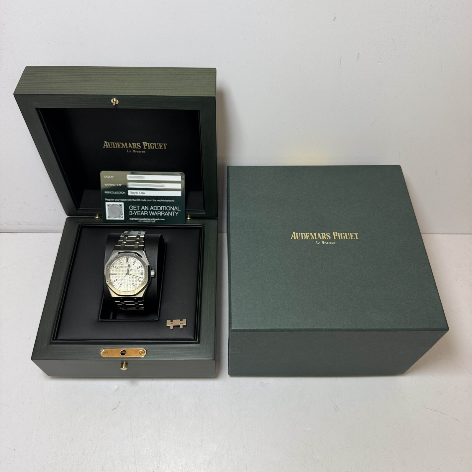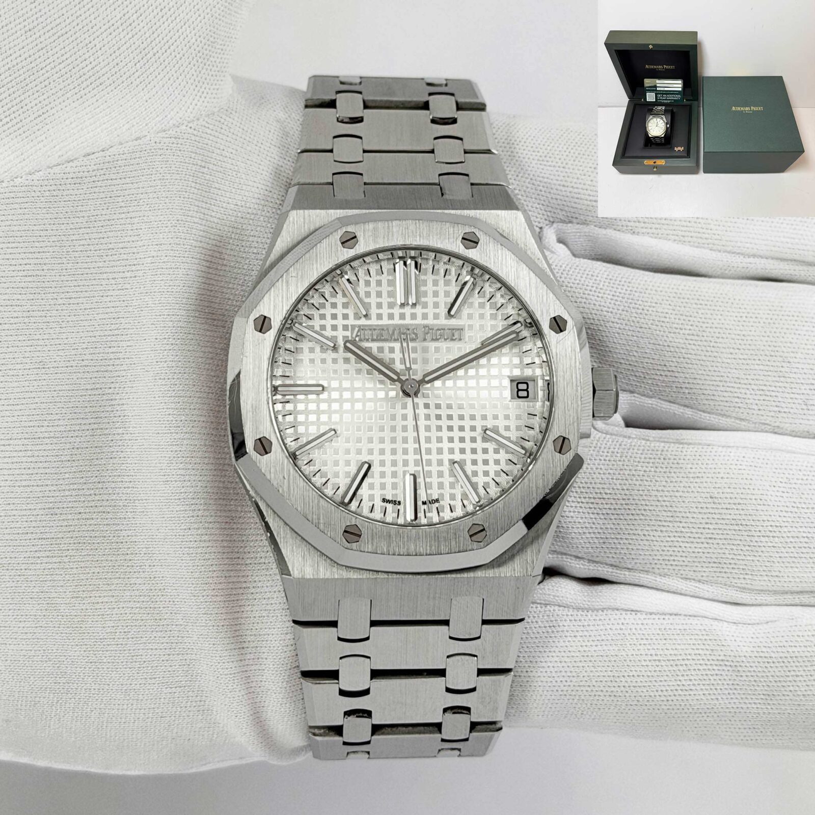 This Audemars Piguet Royal Oak watch comes with its box, extra link, and warranty card. The photos shown are of the exact watch being sold and accurately represent its condition. This watch is in stock and ready to ship immediately!