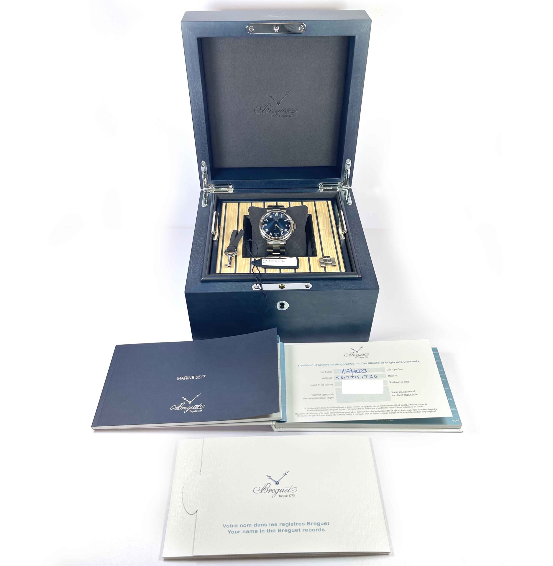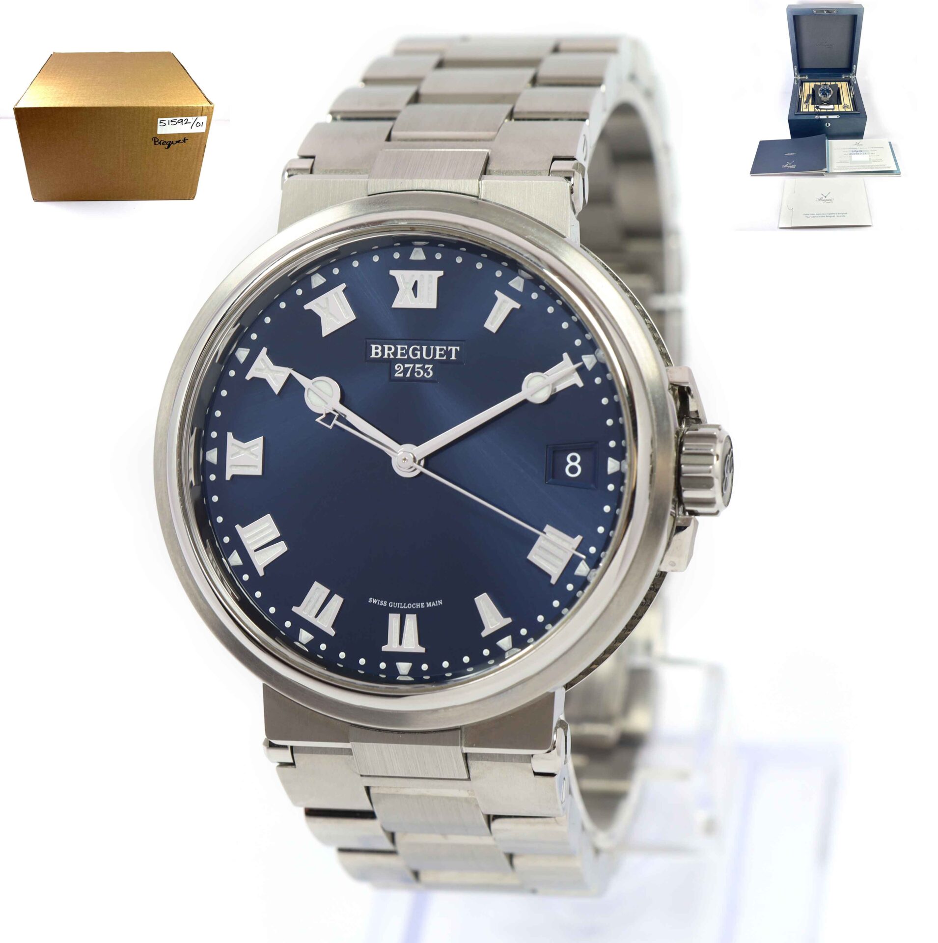 THIS BREGUET WATCH IS IN EXCELLENT CONDITION AND COMES WITH ITS BOX, BOOKLETS, SPARE LINKS, BOS KEY, HANG TAG, AND WARRANTY PAPER DATED JANUARY 17TH, 2023 AS SHOWN IN THE PICTURES ATTACHED. THIS WATCH IS IN STOCK AND AVAILABLE TO SHIP IMMEDIATELY!