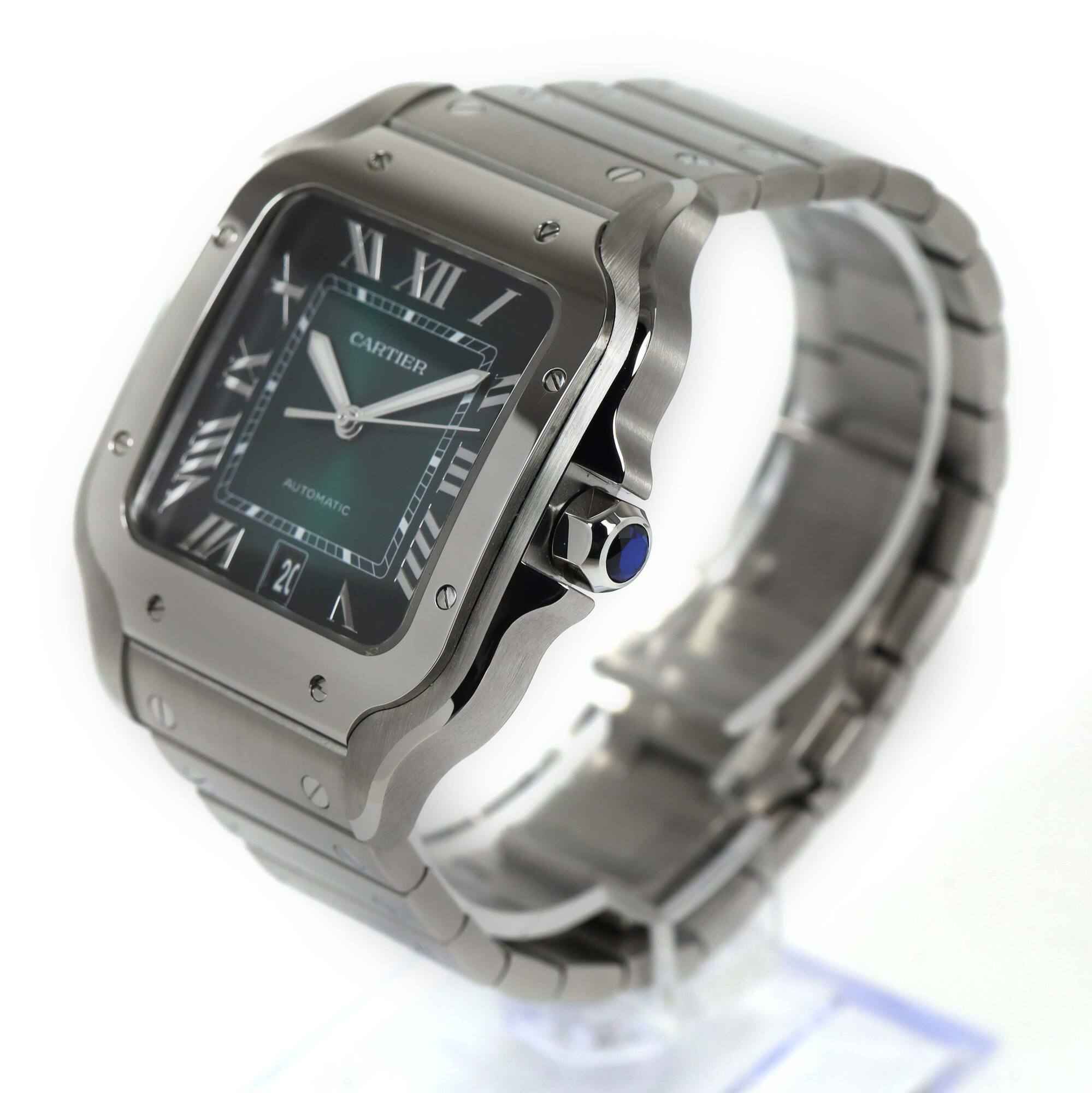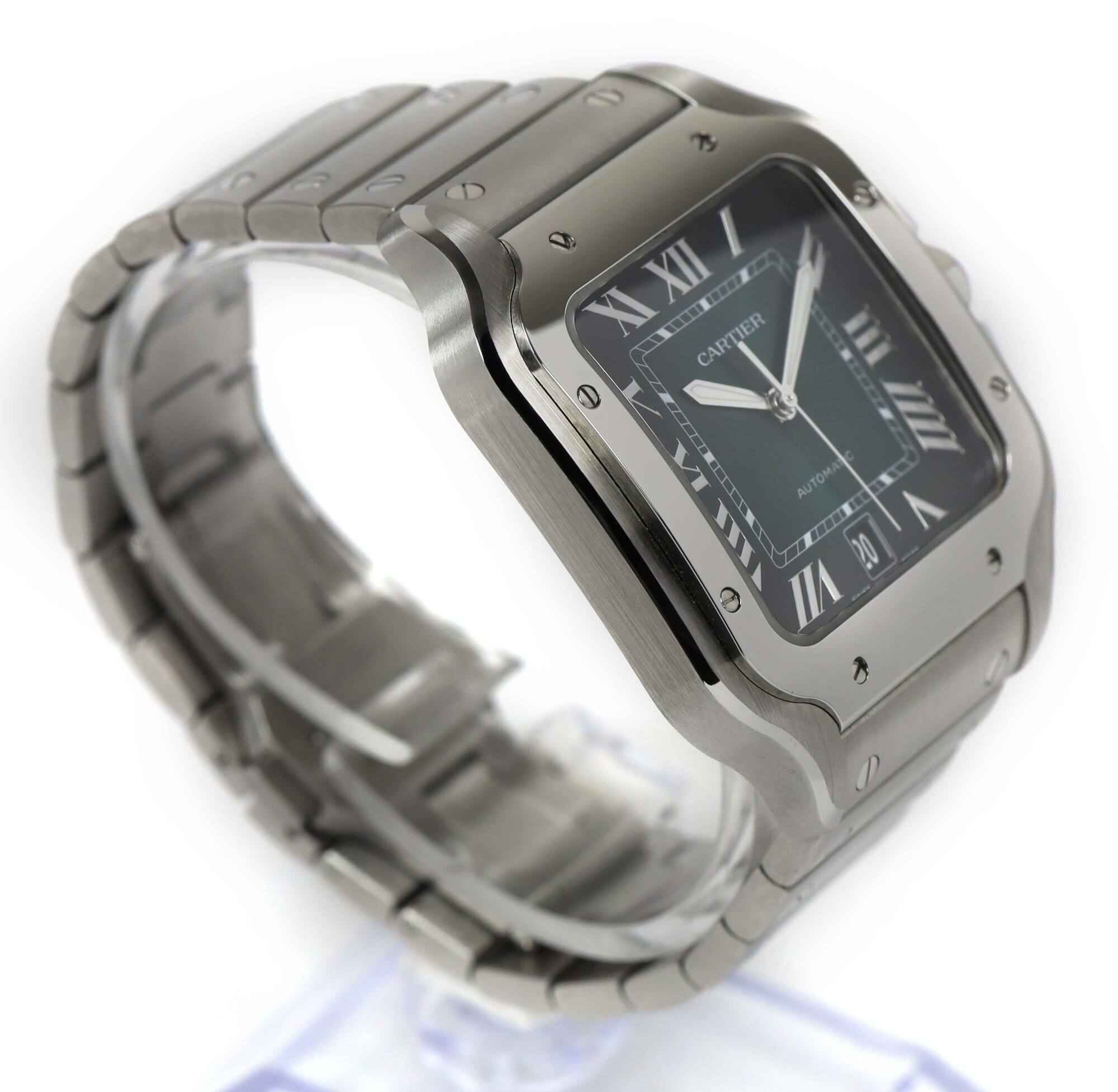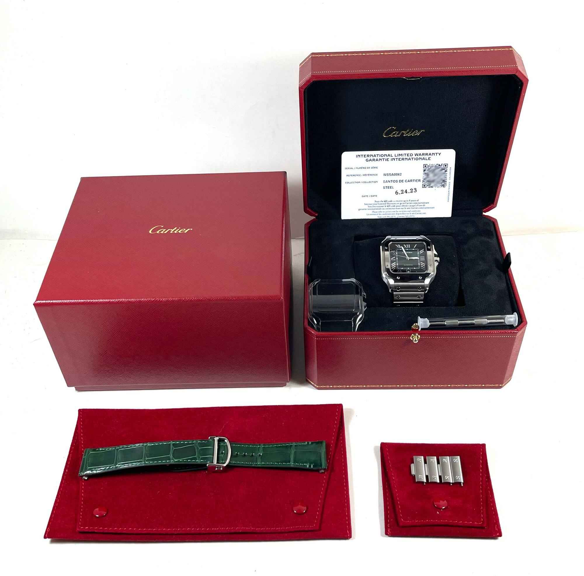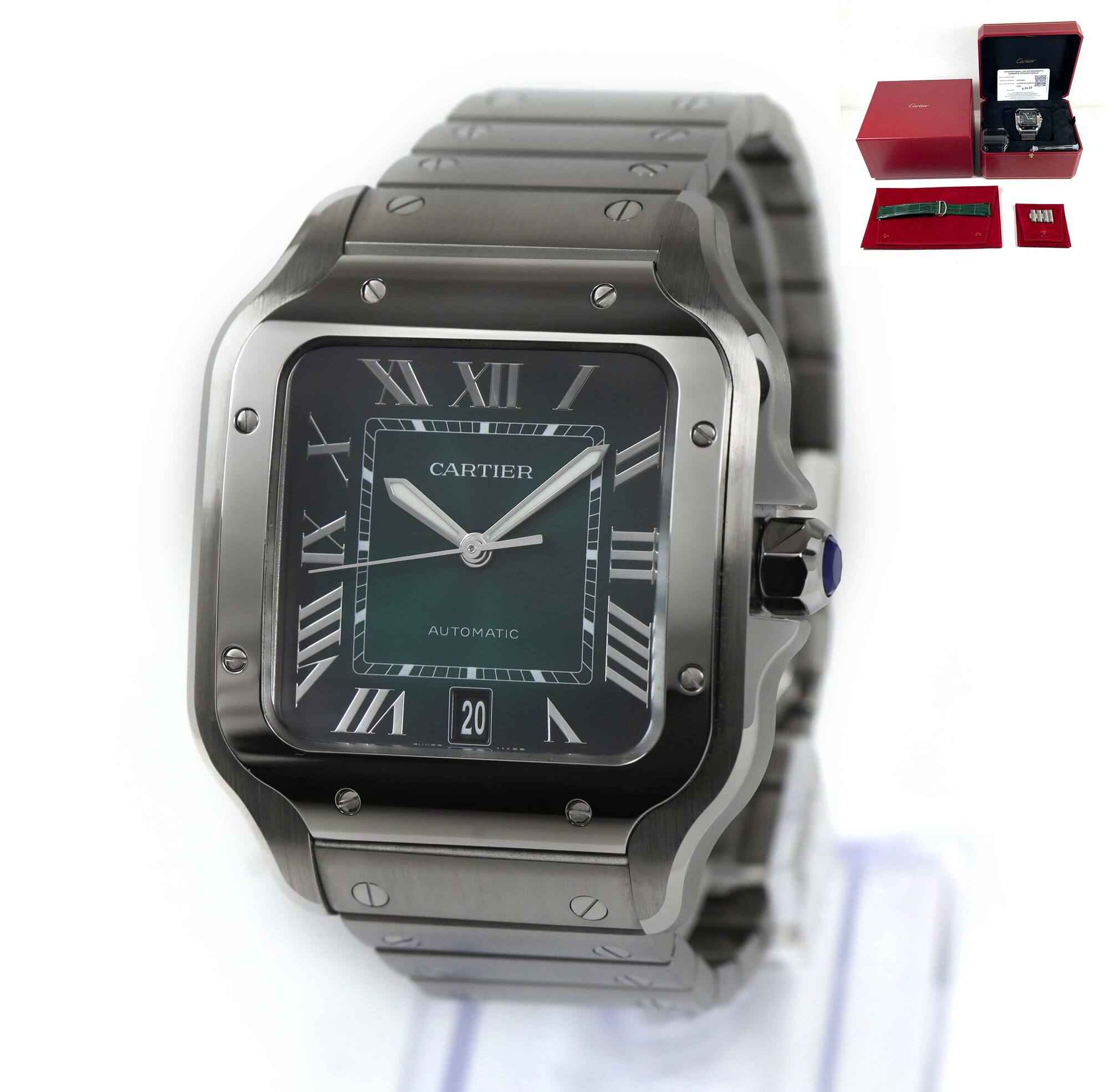 Read Morethis cartier watch is in excellent overall condition and comes with its box, spare links, one additional green leather strap, cartier tool, bezel protector, and warranty card dated june 24th, 2023 as shown in the pictures attached. This watch is in stock and available to ship immediately!