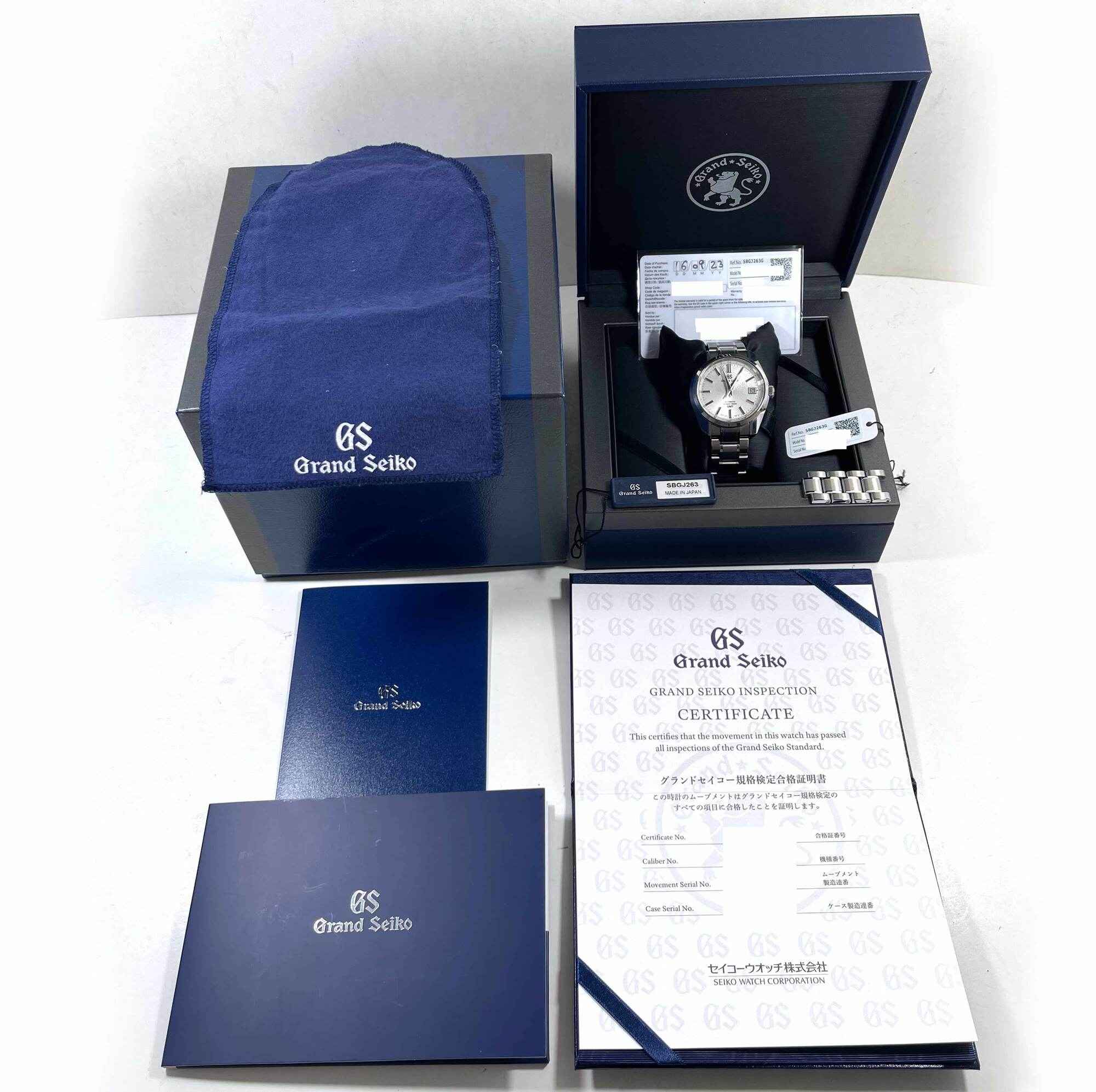 THIS GRAND SEIKO IS IN EXCELLENT CONDITION SHOWING SOME LIGHT SIGNS OF WEAR ON THE CASE AND BRACELET CONSISTENT WITH PREOWNED WATCHES. THIS COMES WITH ITS BOX, BOOKLET, HANG TAGS, SPARE LINKS, AND WARRANTY CARD DATED SEPTEMBER 16TH, 2023 AS SHOWN IN THE PIC...