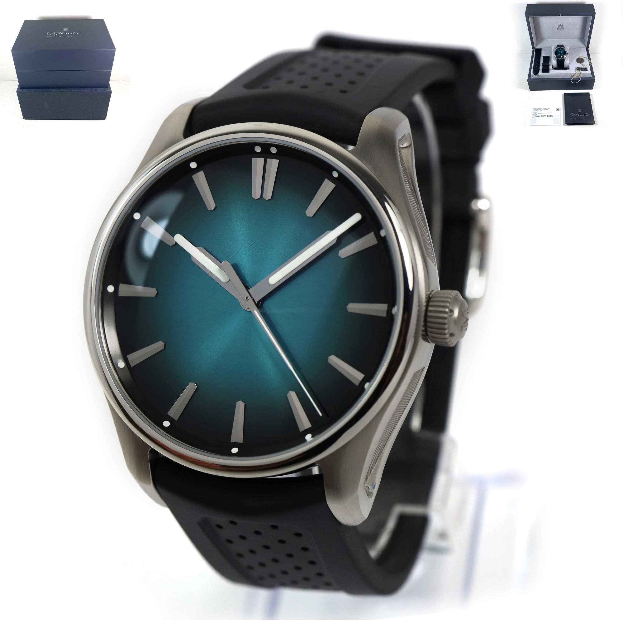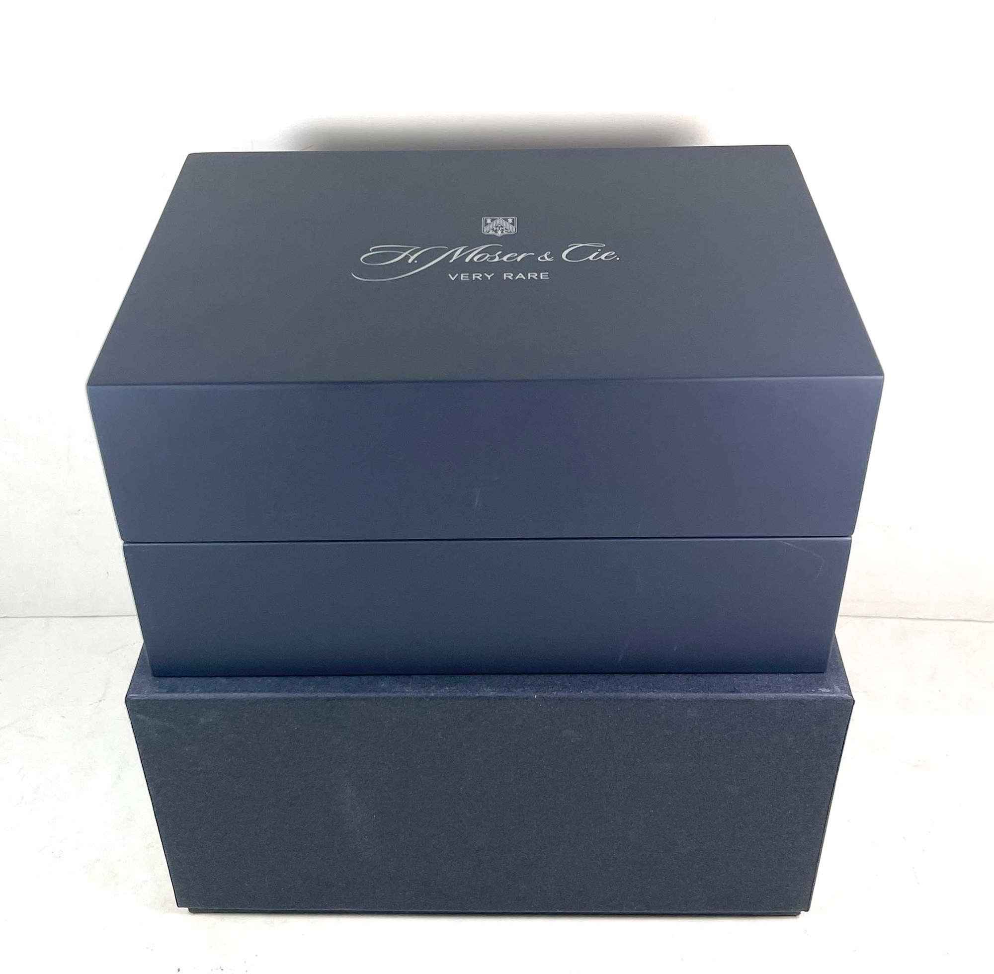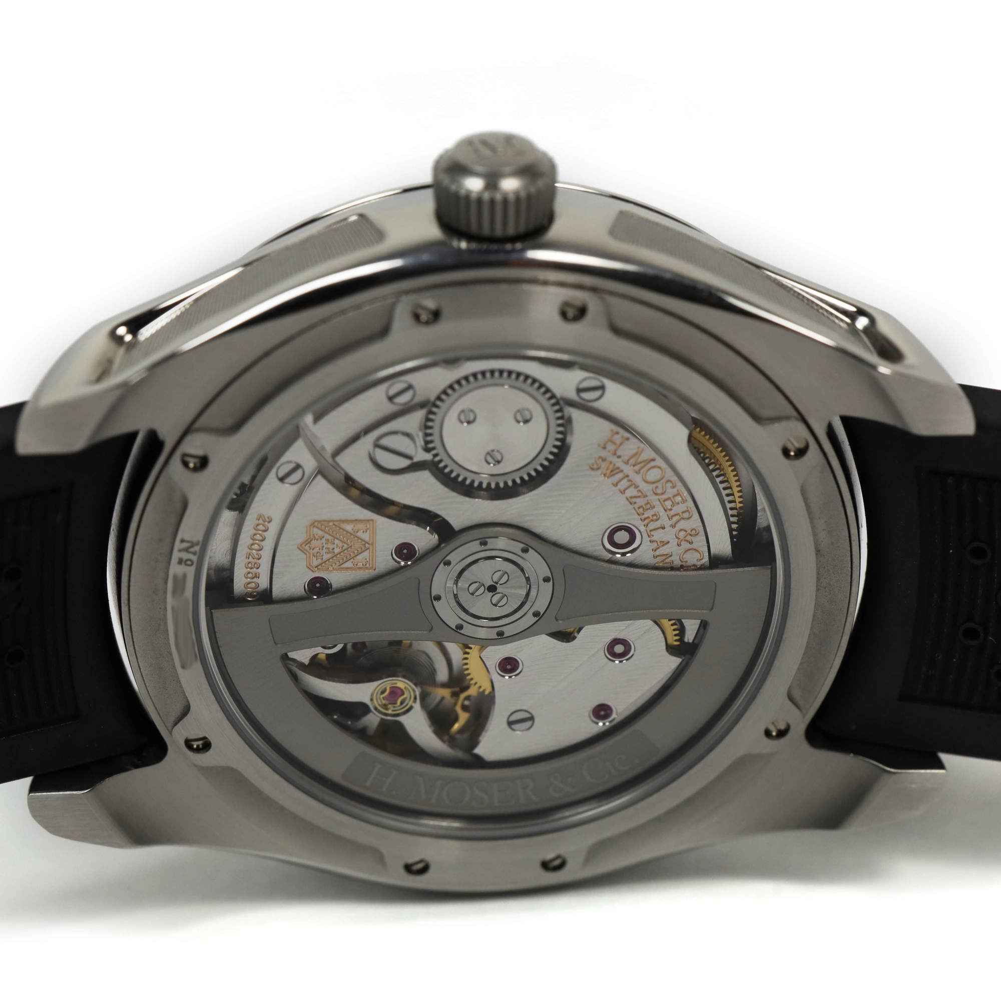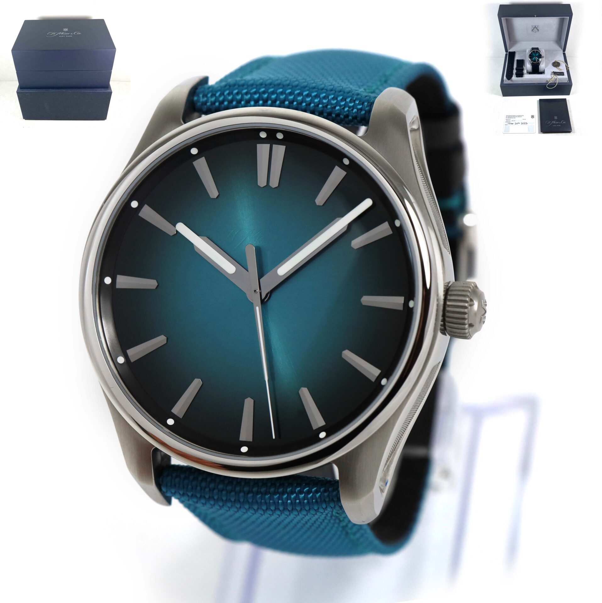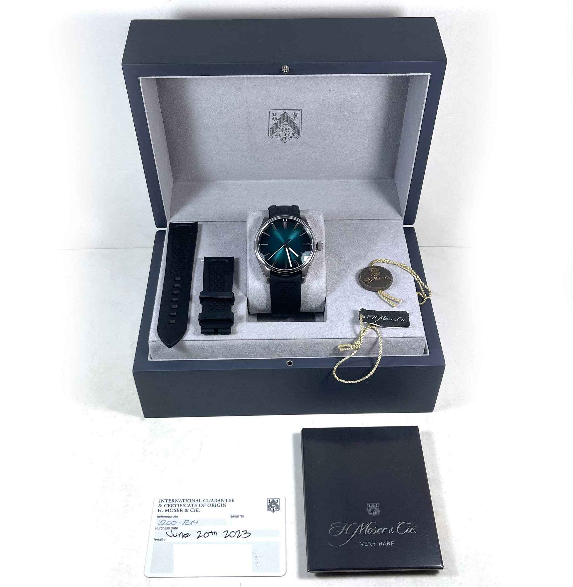 THIS MOSER IS IN SUPER CONDITION AND COMES WITH ITS BOX, HANG TAGS, WARRANTY CARD DATED JUNE 20TH, 2023 AND BOTH THE BLUE FABRIC AND BLACK RUBBER STRAP. THIS WATCH FEATURES A 42.8MM STAINLESS STEEL CASE SURROUNDING A BLUE LAGOON DIAL. THE WATCH FUNCTIONS IN...