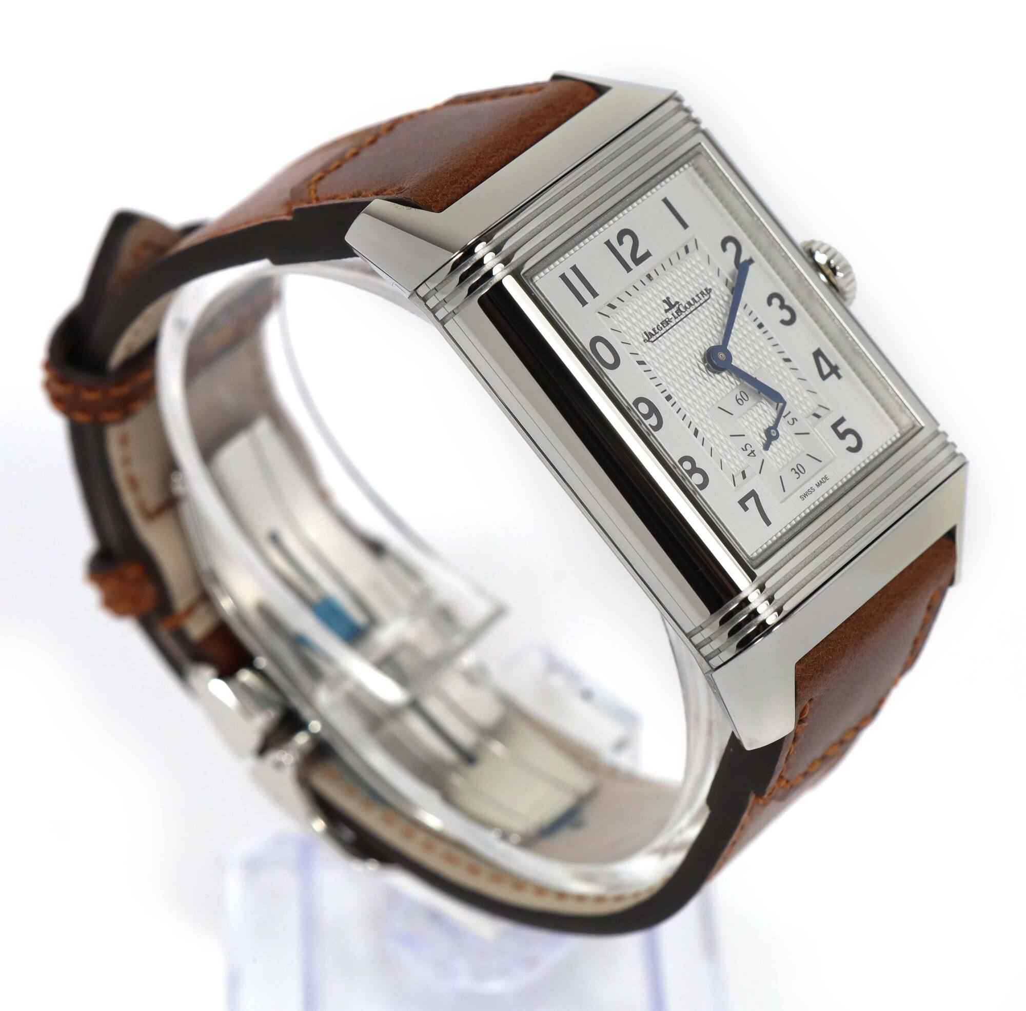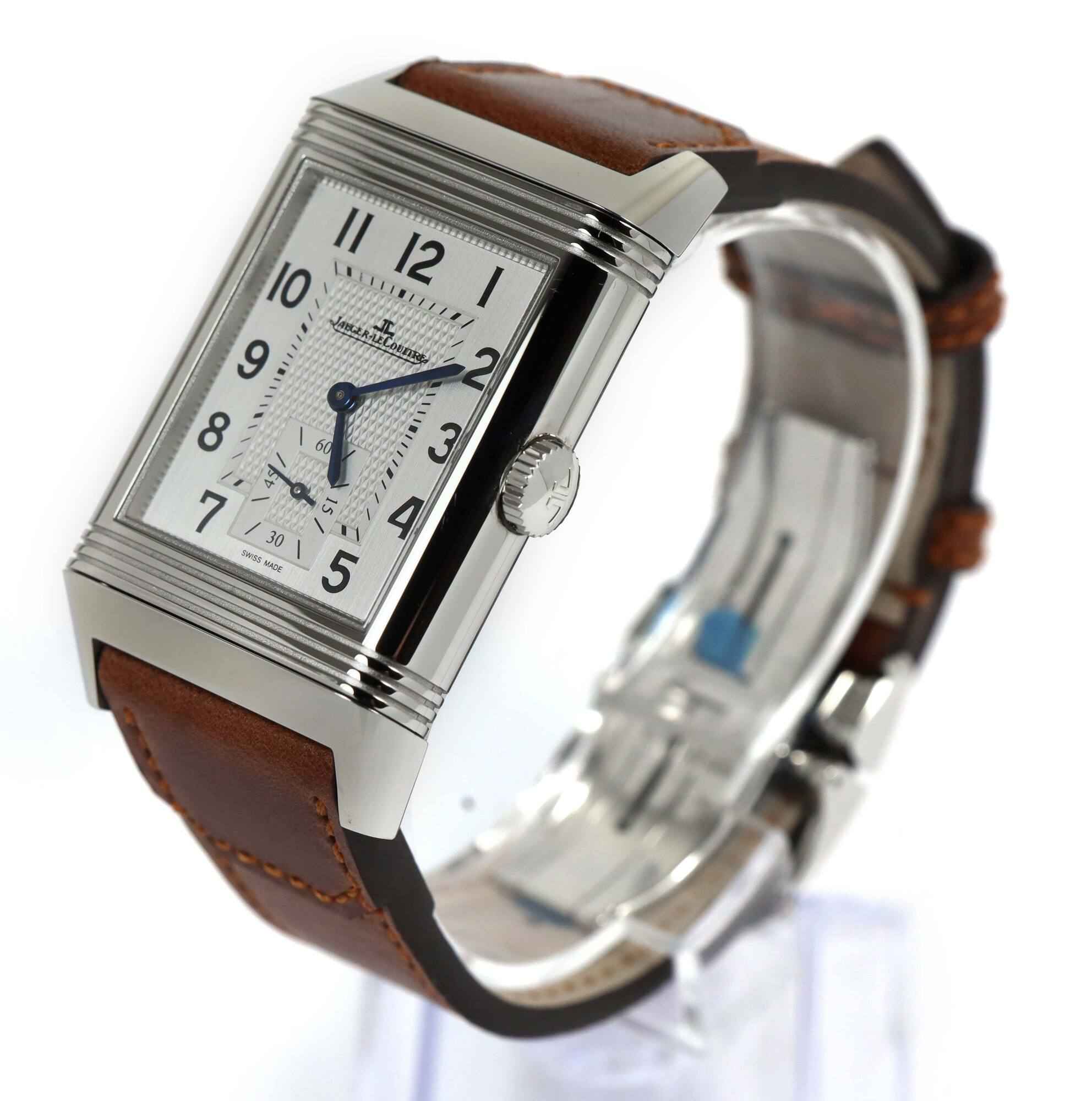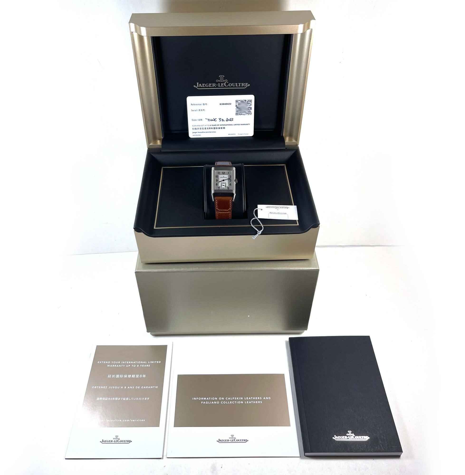 Read Morethis jlc watch is in mint condition with stickers on the caseback/buckle and comes with its box, booklets, hang tag, and warranty card dated june 30th, 2023 as shown in the pictures attached. This watch features a 47mm x 28.3mm stainless steel case that surrounds a silver and black reverso dial and comes on a brand new brown leather strap with a stainless steel deployant buckle. The watch functions include hours, minutes, small seconds and day/night indicator.