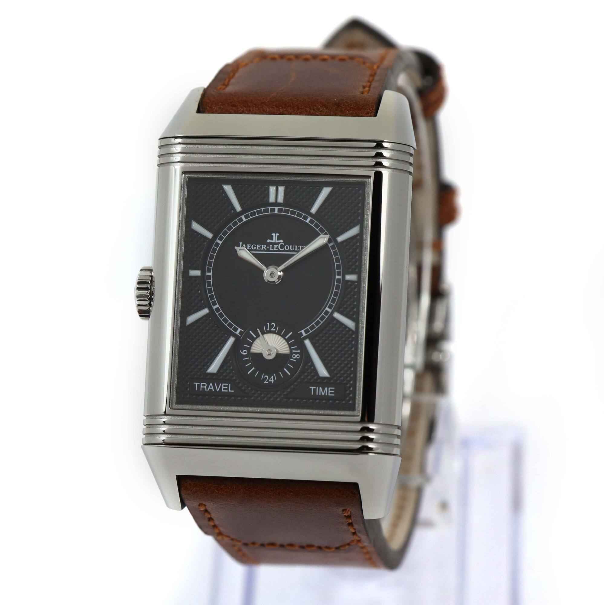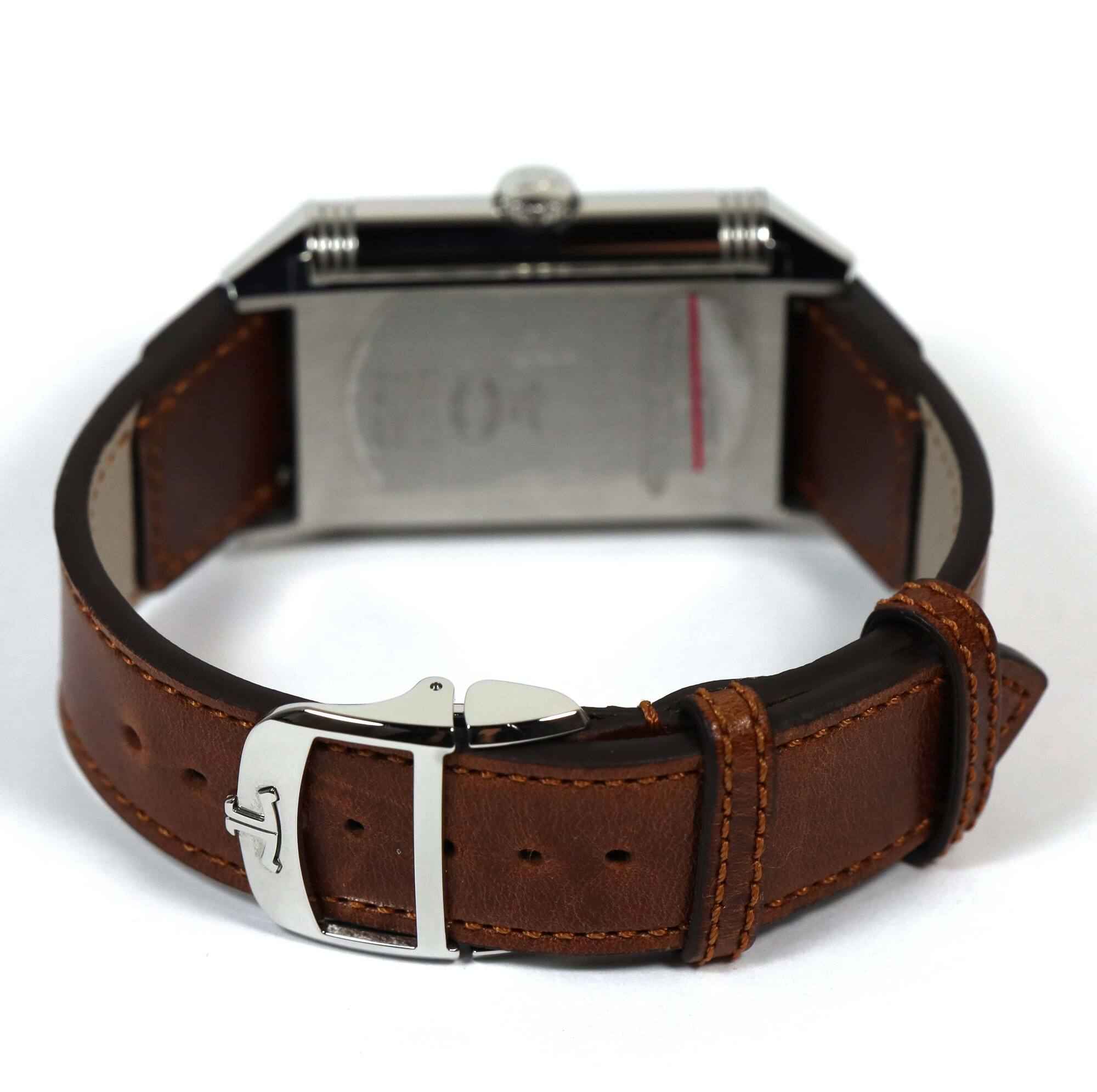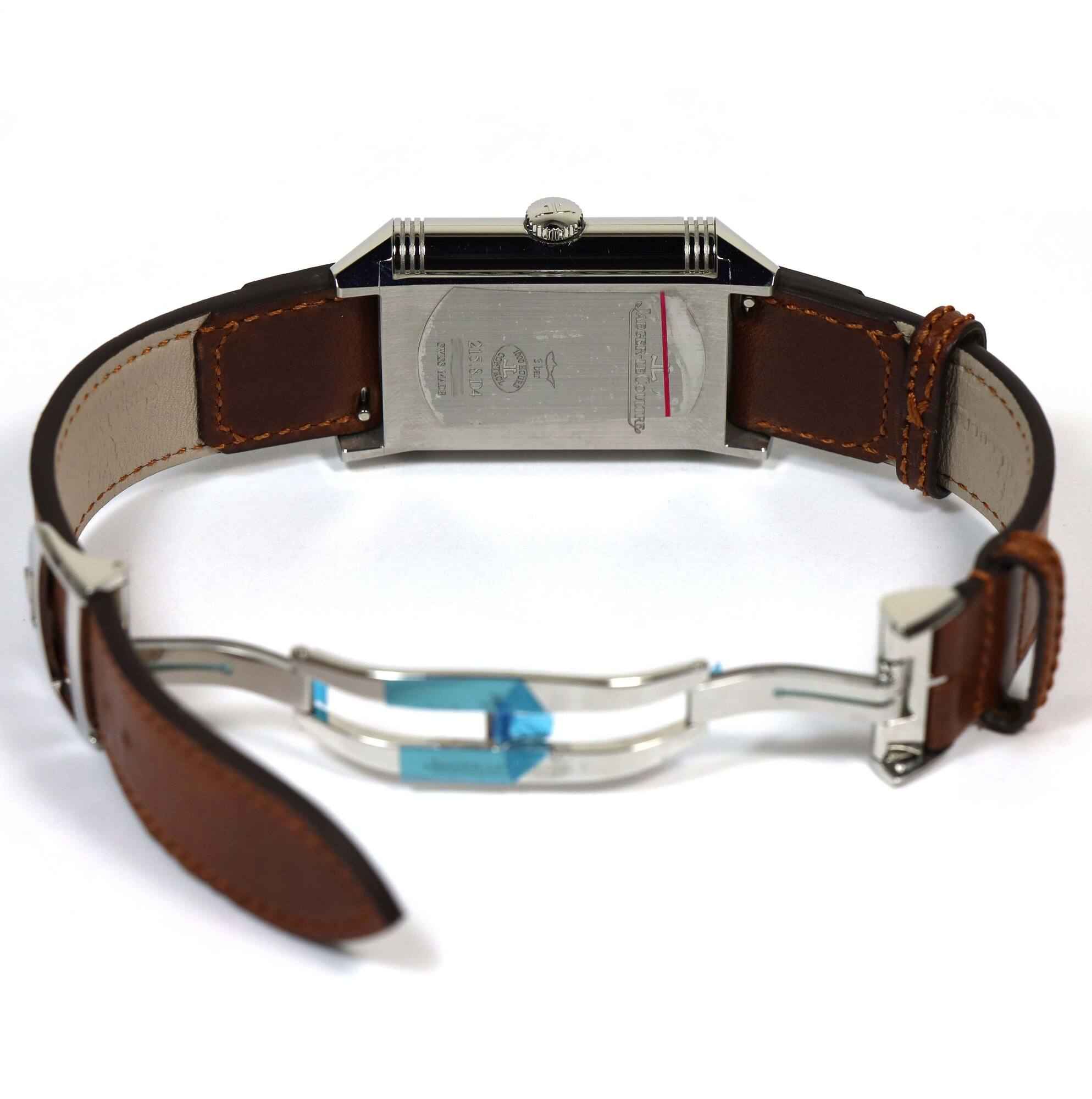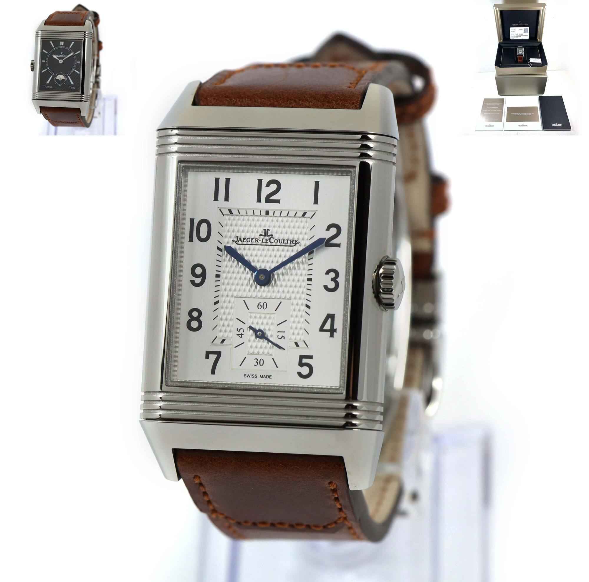 Read Morethis jlc watch is in mint condition with stickers on the caseback/buckle and comes with its box, booklets, hang tag, and warranty card dated june 30th, 2023 as shown in the pictures attached. This watch features a 47mm x 28.3mm stainless steel case that surrounds a silver and black reverso dial and comes on a brand new brown leather strap with a stainless steel deployant buckle. The watch functions include hours, minutes, small seconds and day/night indicator.