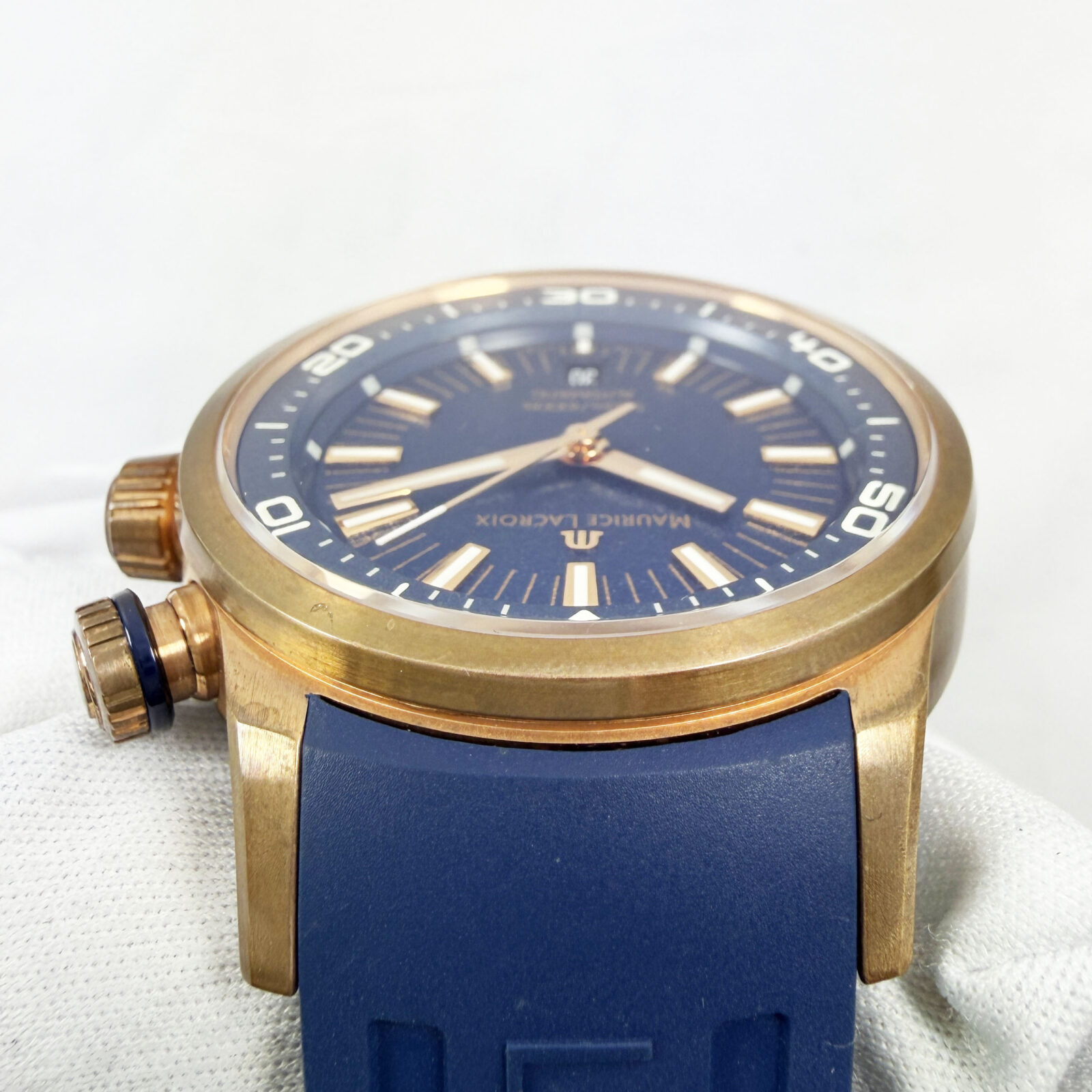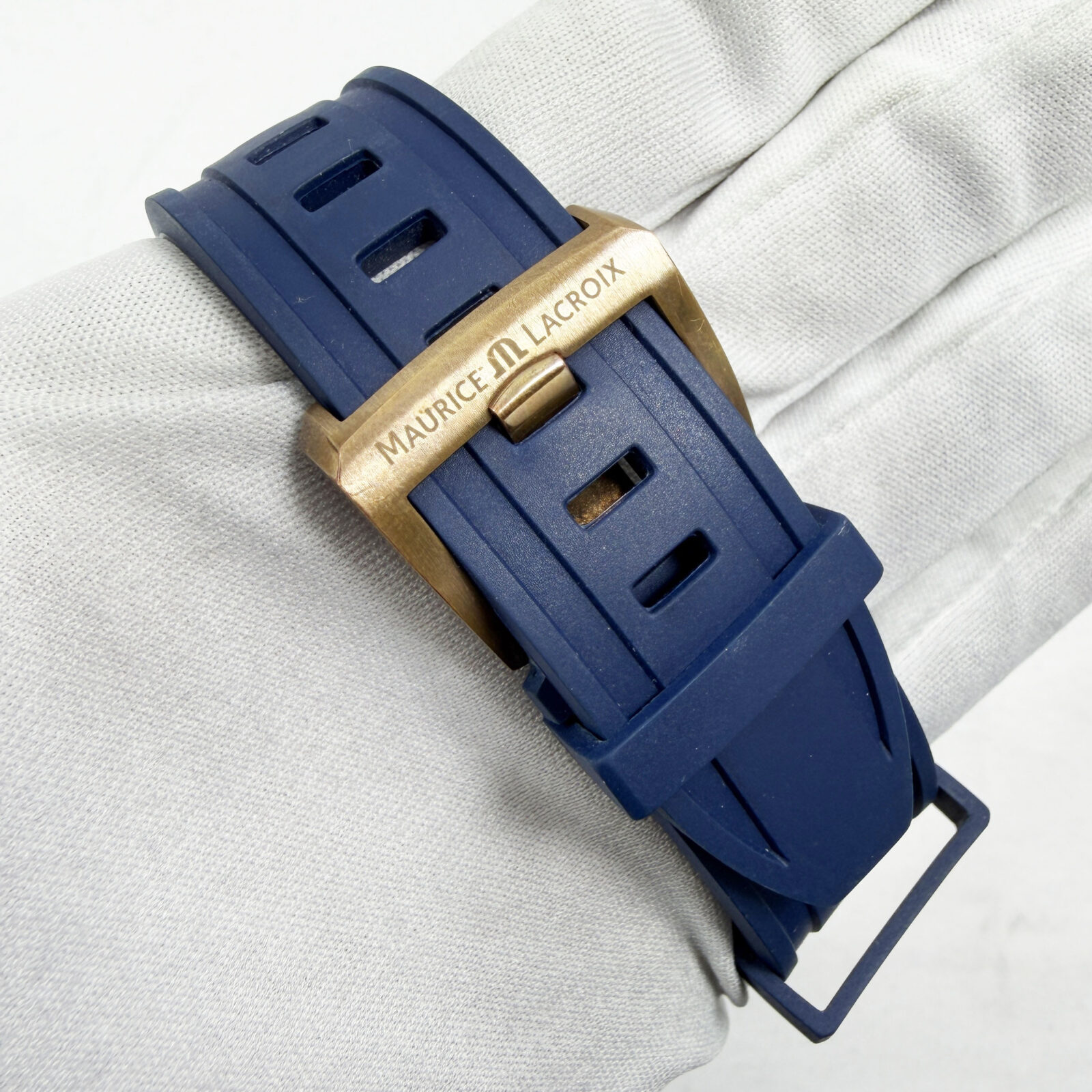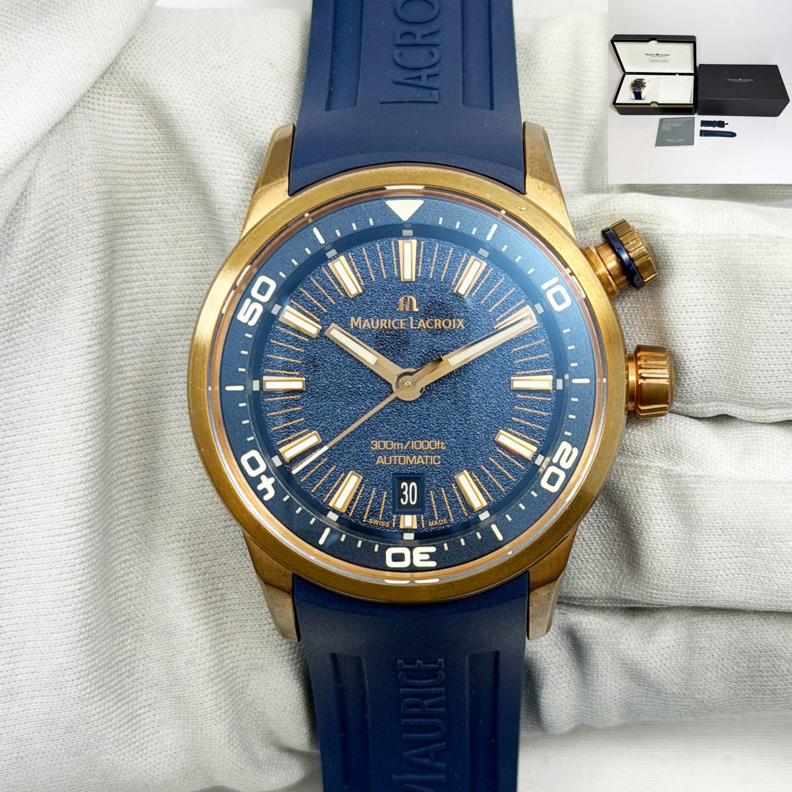 This Maurice Lacroix watch comes with its box, extra straps, and warranty booklet dated August, 2023. The photos shown are of the exact watch being sold and accurately represent its condition. This watch is in stock and ready to ship immediately!