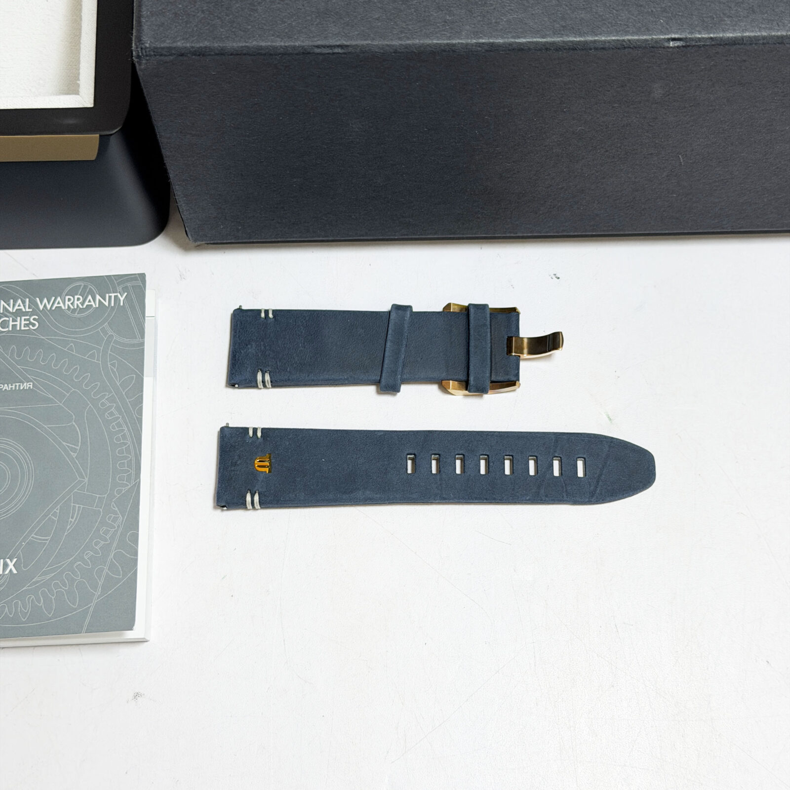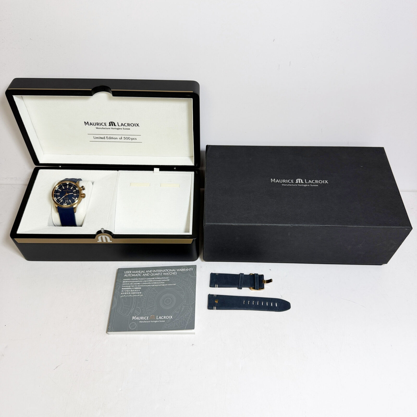 this maurice lacroix watch comes with its box, extra straps, and warranty booklet dated august, 2023. The photos shown are of the exact watch being sold and accurately represent its condition. This watch is in stock and ready to ship immediately!