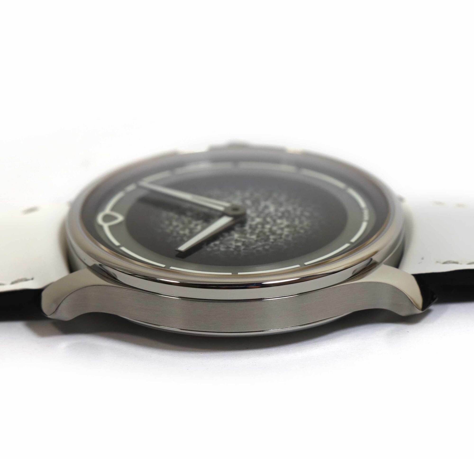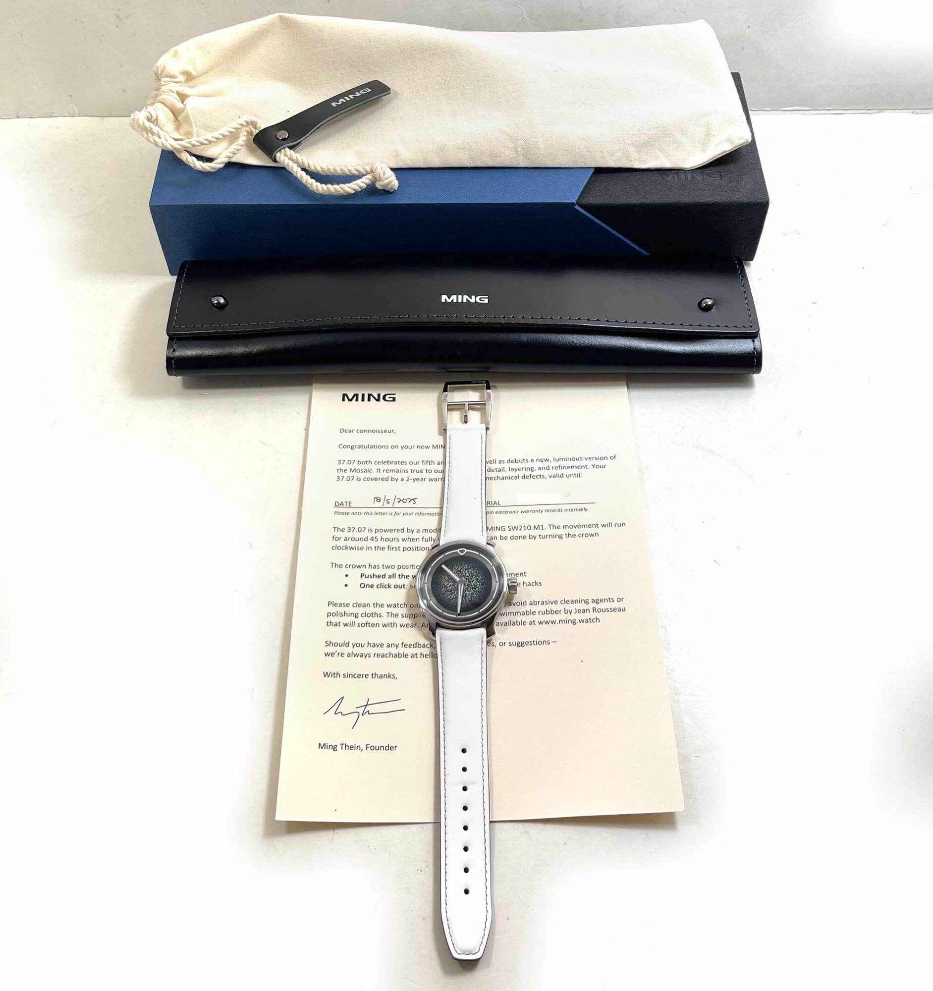 This ming watch is new and comes with its box and warranty paper dated may 18th, 2025 for the 2 year warranty which dates this watch to be from 2023. This ming features a 38mm stainless steel case that surrounds a black mosaic dial and comes on a brand new whi...