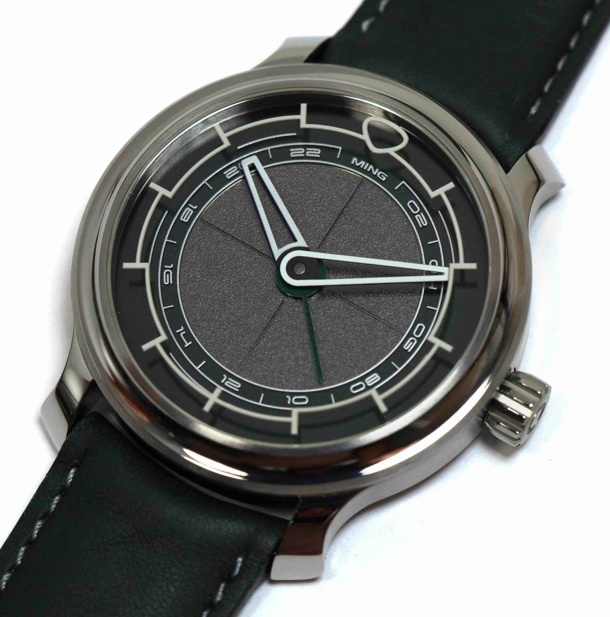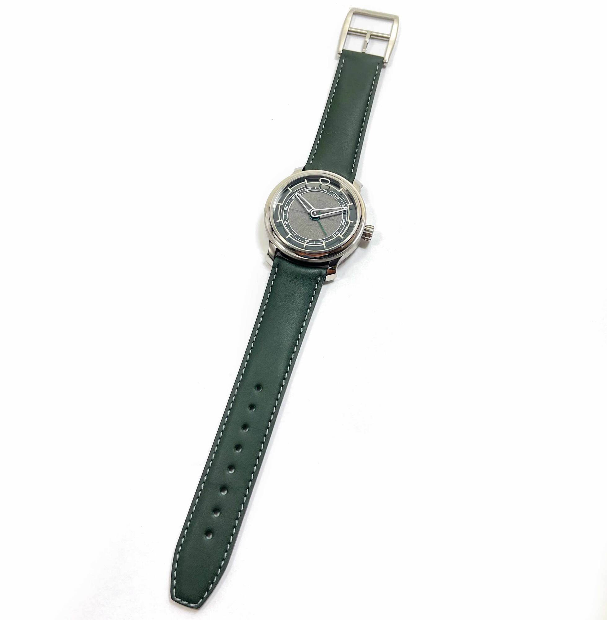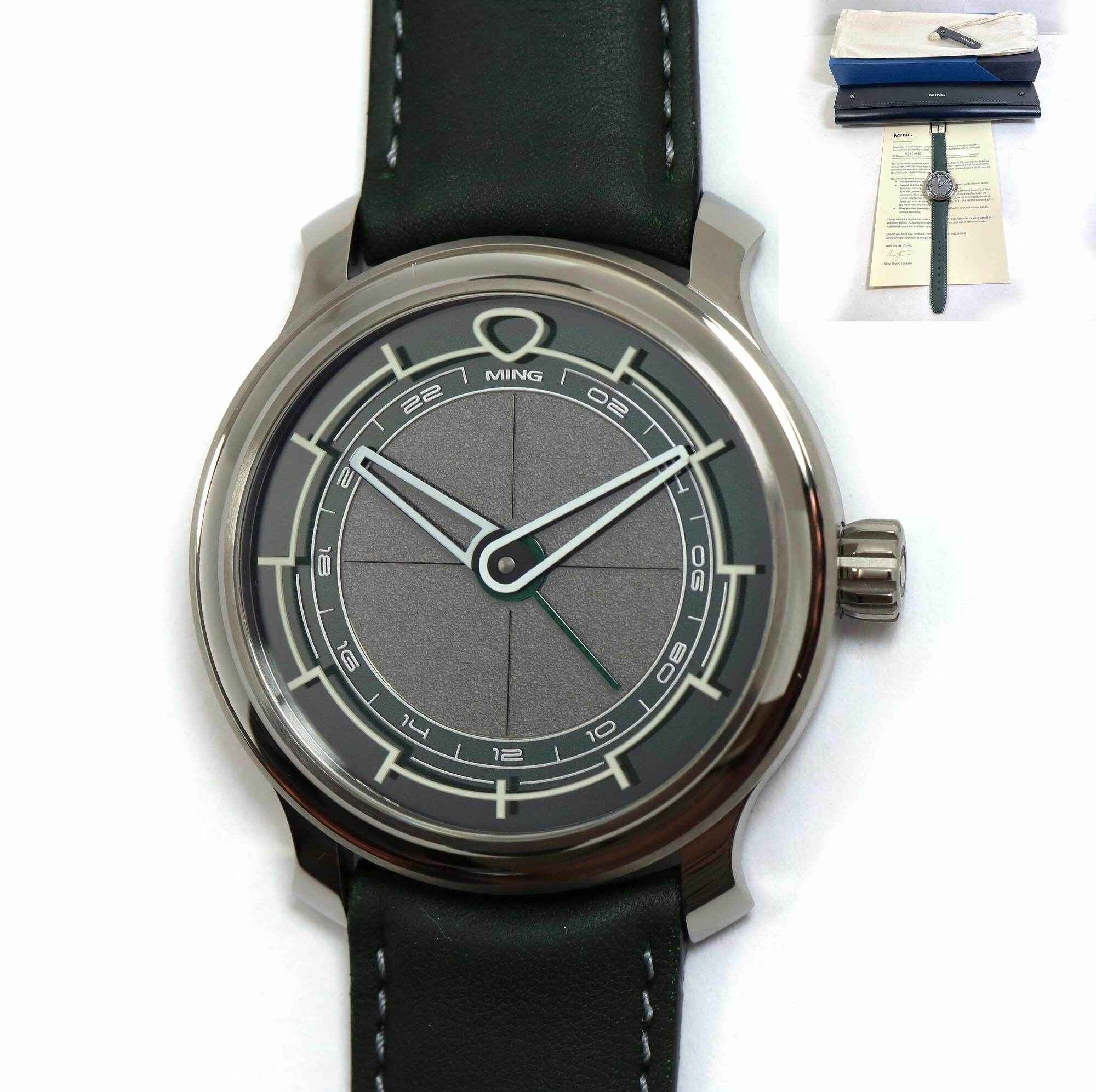 Read Morethis ming watch is new and comes with its box and warranty paper dated august 6th, 2025 for the 2 year warranty which dates this watch to be from 2023. This ming features a 38mm titanium case that surrounds a grey/green dial and comes on a brand new green leather strap. This watch is in stock and available to ship immediately!