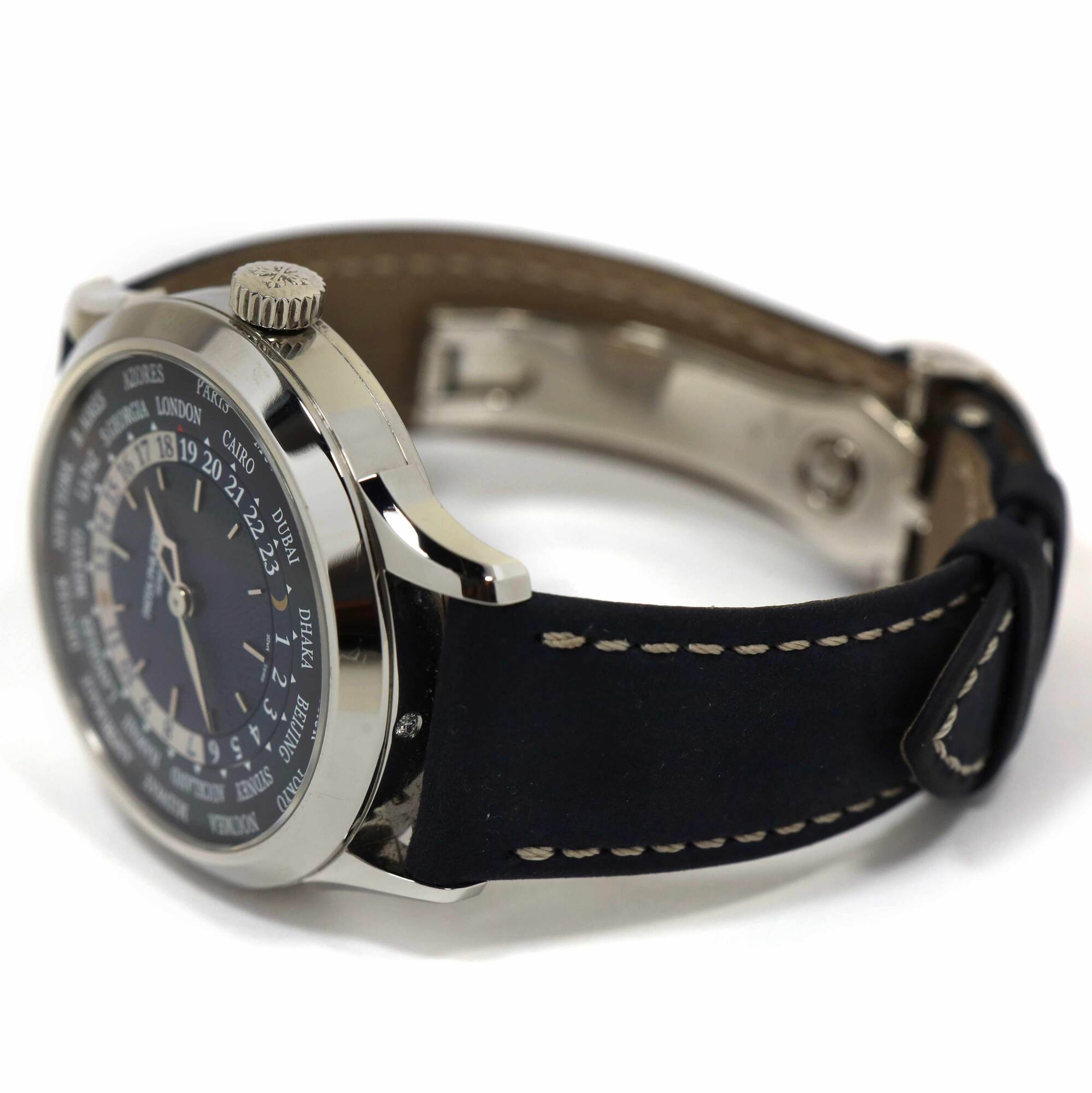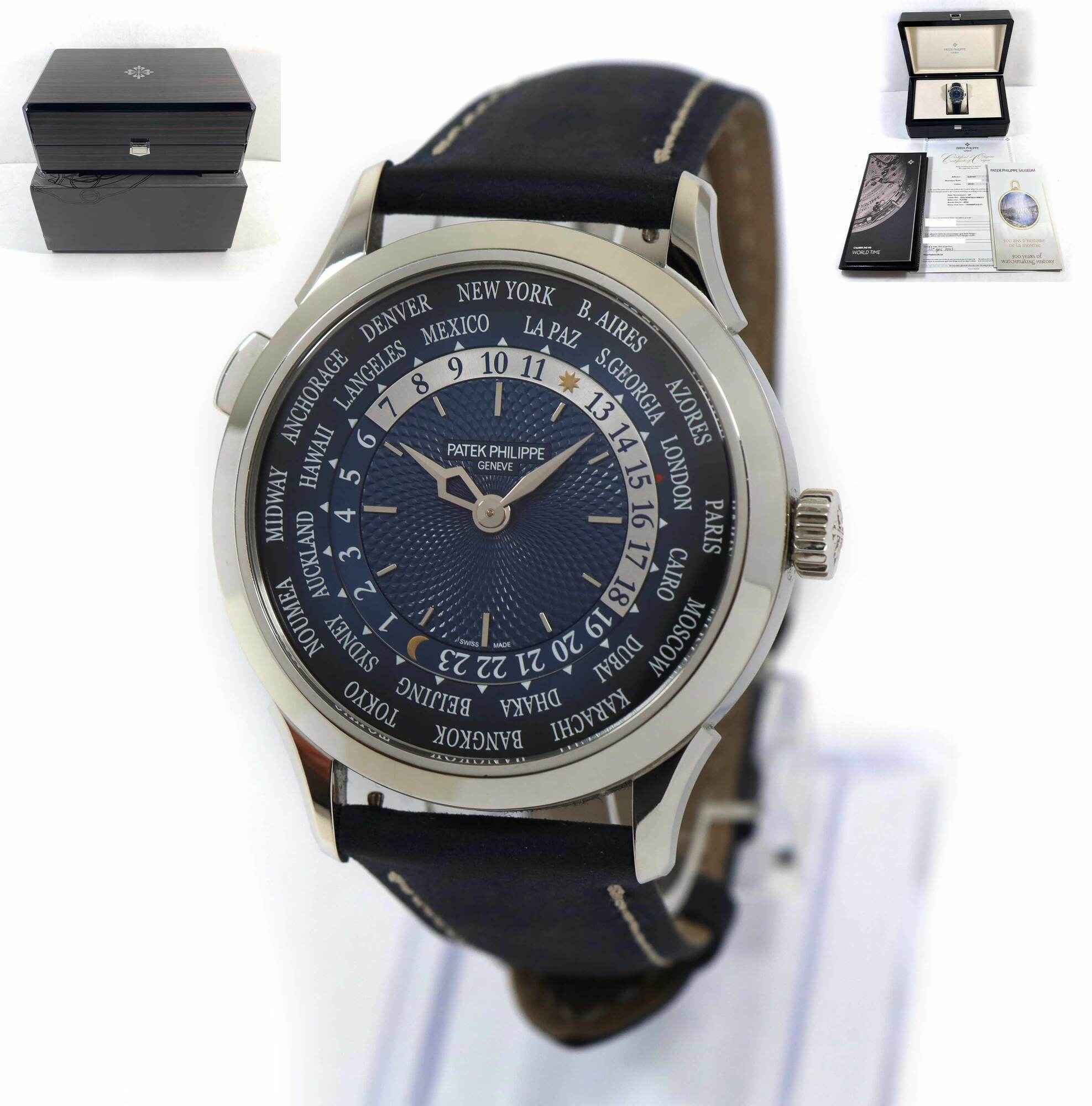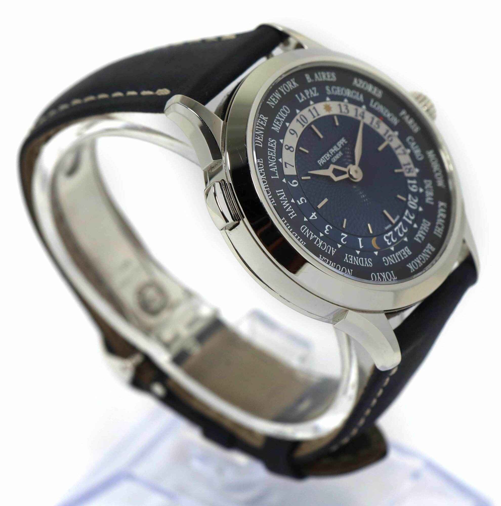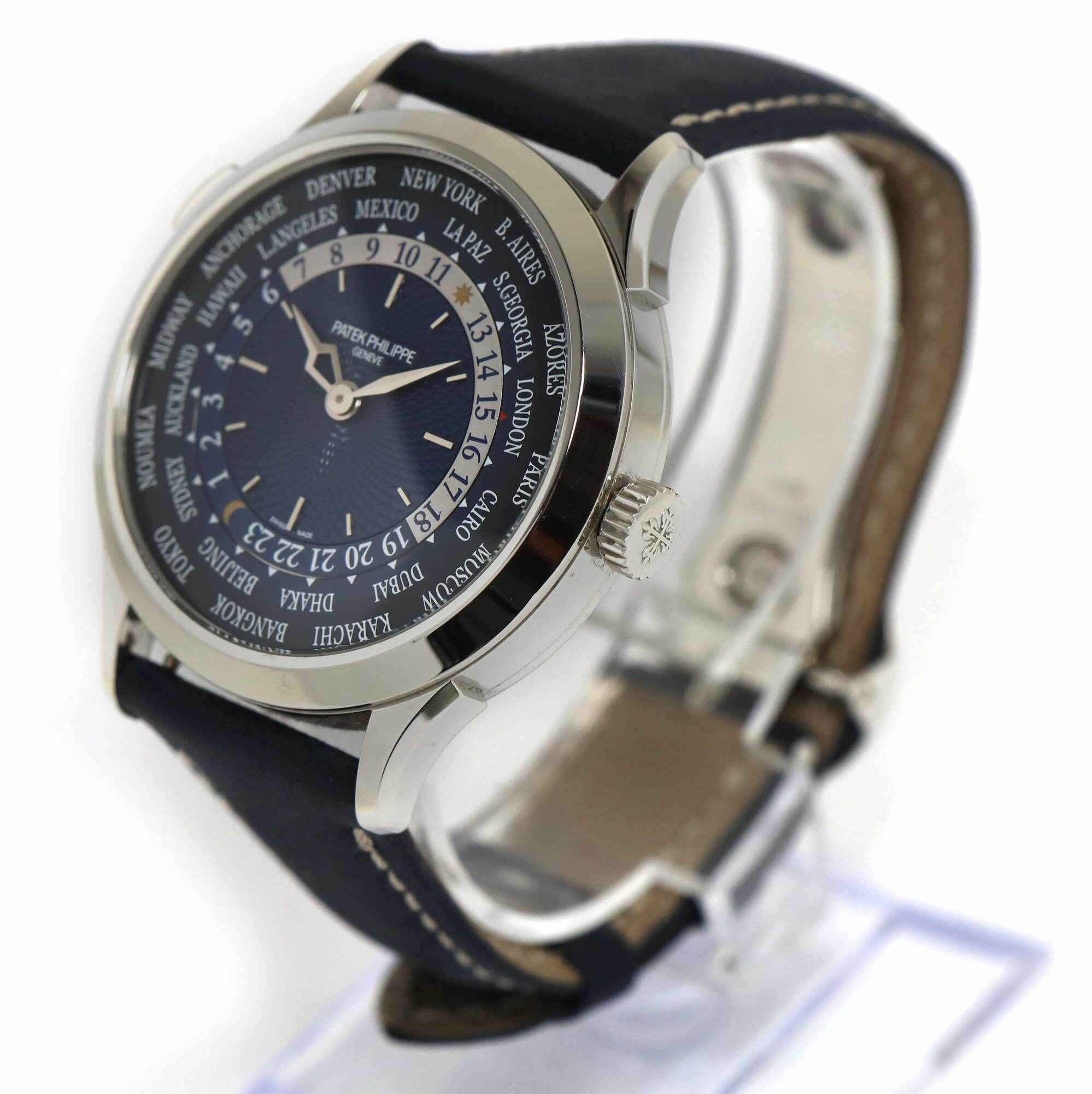 this patek philippe is in excellent overall condition showing some very light signs of surface wear on the case and comes with its box, booklets, and warranty paper dated april 22nd, 2023 as shown in the pictures attached. This watch features a 38.5mm platinum case that surrounds a blue circular patterned dial and comes on a navy blue leather strap with a platinum calatrava cross deployant buckle. The watch functions include hours, minutes and worldtime. This watch is in stock and available to ship immediately!