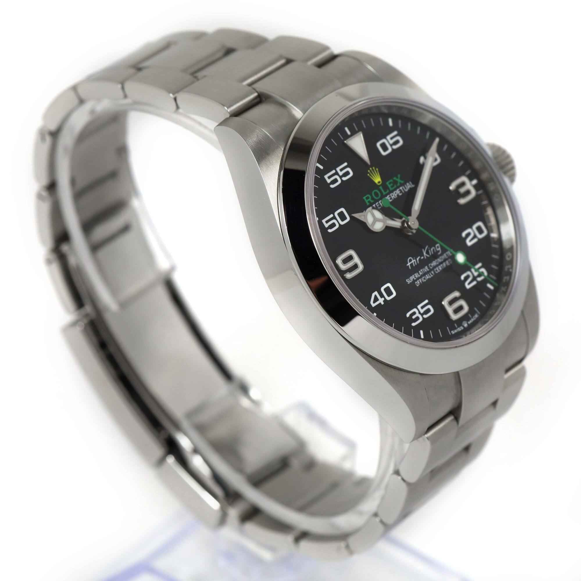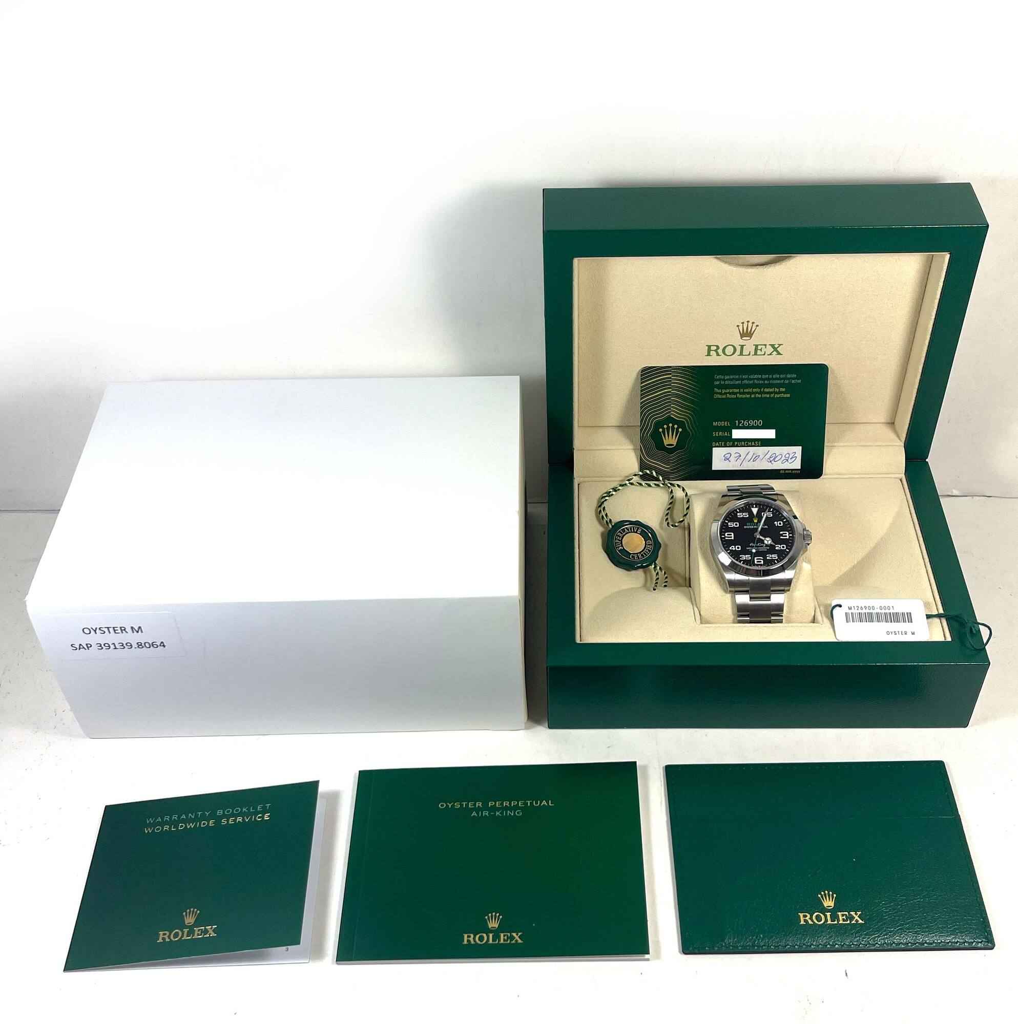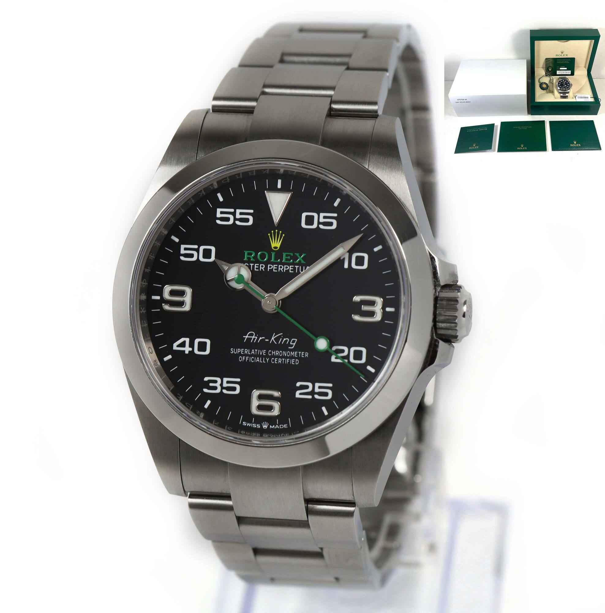 this rolex air-king is in excellent overall condition and comes with its box, booklets, both hang tags, and warranty card dated october 27th, 2023 as shown in the pictures attached. This watch is in stock and available to ship immediately!