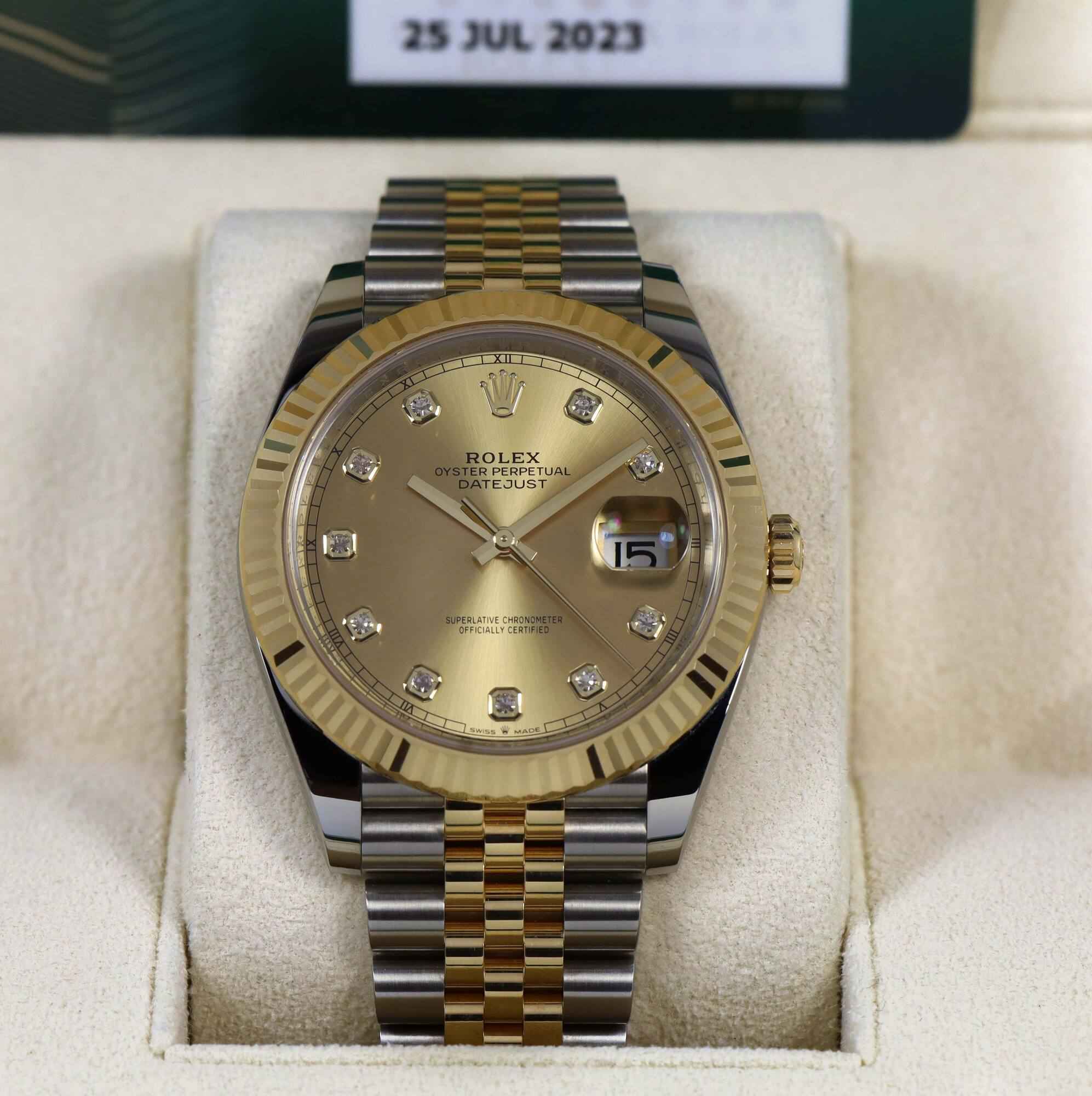 this rolex is in super condition and comes with its box, booklets, hang tags, spare link, and warranty card dated july 25th, 2023. This watch is in stock and available to ship immediately!