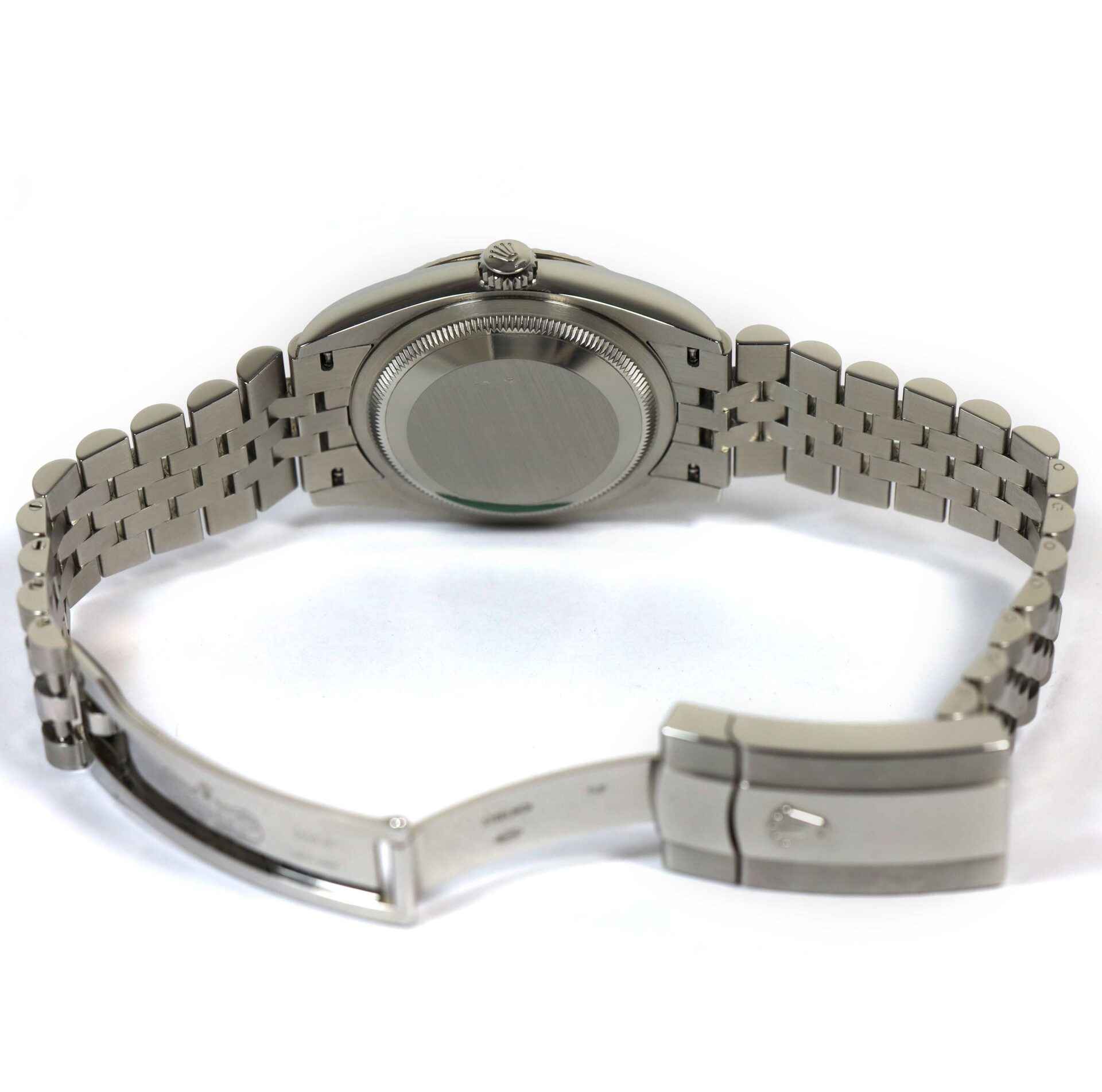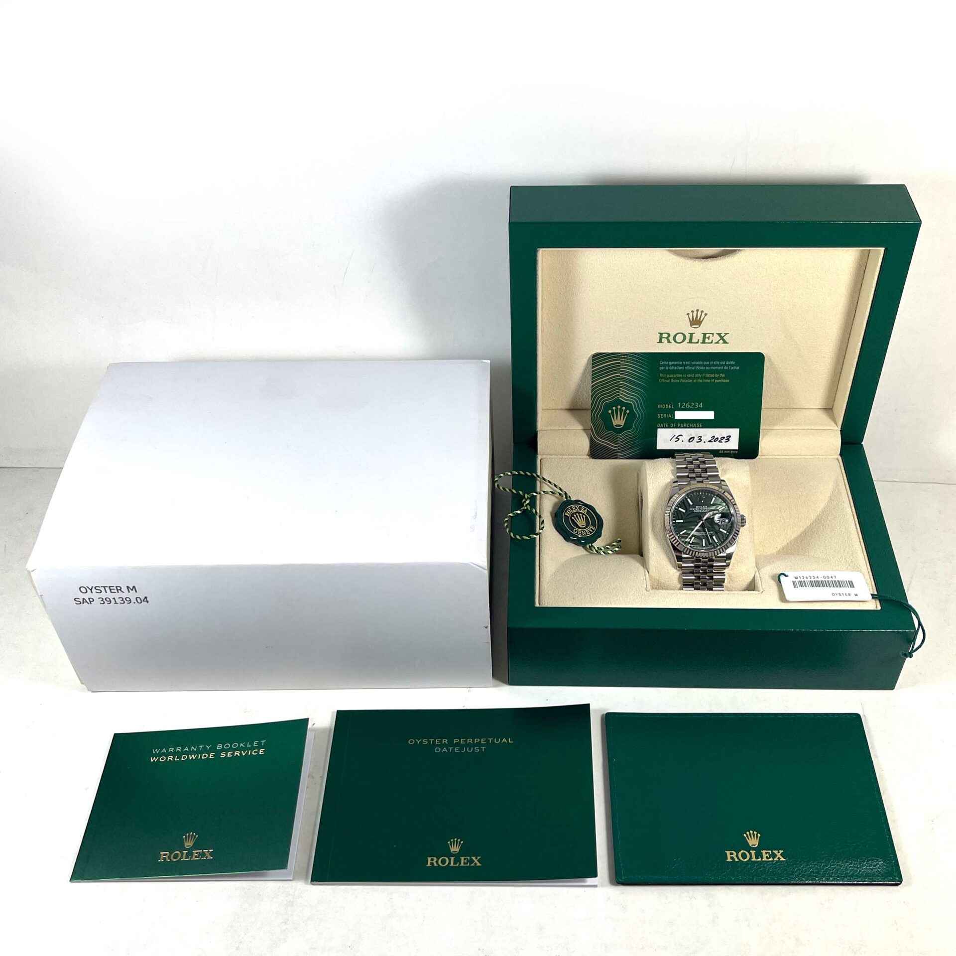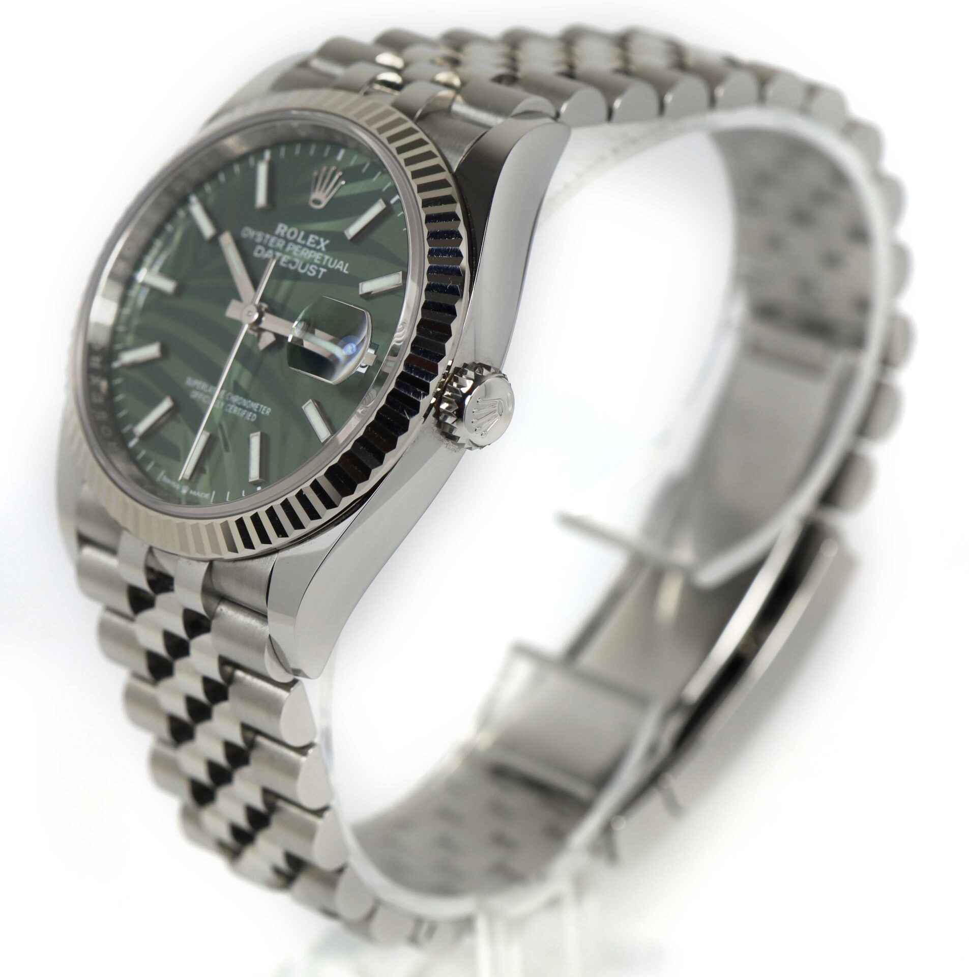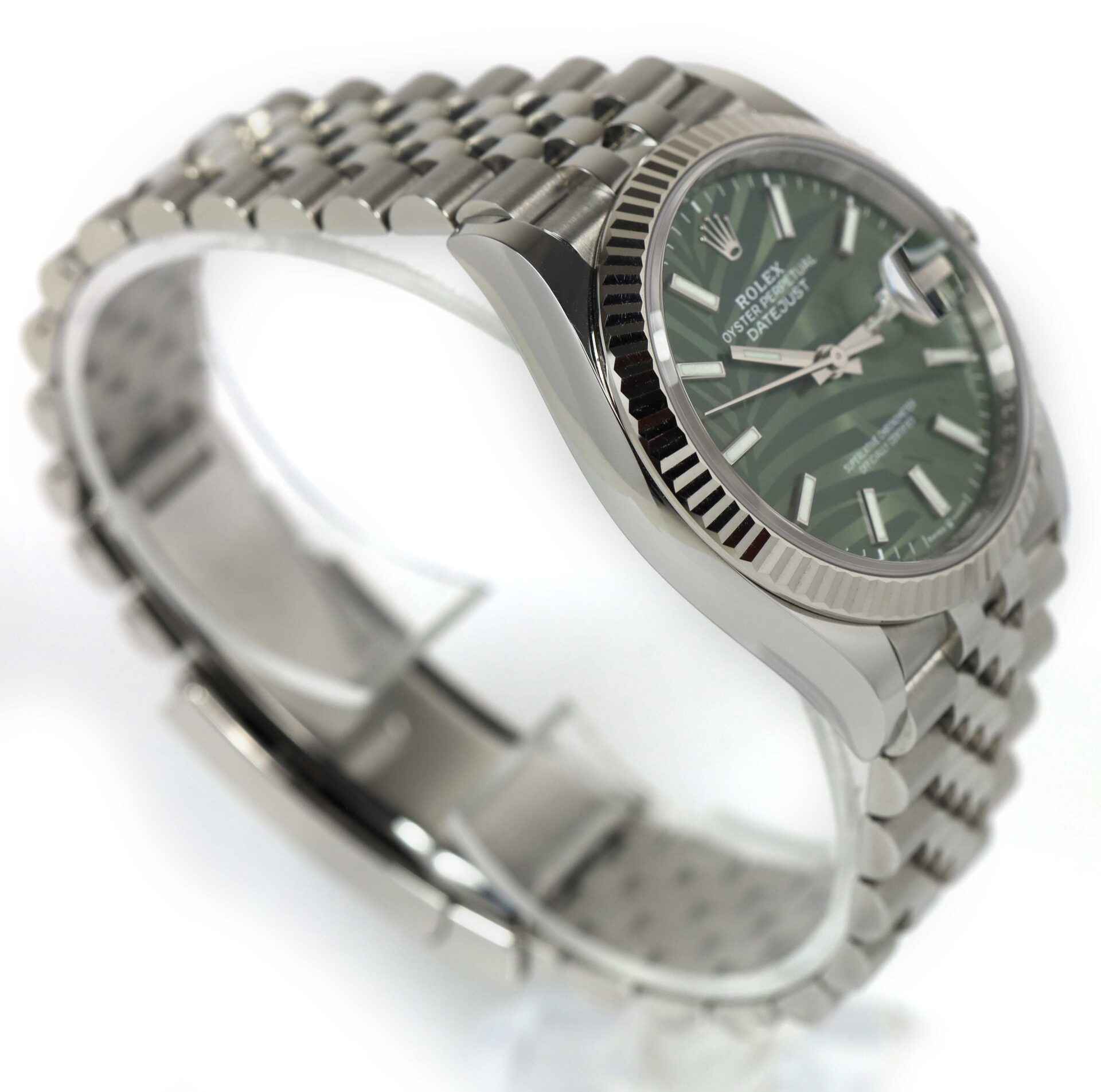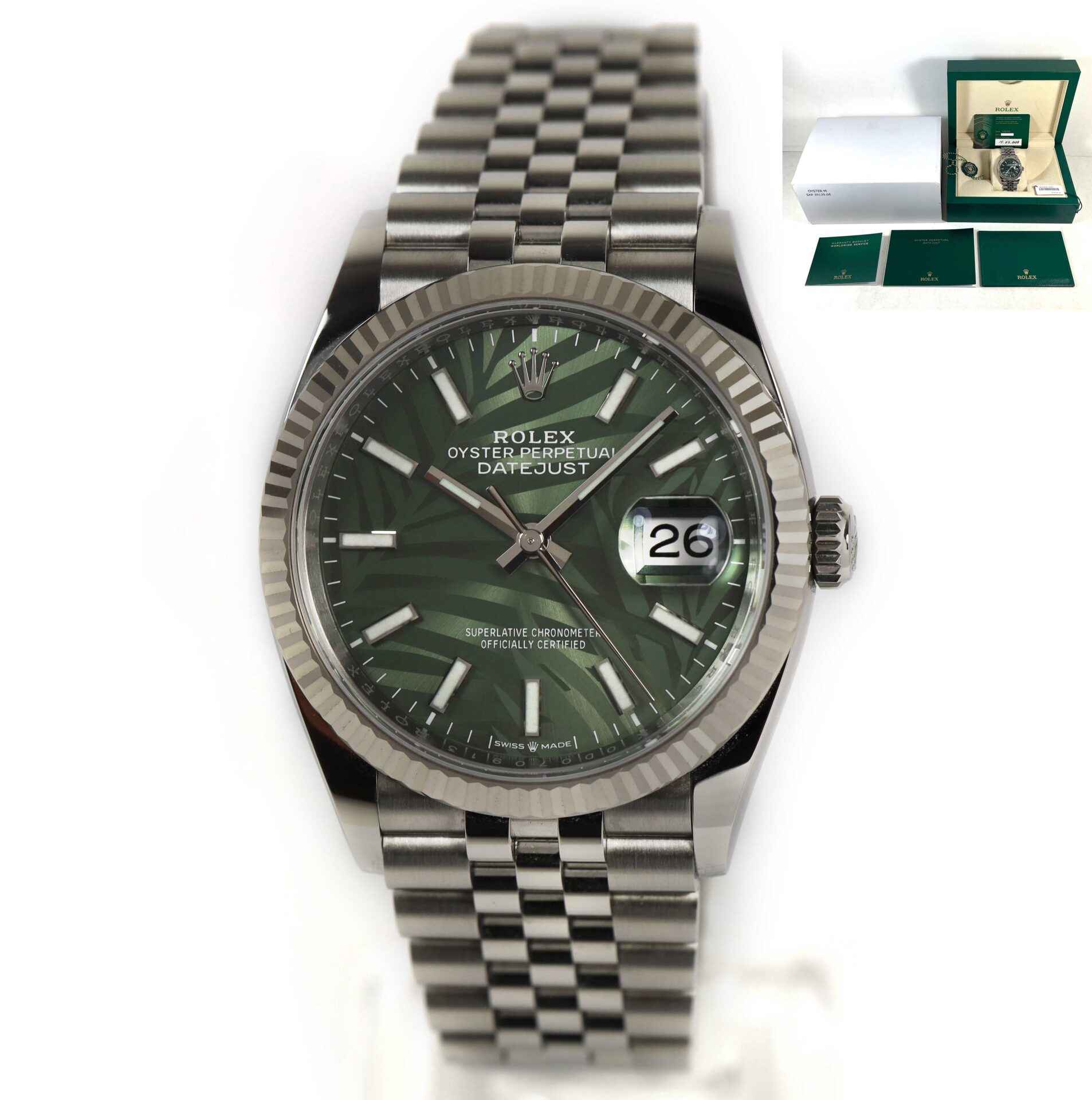 Read Morethis rolex is in excellent condition and comes with its box, papers, hang tags, and warranty card dated march 15th, 2023. This watch features a green motif palm dial with a fluted bezel on a steel jubilee band. This watch is in stock and available to ship immediately!