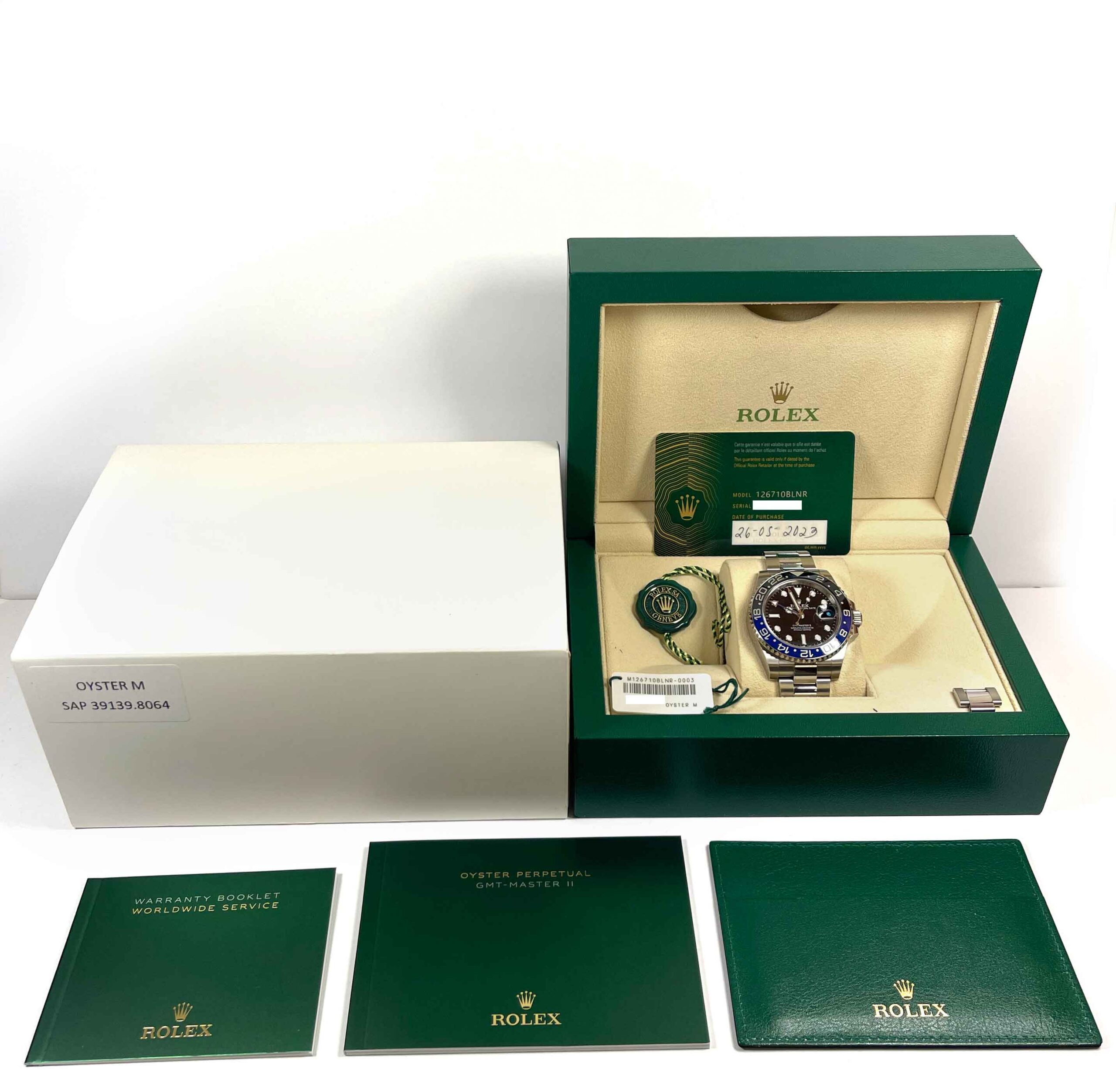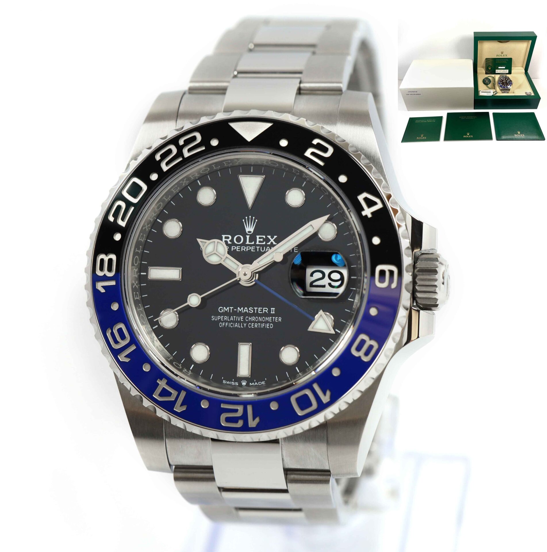 THIS ROLEX BATMAN IS IN EXCELLENT CONDITION AND COMES WITH ITS BOX, BOOKLETS, BOTH HANG TAGS, ONE SPARE LINK, AND WARRANTY CARD DATED MAY 26TH, 2023 AS SHOWN IN THE PICTURES ATTACHED. THIS WATCH IS IN STOCK AND AVAILABLE TO SHIP IMMEDIATELY!