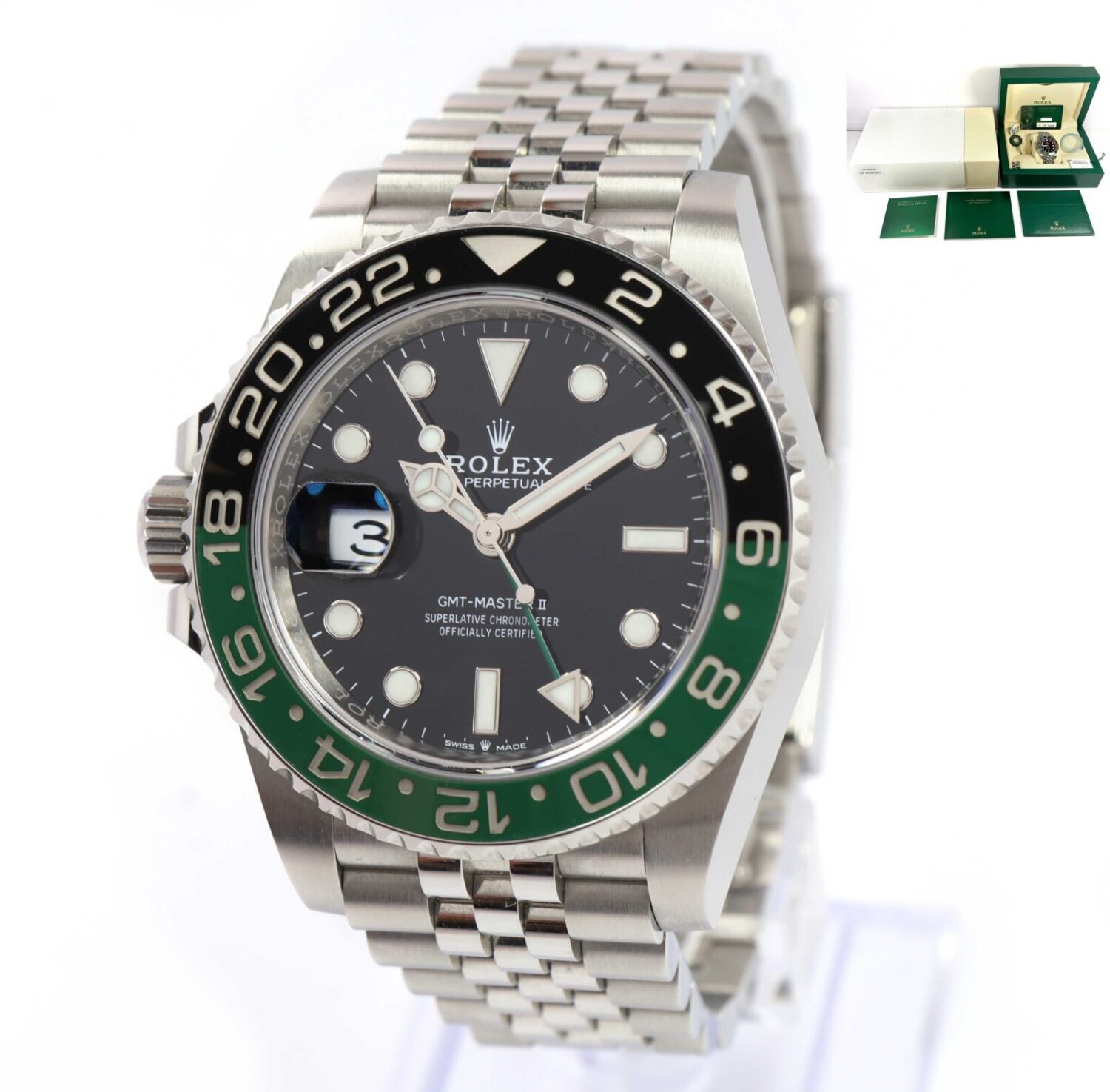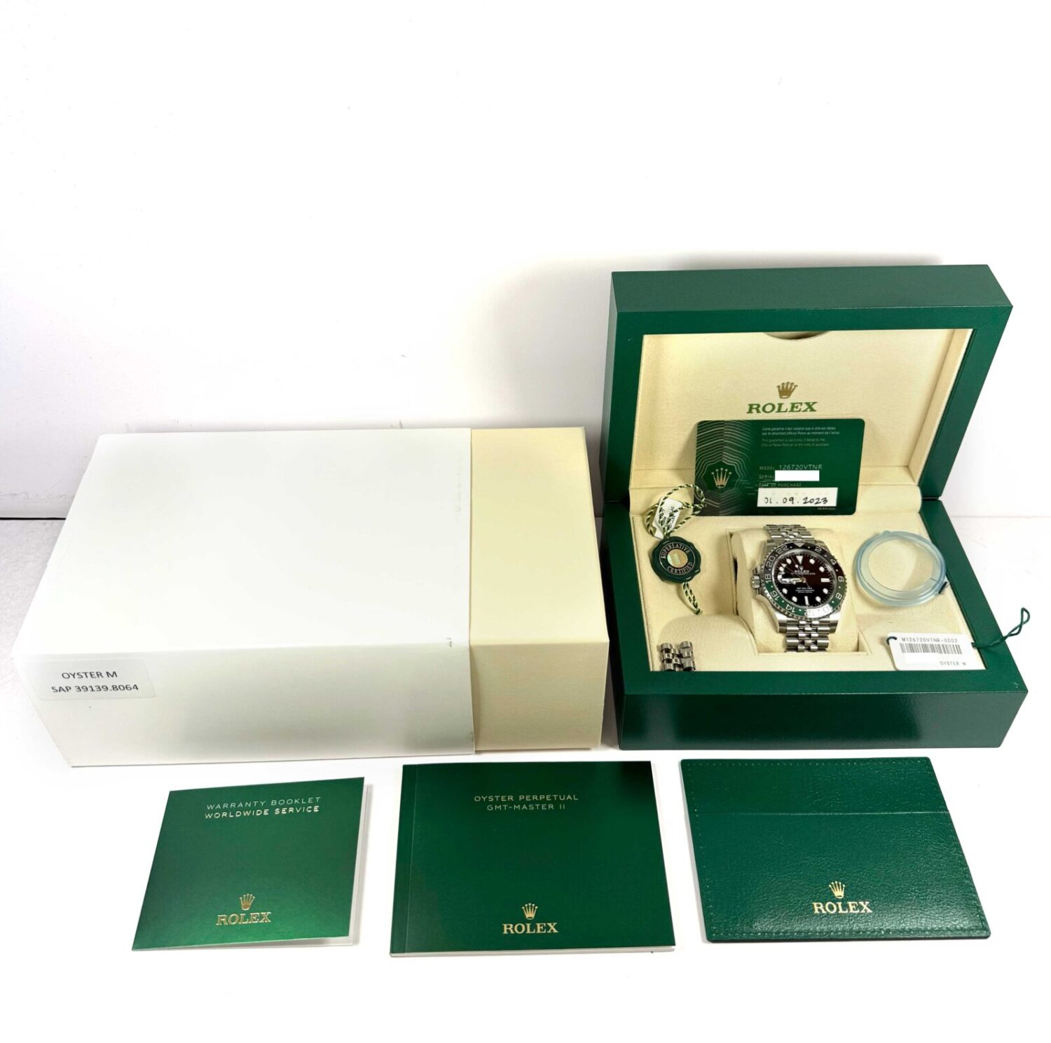 this rolex is in excellent condition and comes with its box, booklets, hang tags, bezel protector, spare links, and warranty card dated september 1st, 2023 as shown in the pictures attached. This watch is in stock and available to ship immediately!