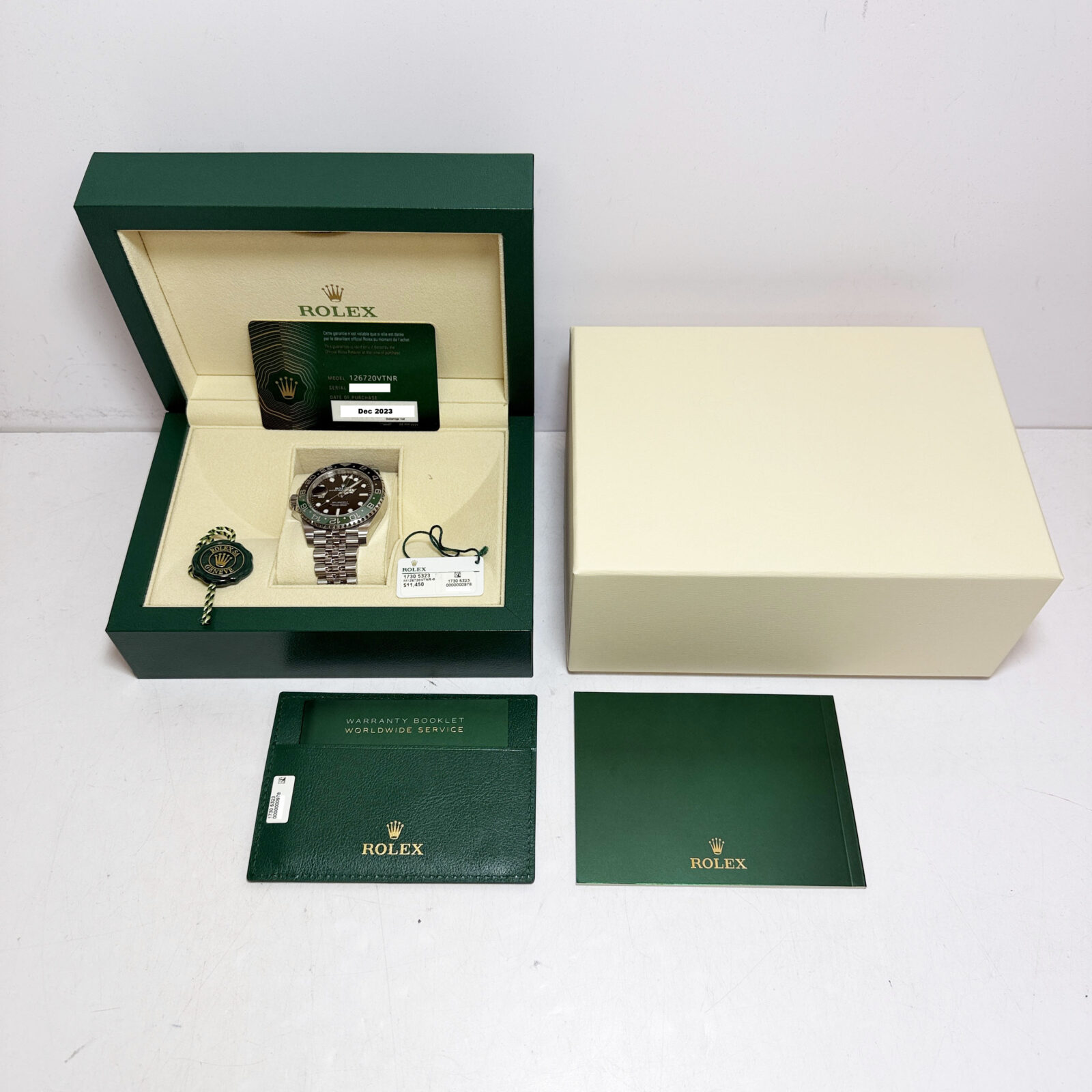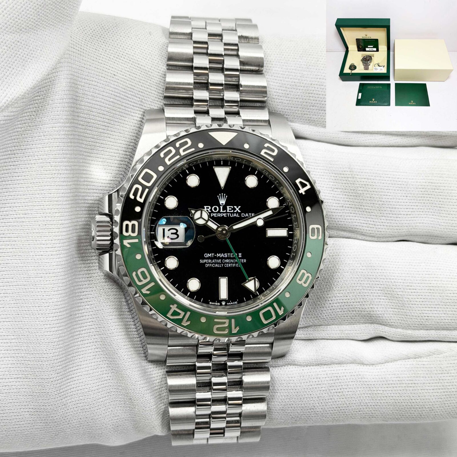 This Rolex GMT-Master II watch comes with its box, booklets, hangtags, and warranty card dated December, 2023. The photos shown are of the exact watch being sold and accurately represent its condition. This watch is in stock and ready to ship immediately!