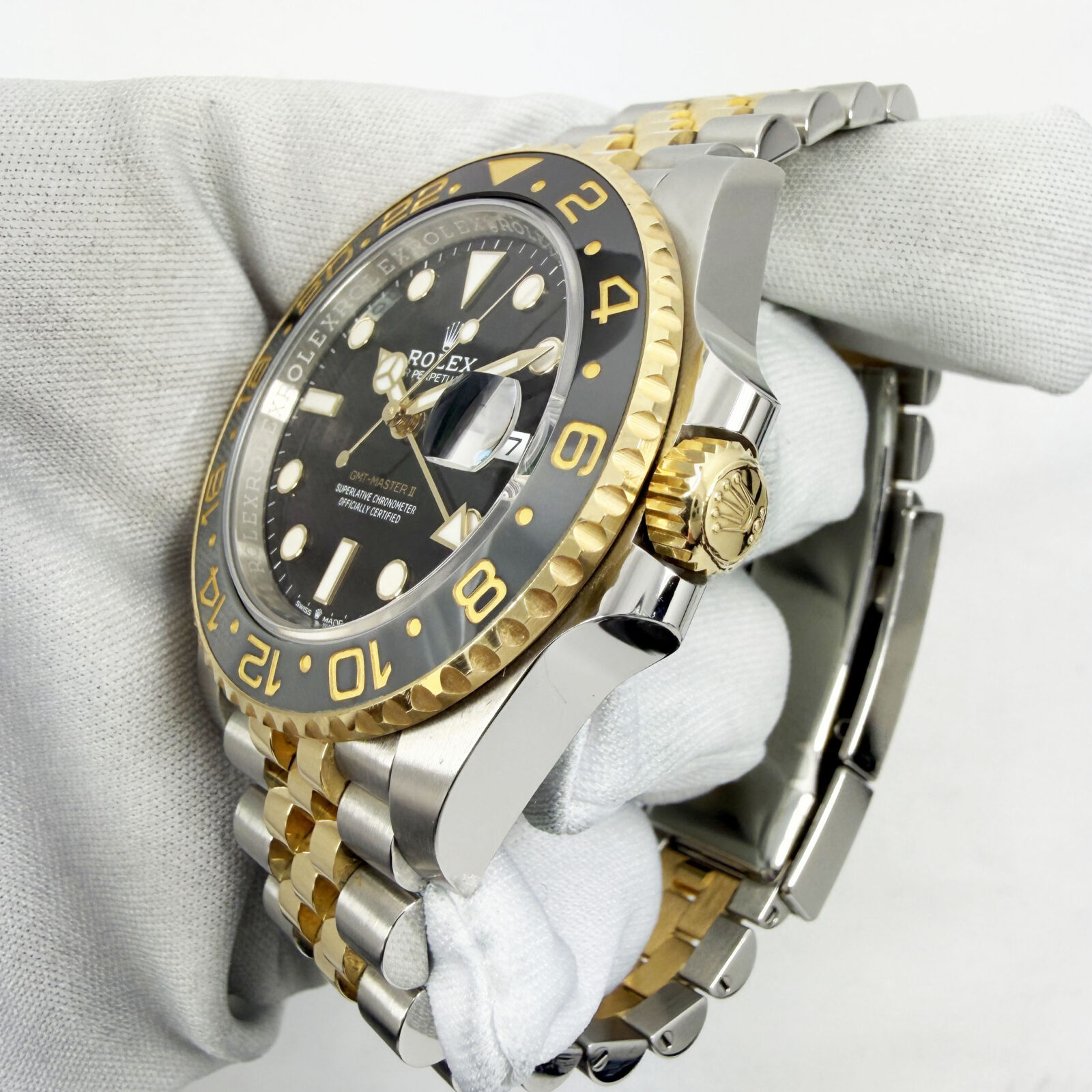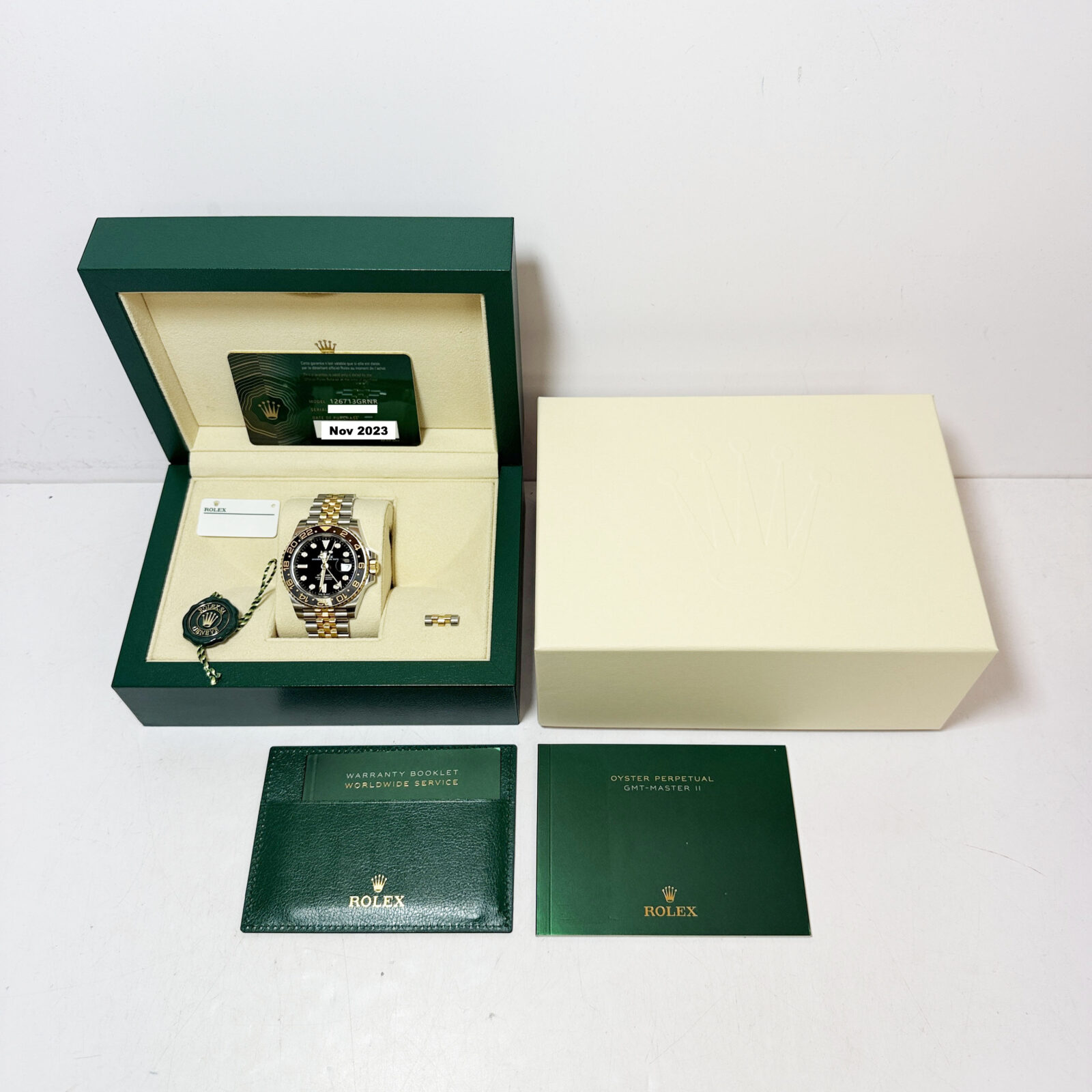 This Rolex GMT-Master II watch comes with its box, hangtags, booklets, extra link, and warranty card dated November, 2023. The photos shown are of the exact watch being sold and accurately represent its condition. This watch is in stock and ready to ship immed...