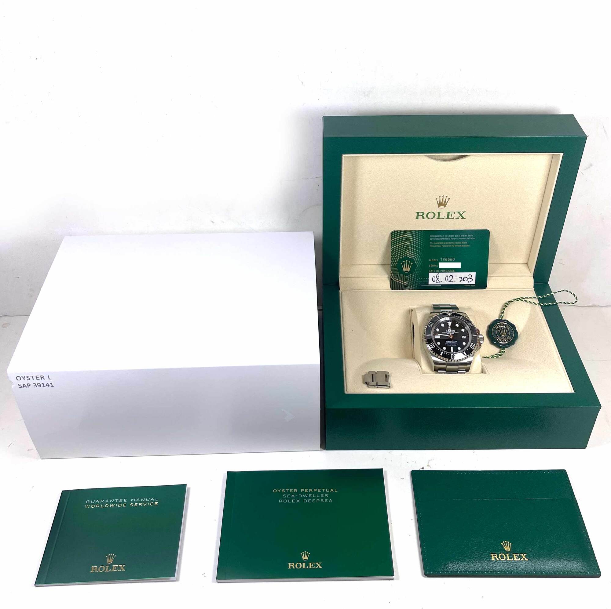 THIS ROLEX IS IN EXCELLENT CONDITION AND COMES WITH ITS BOX, BOOKLETS, GREEN HANG TAG, SPARE LINKS, AND WARRANTY CARD FEBRUARY 8TH, 2023 AS SHOWN IN THE PICTURES ATTACHED. THIS WATCH IS IN STOCK AND AVAILABLE TO SHIP IMMEDIATELY!