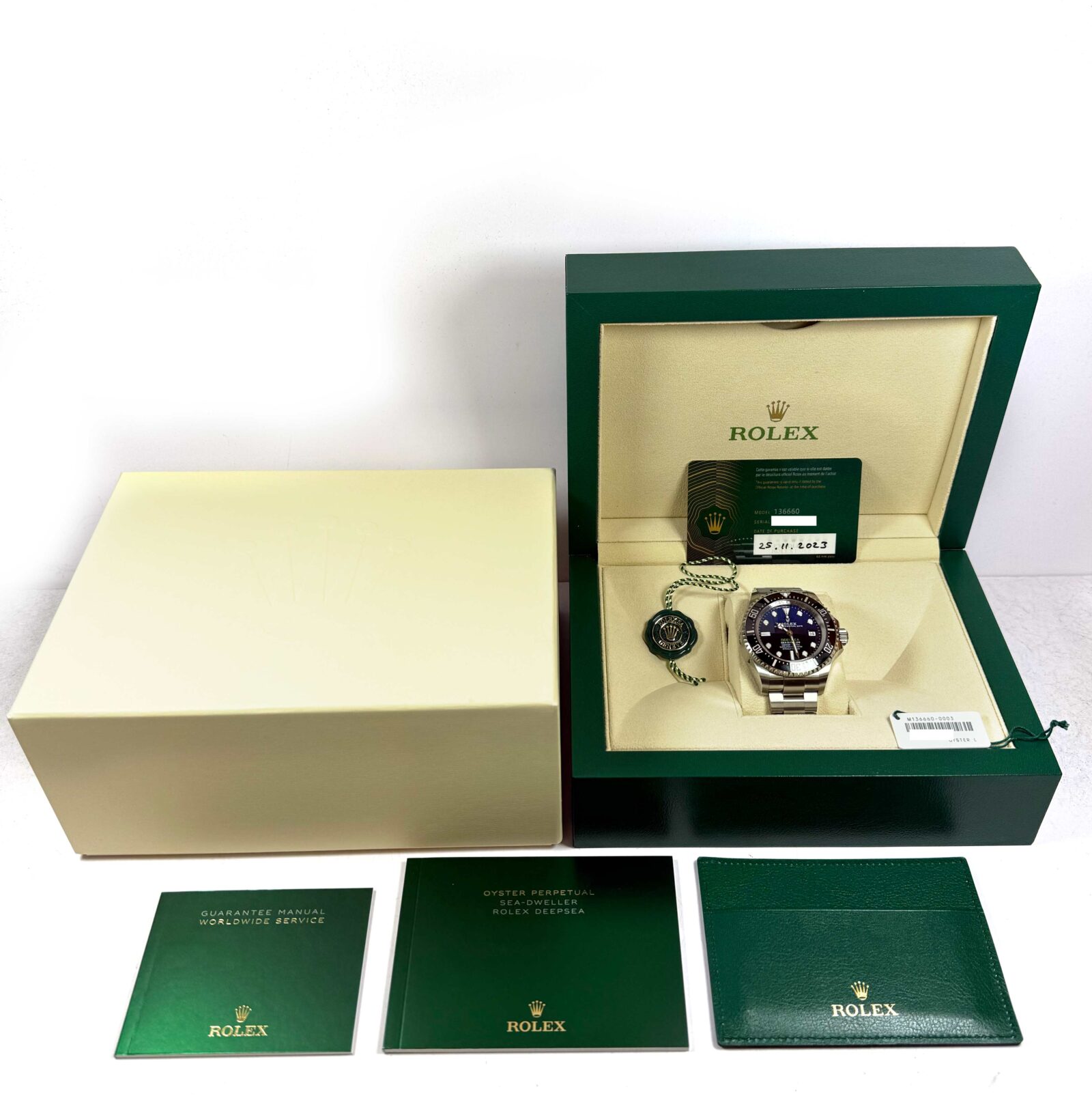 this rolex watch is in excellent overall condition and comes with its box, booklets, hang tags, and warranty card dated november 25th, 2023 as shown in the pictures attached. This watch is in stock and available to ship immediately!