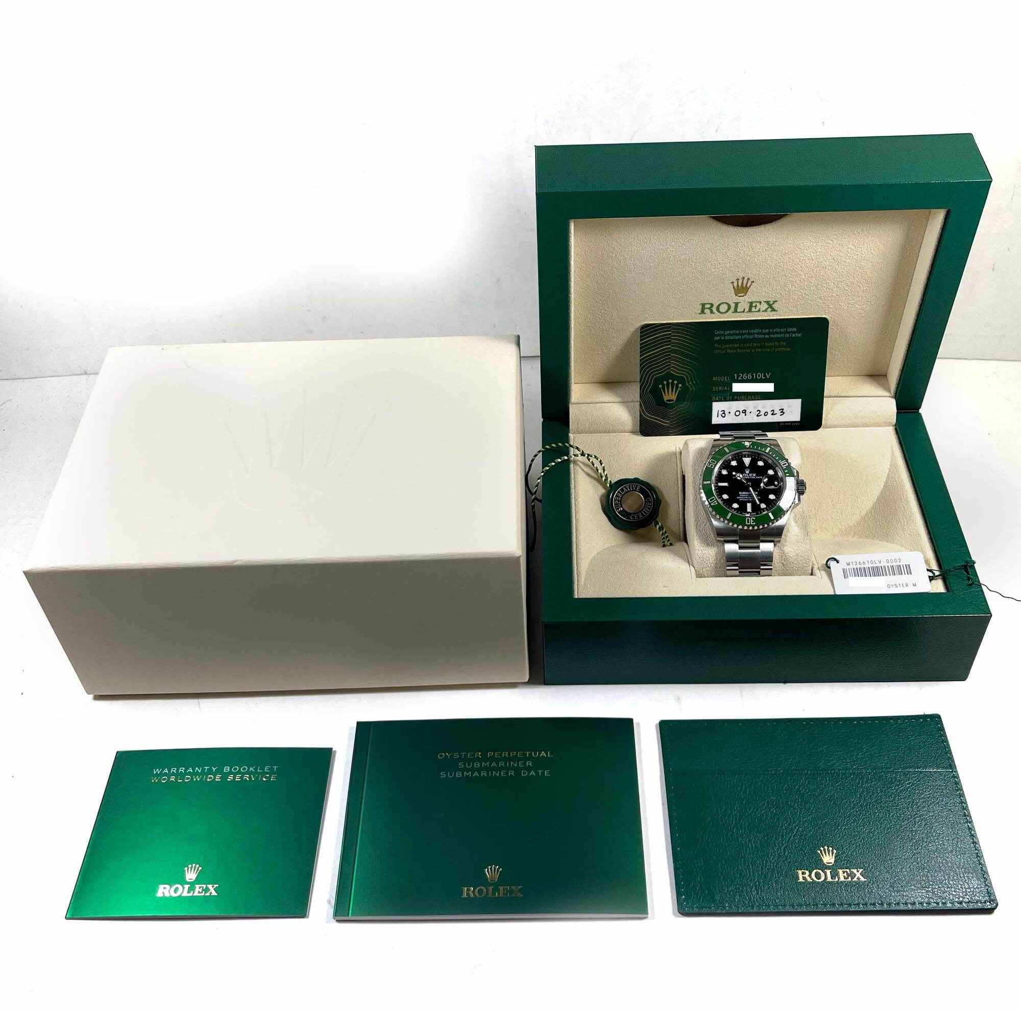 THIS ROLEX IS IN EXCELLENT CONDITION AND COMES WITH ITS BOX, BOOKLETS, HANG TAGS, AND WARRANTY CARD DATED SEPTEMBER 13TH, 2023 AS SHOWN IN THE PICTURES ATTACHED. THIS WATCH IS IN STOCK AND AVAILABLE TO SHIP IMMEDIATELY!