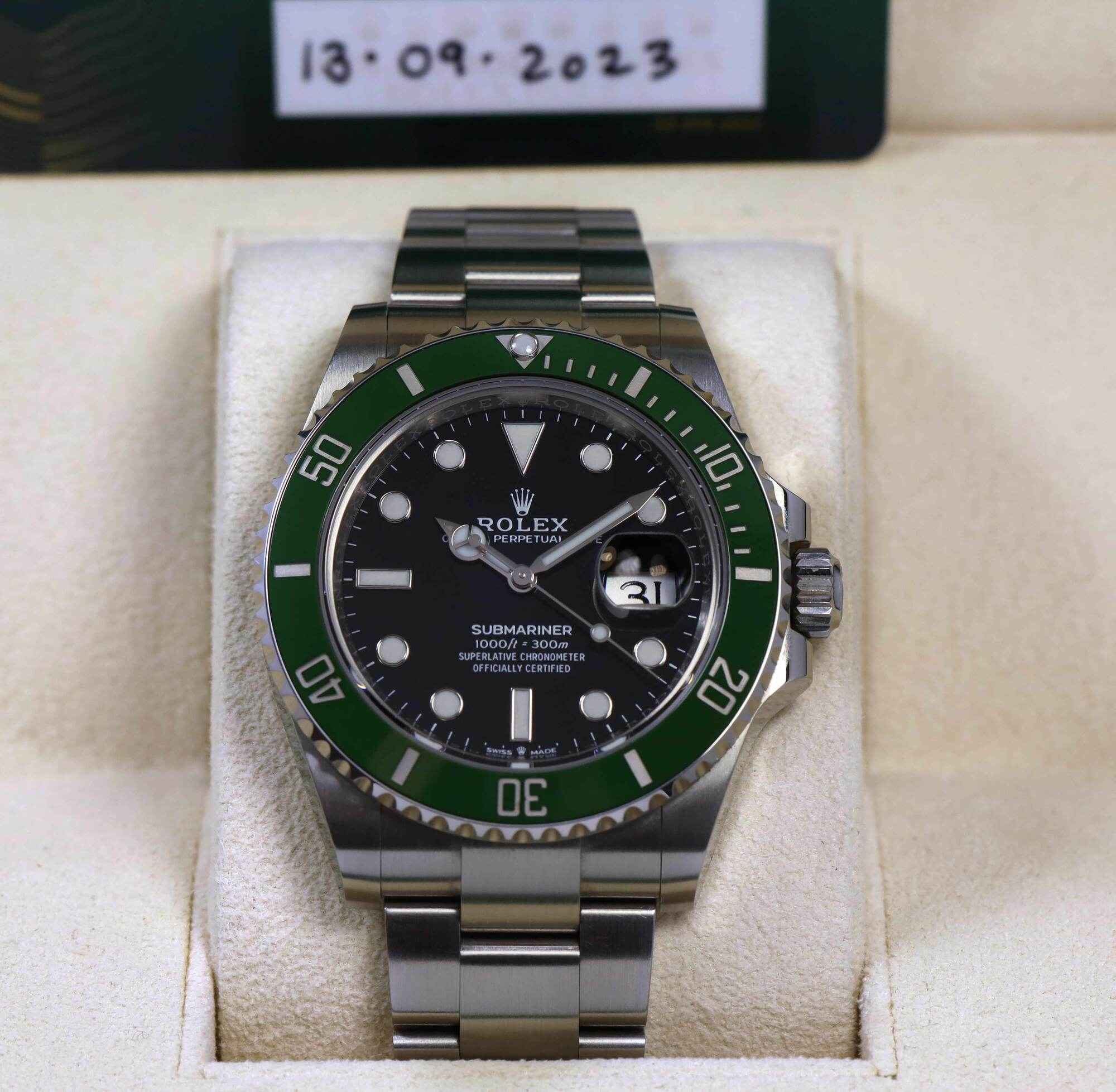 this rolex is in excellent condition and comes with its box, booklets, hang tags, and warranty card dated september 13th, 2023 as shown in the pictures attached. This watch is in stock and available to ship immediately!