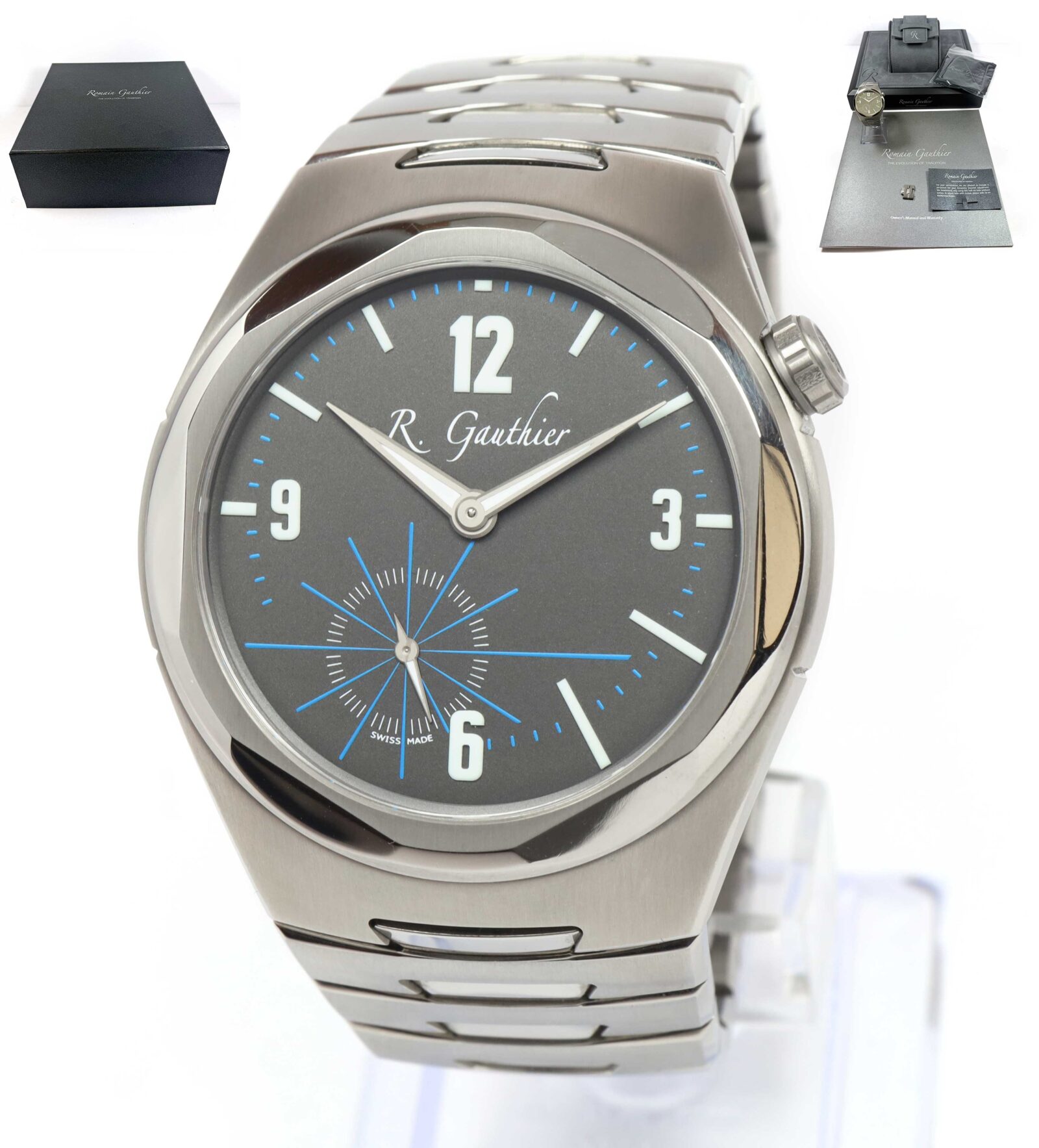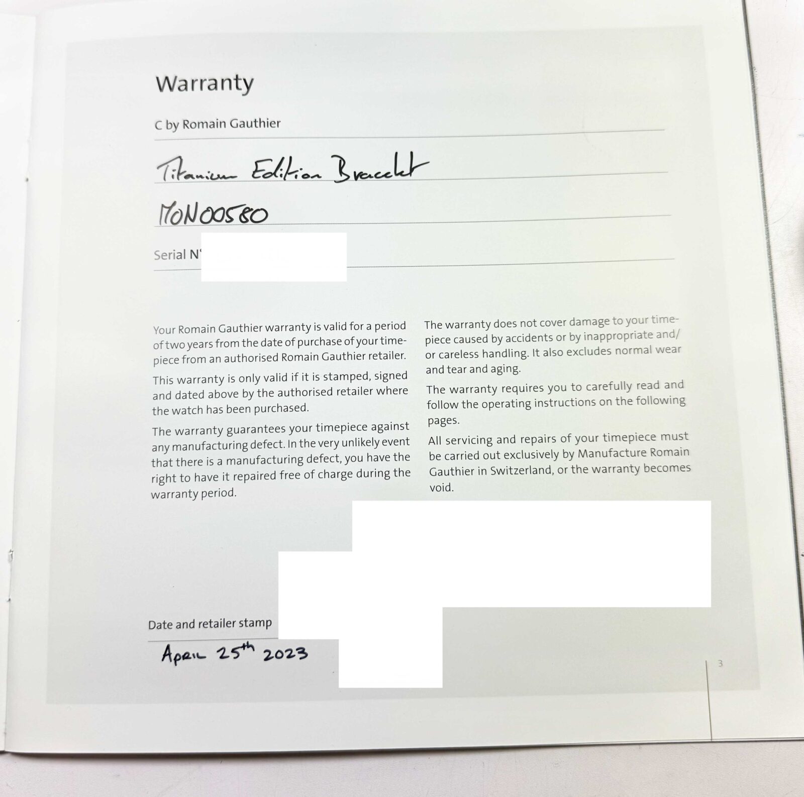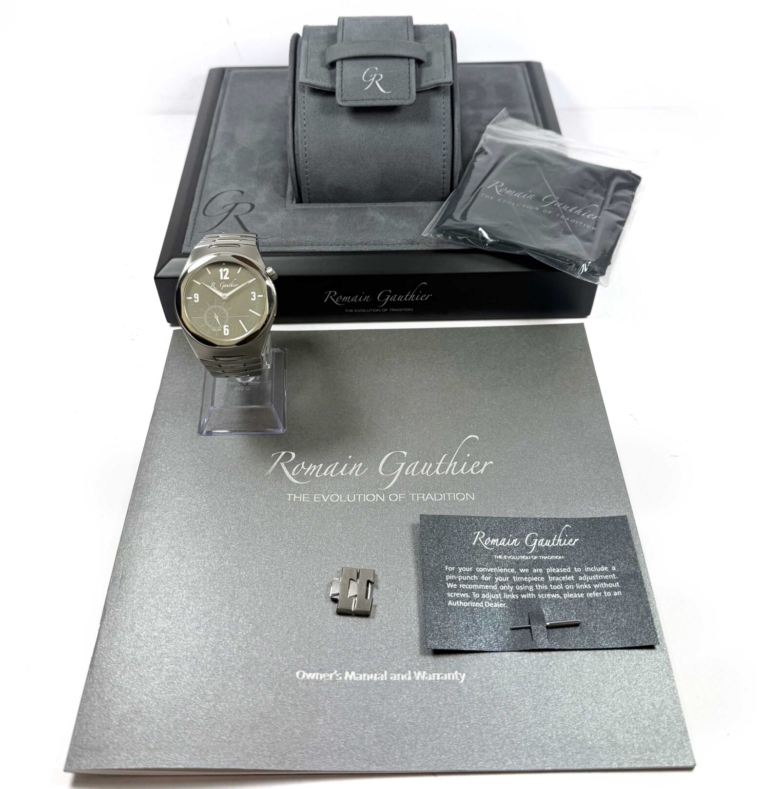 this romain gauthier watch is in excellent condition and comes with its box, booklet, spare links, watch tool, and warranty paper dated april 25th, 2023 as shown in the pictures attached. This watch is in stock and available to ship immediately!