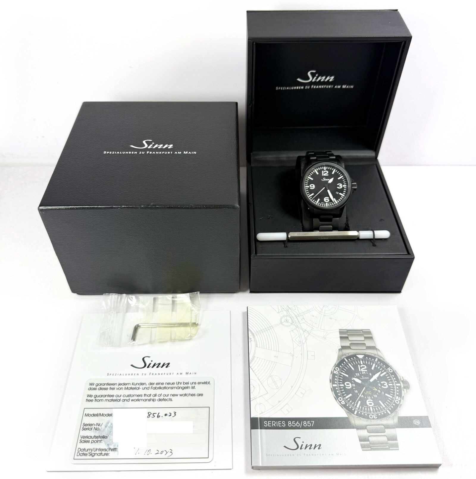This Sinn watch is in excellent overall condition and comes with its box, booklets, Sinn tools, and warranty card dated January 10th, 2023 as shown in the pictures attached. This watch is in stock and available to ship immediately!
