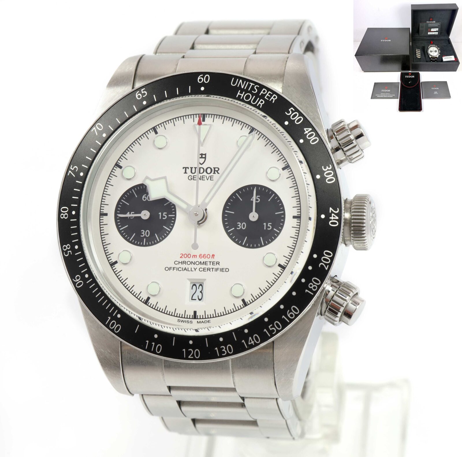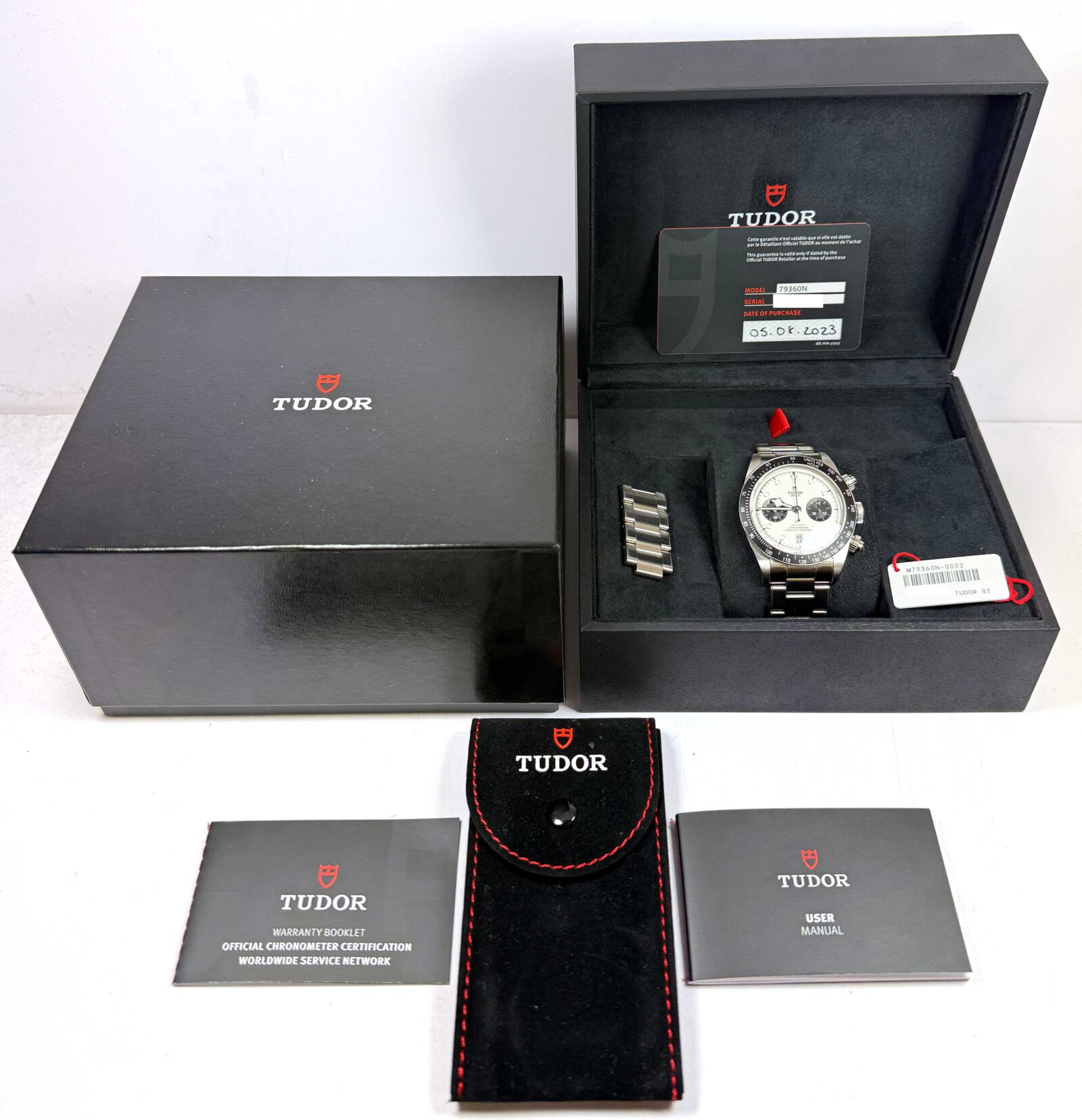 Read Morethis tudor watch is in good overall condition showing some signs of surface wear consistent with preowned watches. This comes with its box, booklets, spare links, hang tag, and warranty card dated august 5th, 2023 as shown in the pictures attached. This watch is in stock and available to ship immediately!