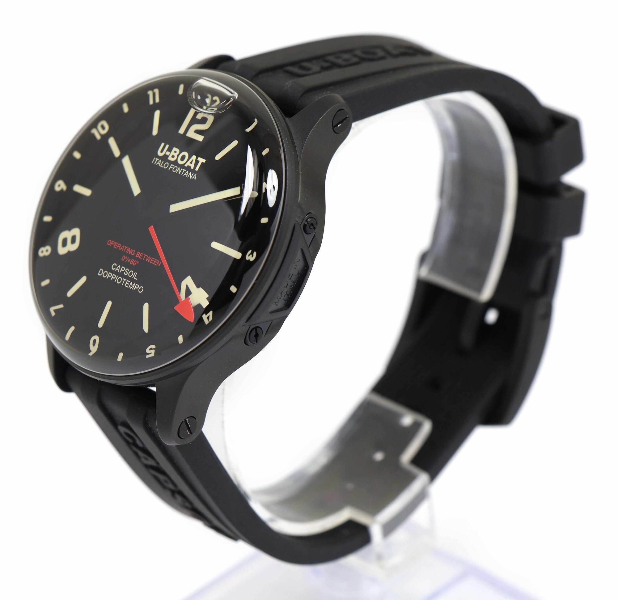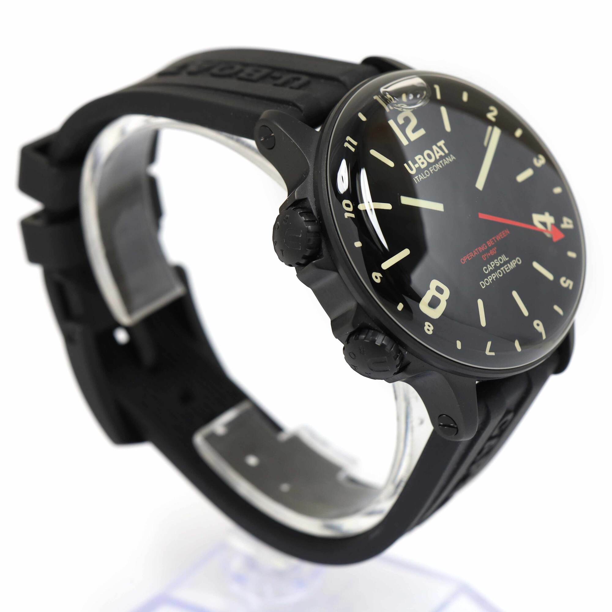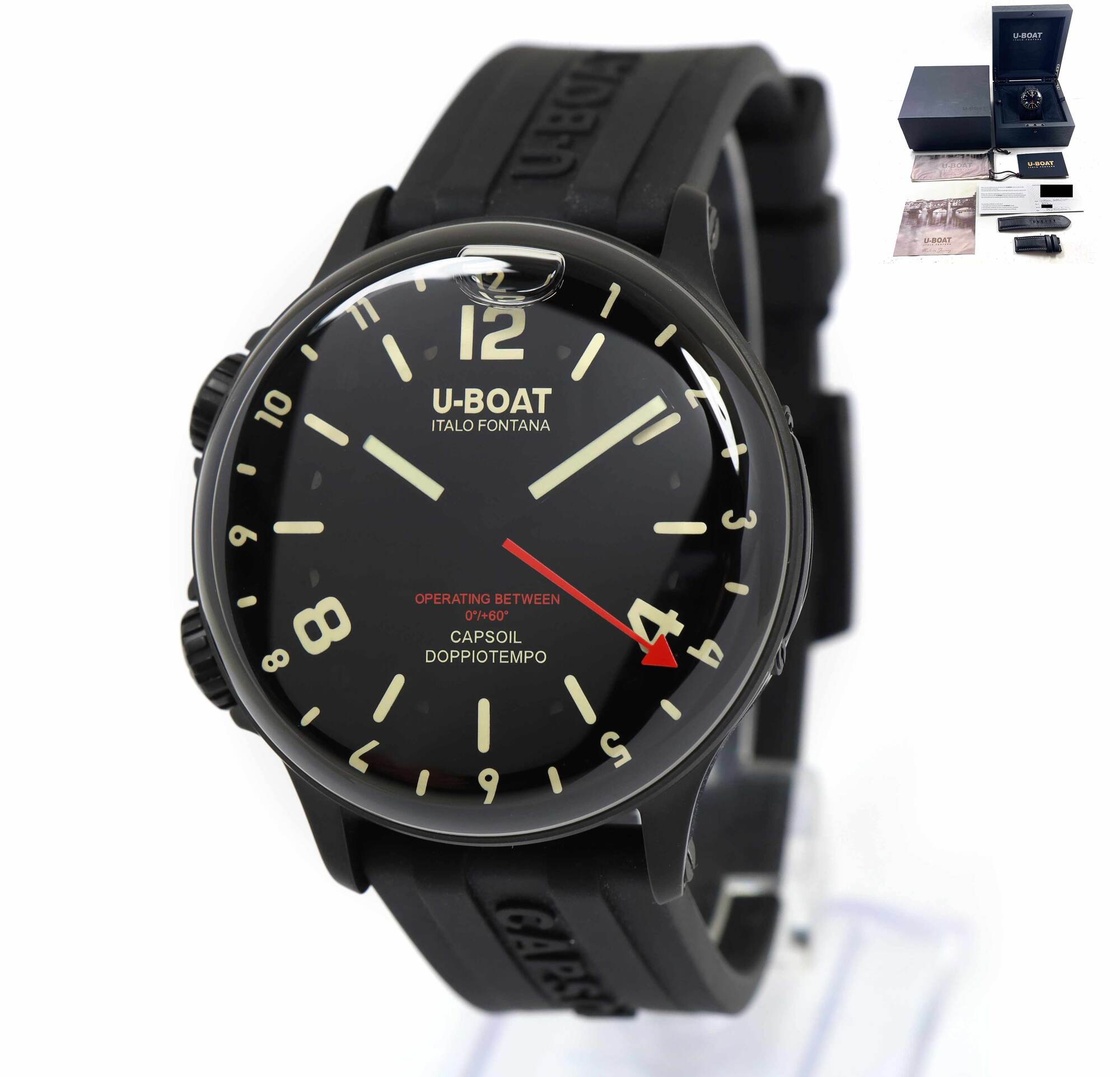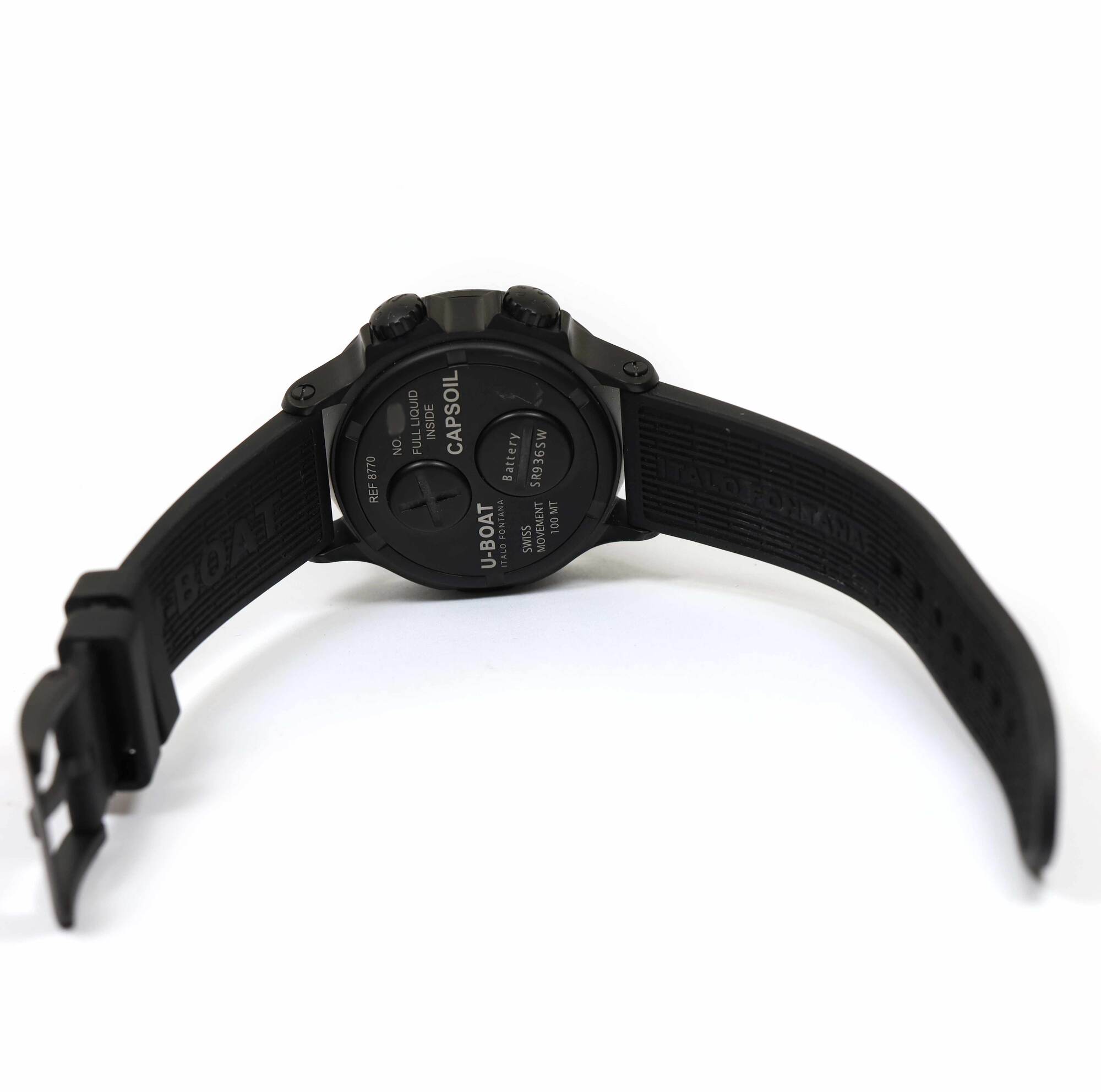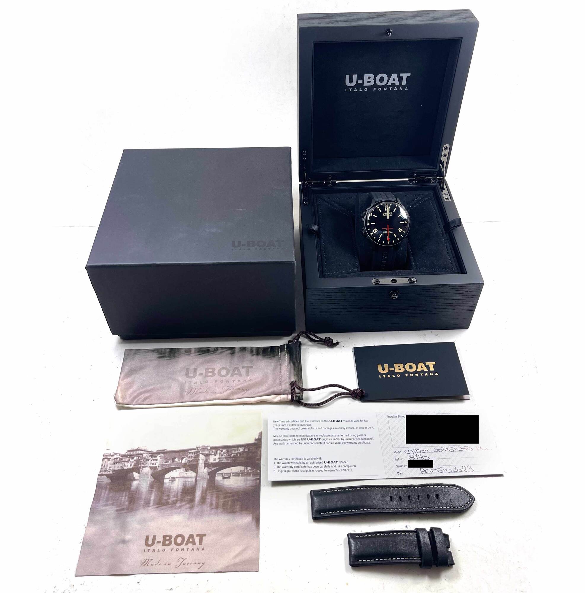 THIS U-BOAT WATCH IS IN EXCELLENT OVERALL CONDITION AND COMES WITH ITS BOX, ONE ADDITIONAL BLACK LEATHER STRAP, AND WARRANTY CARD DATED AUGUST, 2023 AS SHOWN IN THE PICTURES ATTACHED. THIS WATCH FEATURES A 45MM BLACK DLC STEEL CASE THAT SURROUNDS A BLACK DI...
