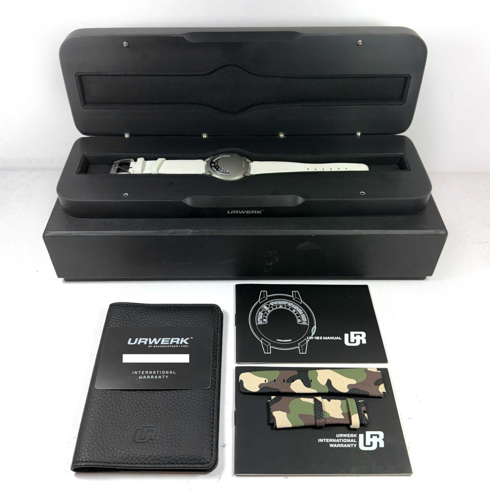 this urwerk watch is in excellent condition and comes with its box, booklets, one additional rubber camo strap, and warranty card as shown in the pictures attached. This watch is in stock and available to ship immediately!