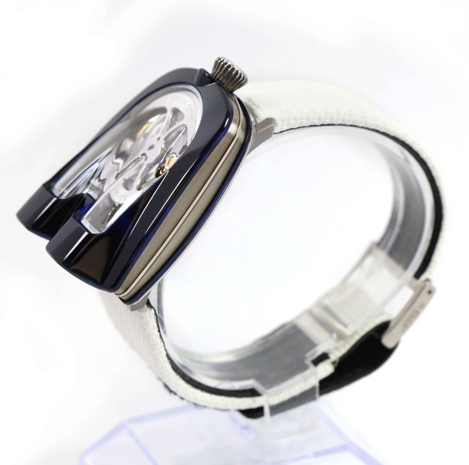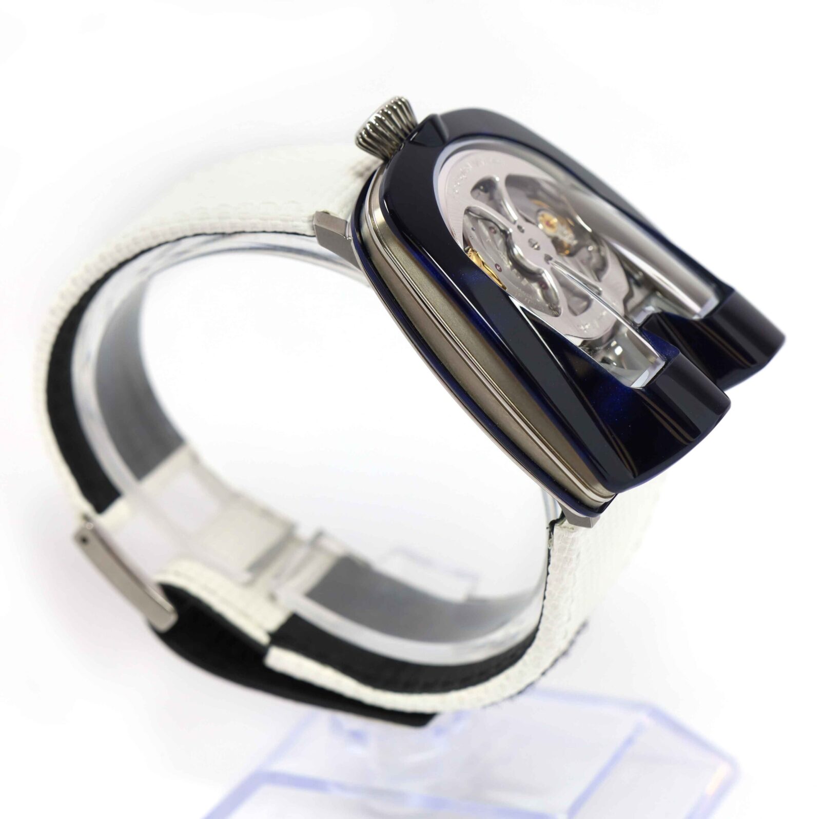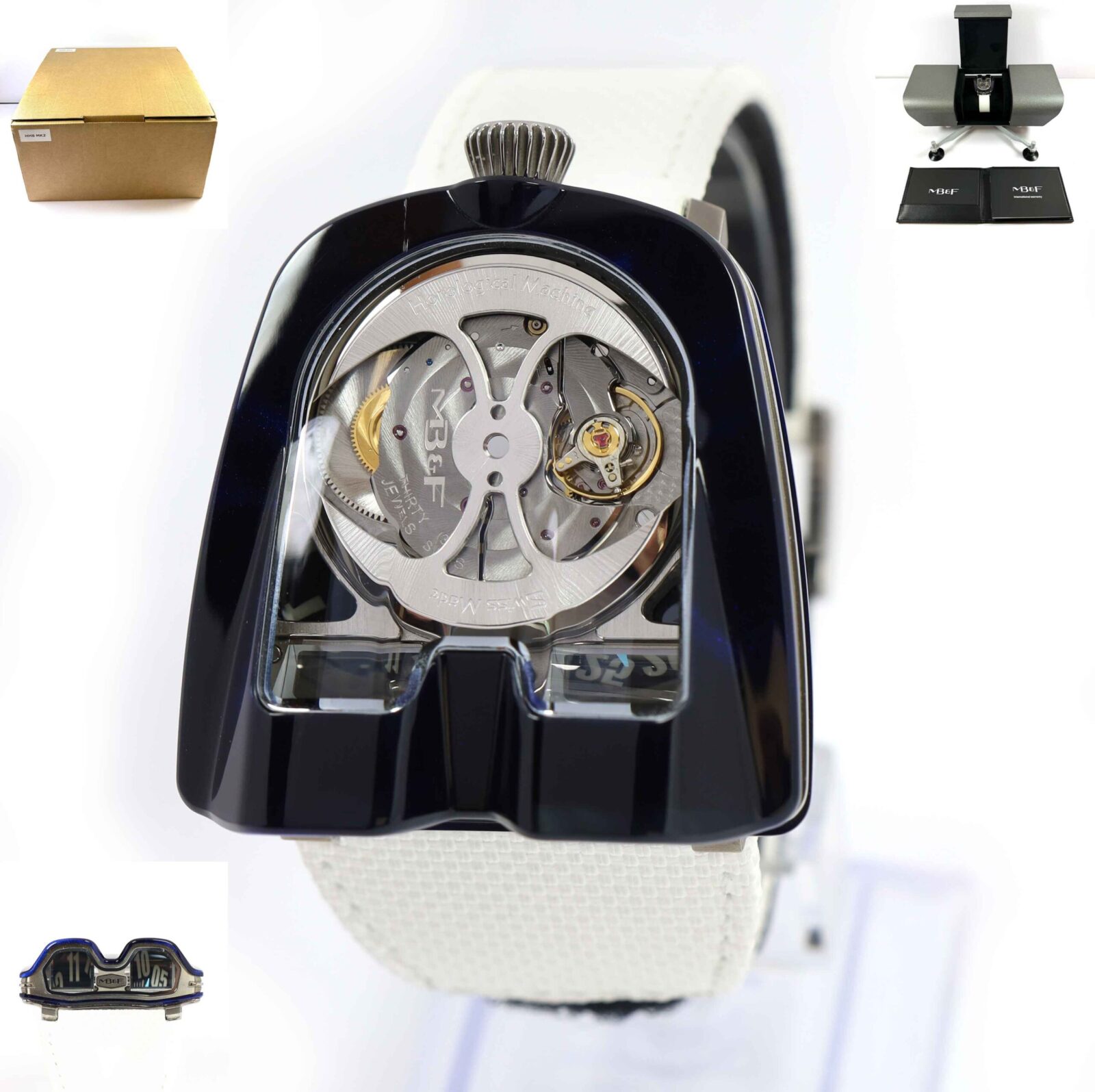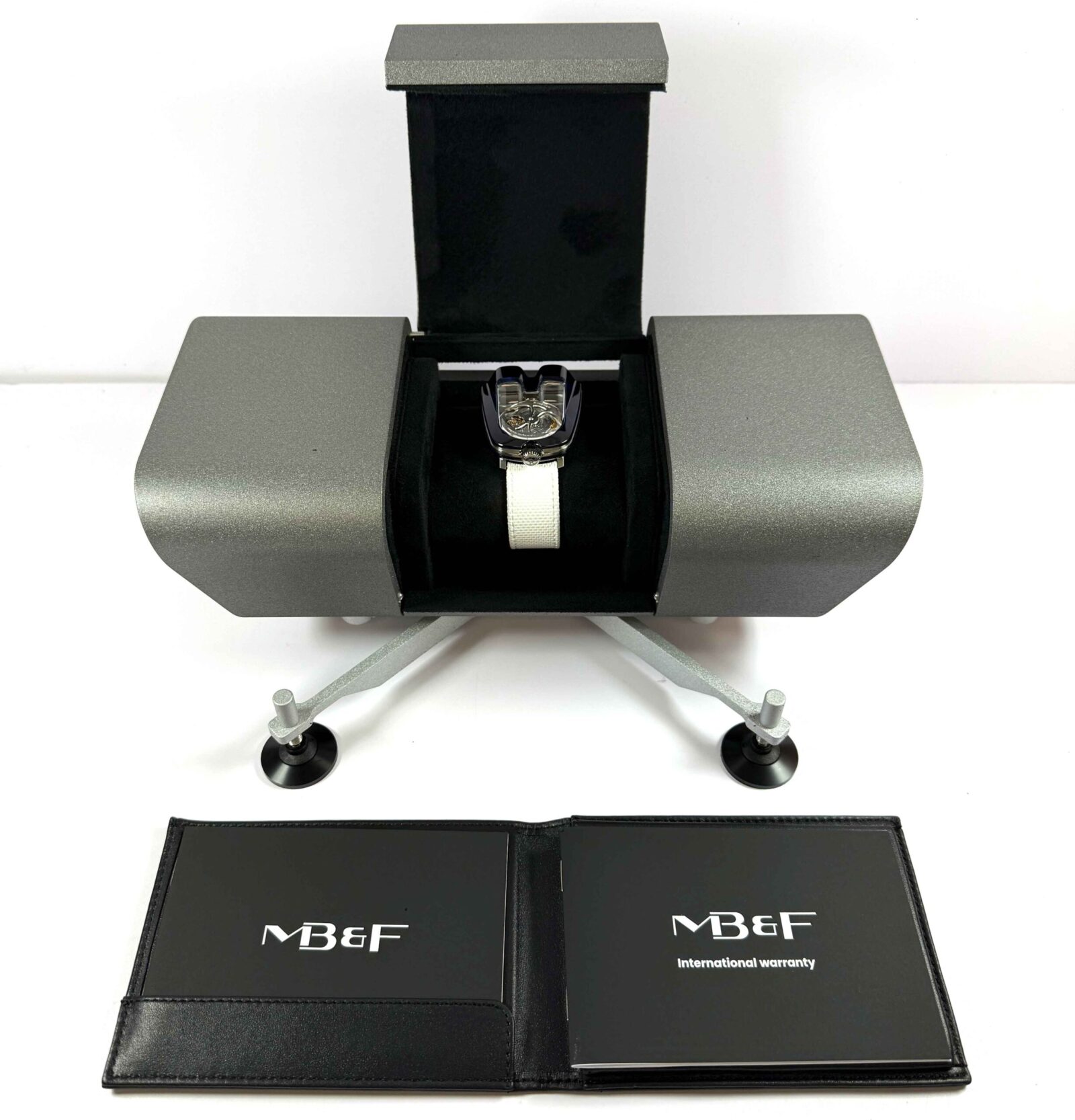 THIS MB&F WATCH IS IN GREAT OVERALL CONDITION AND COMES WITH ITS ORIGINAL BOX, BOOKLETS, AND WARRANTY PAPERS DATED 2024. IT DOES HAVE A SMALL SCRATCH ON THE BLUE BEZEL NEAR THE CROWN, AS SHOWN IN THE ATTACHED PICTURES. THIS WATCH IS PART OF A LIMITED ED...