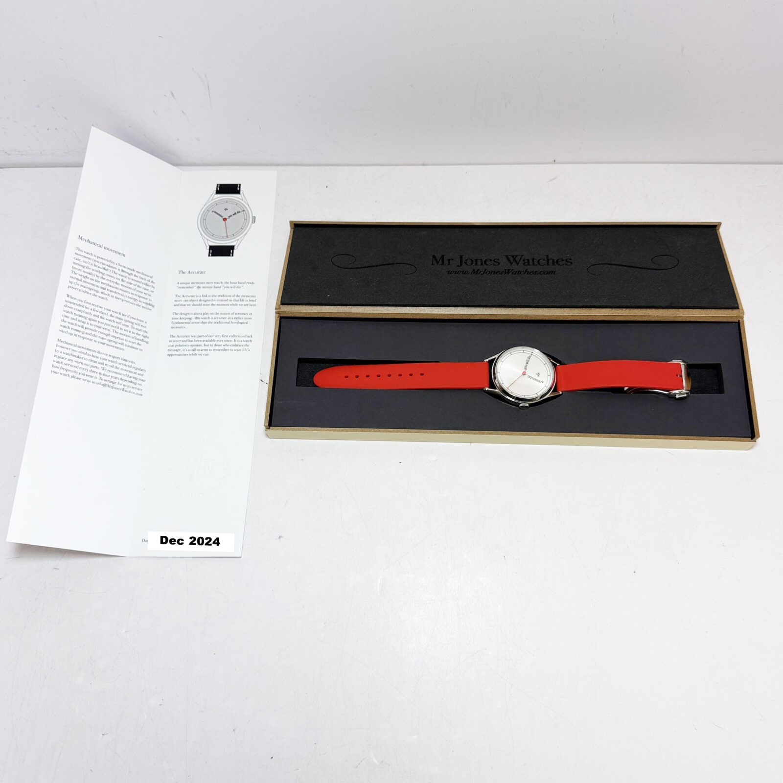 This Mr Jones watch comes with its box and warranty paper dated December, 2024. The photos shown are of the exact watch being sold and accurately represent its condition. This watch is in stock and ready to ship immediately!
