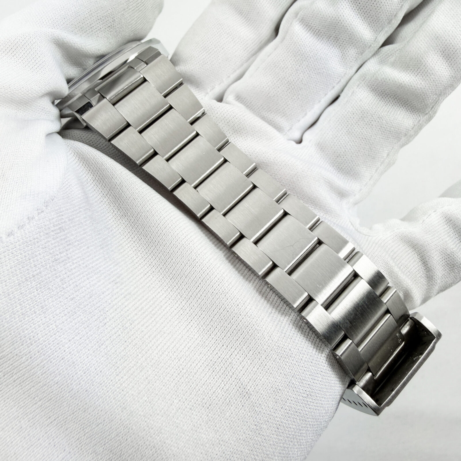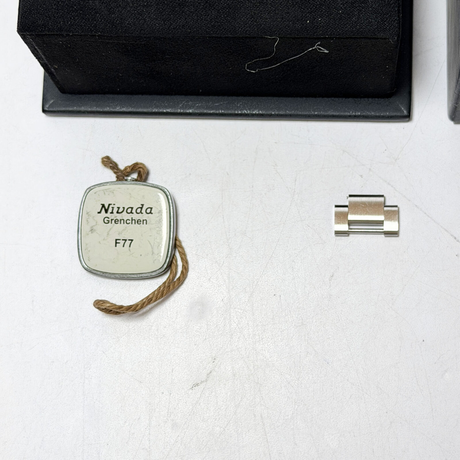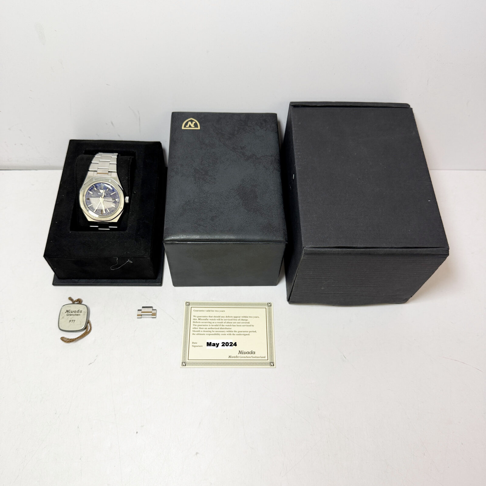 this nivada grenchen watch comes with its box, hangtag, extra link, and warranty card dated may, 2024. The photos shown are of the exact watch being sold and accurately represent its condition. This watch is in stock and ready to ship immediately!