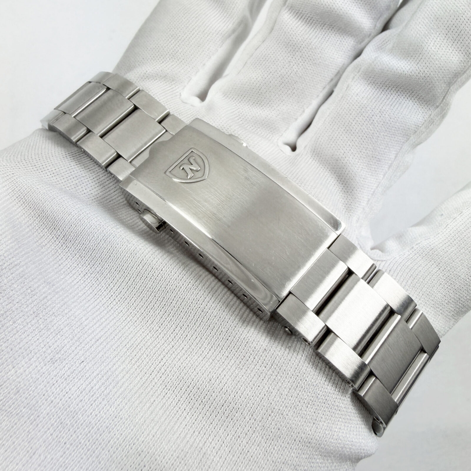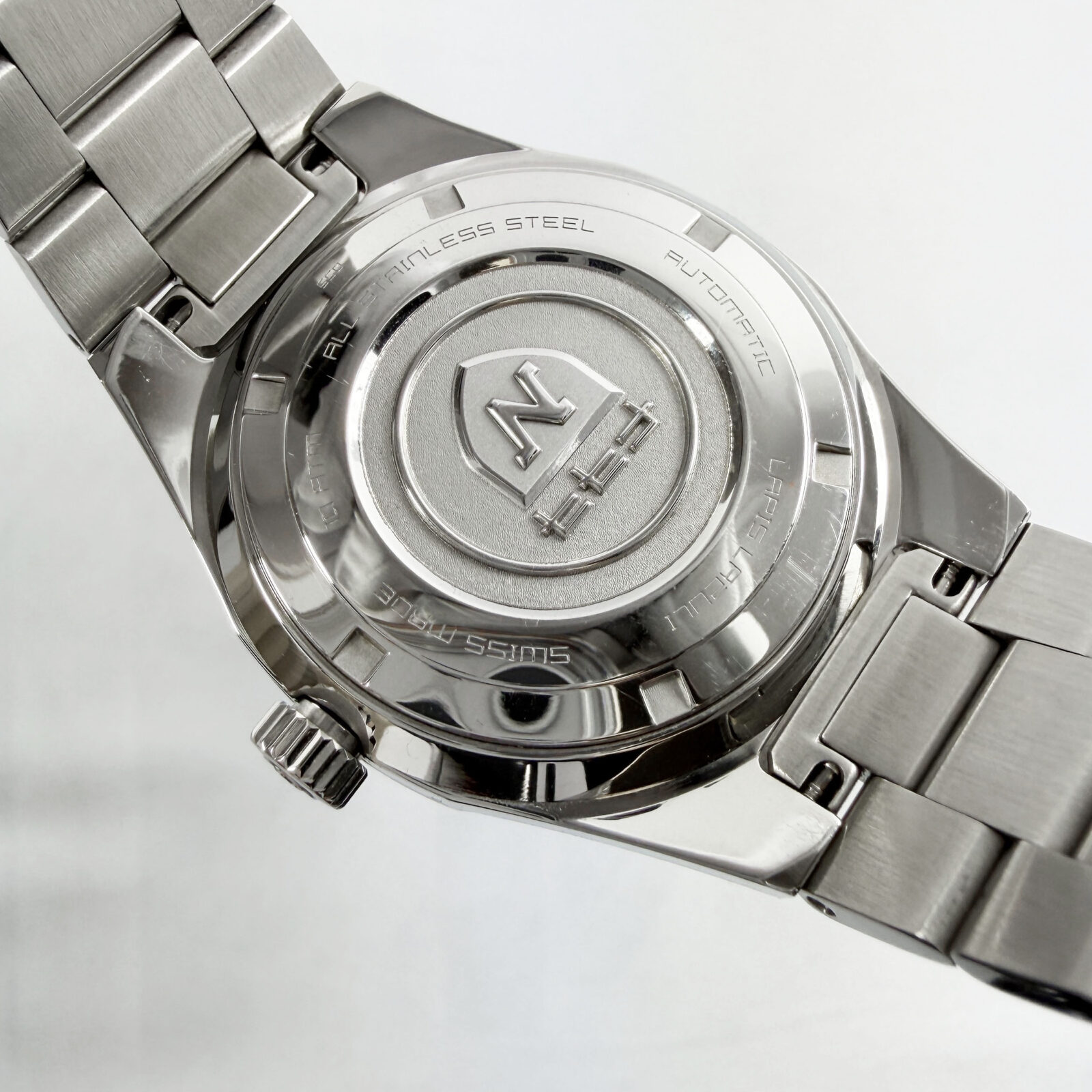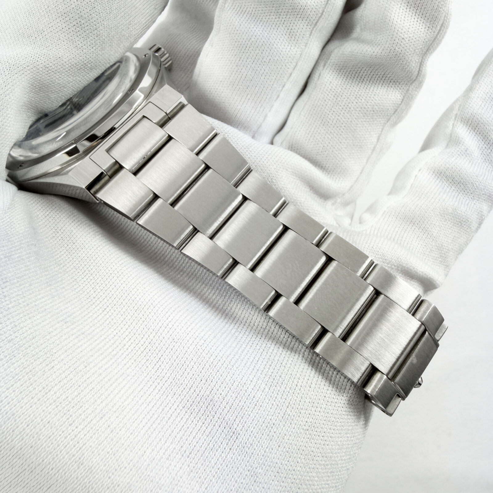 this nivada grenchen watch comes with its box, hangtag, extra link, and warranty card dated may, 2024. The photos shown are of the exact watch being sold and accurately represent its condition. This watch is in stock and ready to ship immediately!