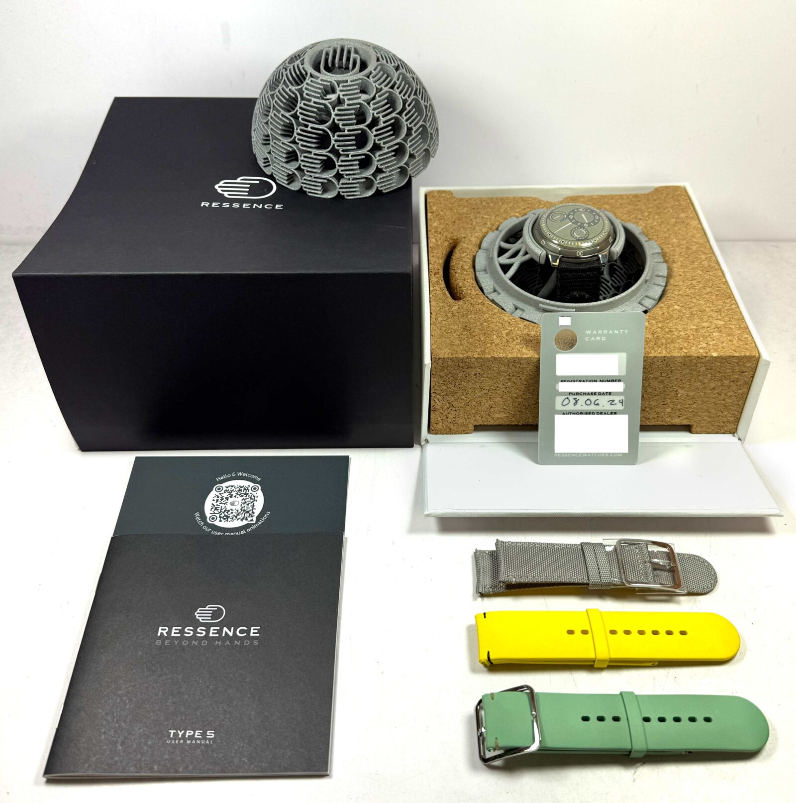 this ressence watch is in excellent condition and comes with its box, booklet, 3 additional straps, and warranty card dated august 6th, 2024 as shown in the pictures attached. This watch is in stock and available to ship immediately!