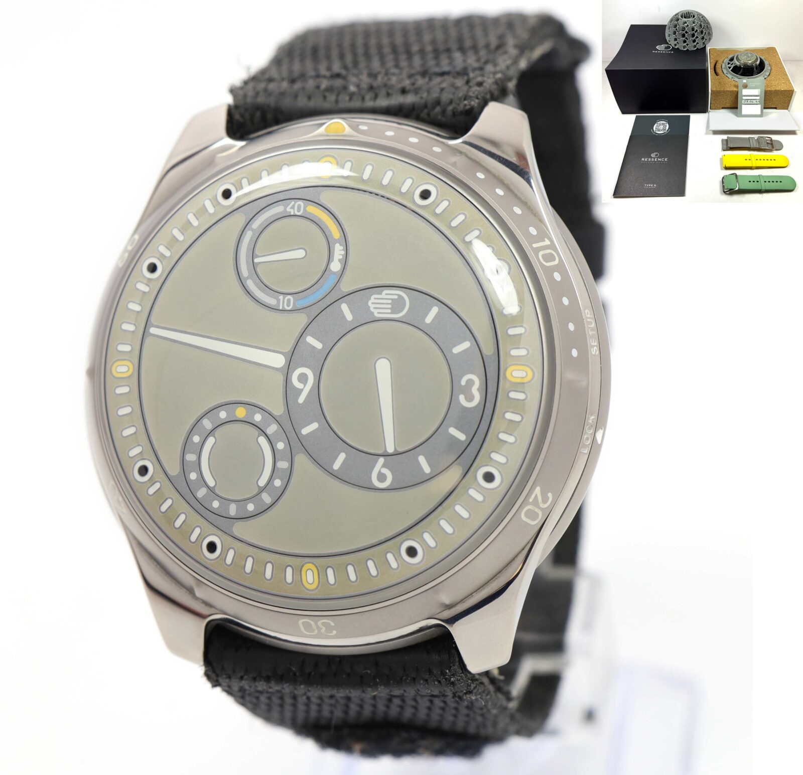 This Ressence watch is in excellent condition and comes with its box, booklet, 3 additional straps, and warranty card dated August 6th, 2024 as shown in the pictures attached. This watch is in stock and available to ship immediately!