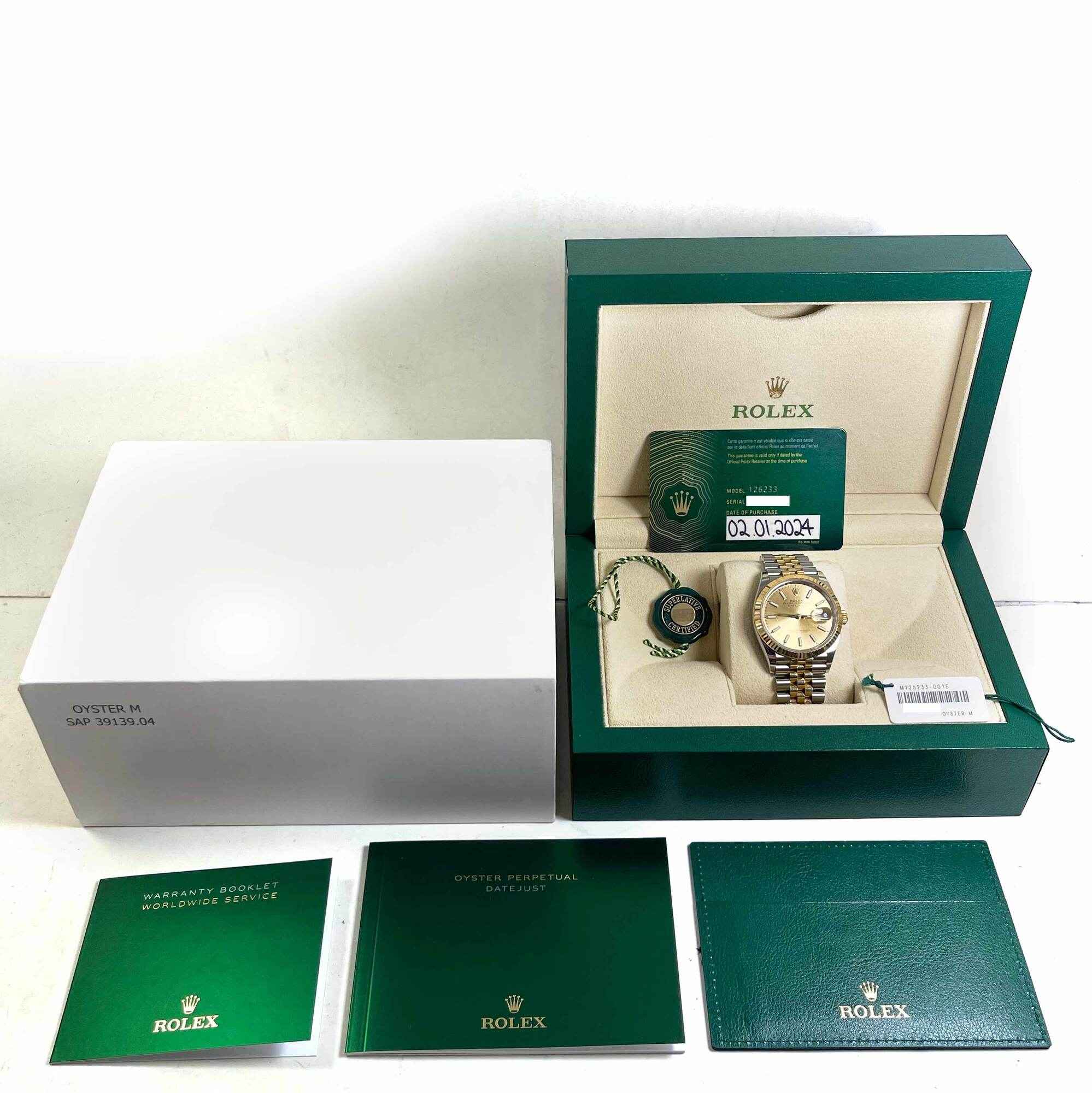 THIS ROLEX IS IN EXCELLENT CONDITION AND COMES WITH ITS BOX, BOOKLETS, BOTH HANG TAGS, AND WARRANTY CARD DATED JANUARY 2ND, 2024 AS SHOWN IN THE PICTURES ATTACHED. THIS WATCH IS IN STOCK AND AVAILABLE TO SHIP IMMEDIATELY!