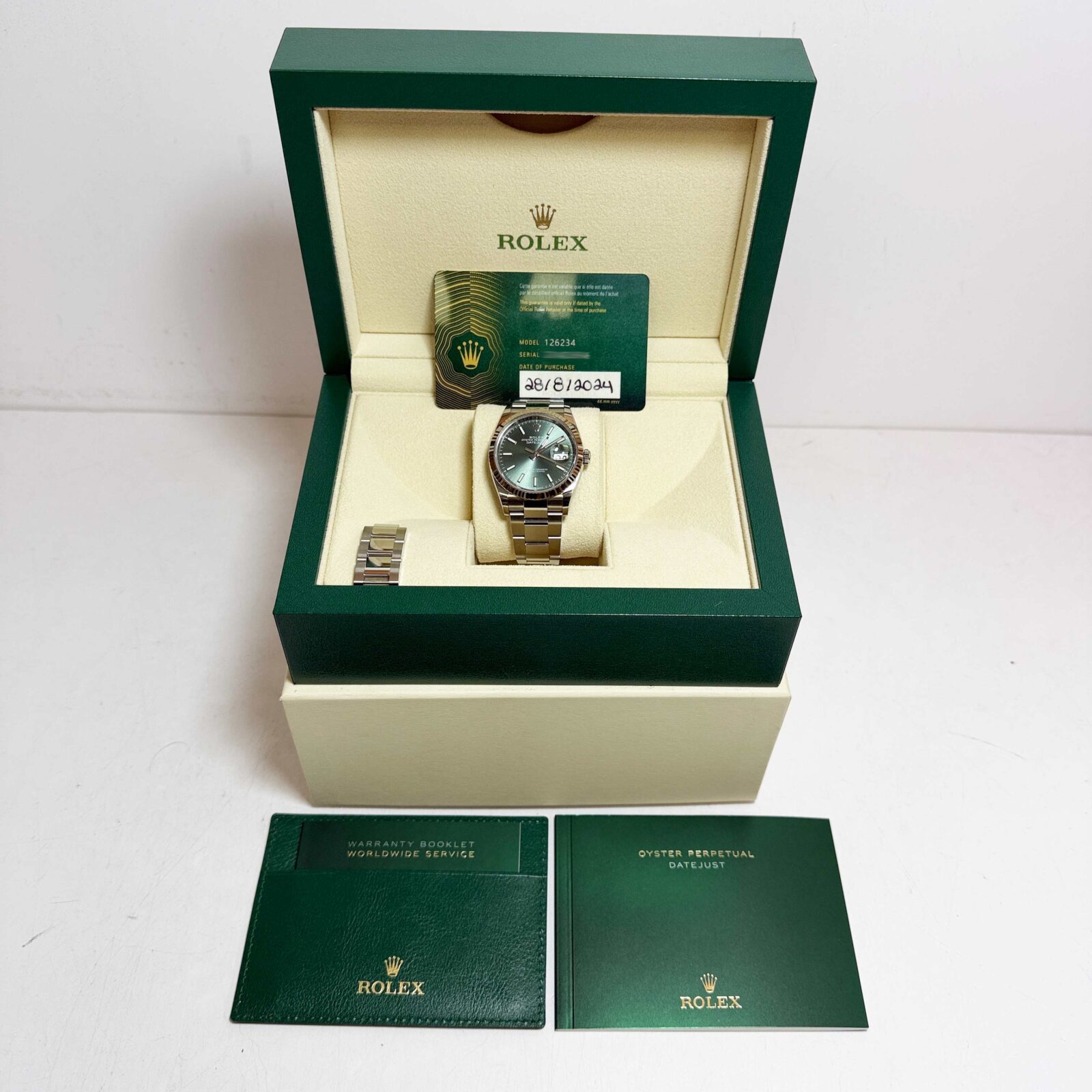 this rolex datejust watch is in excellent condition and it comes with its box, booklets, additional links, and warranty card dated august 28th, 2024 as shown in the pictures. This watch is in stock and ready to ship immediately!