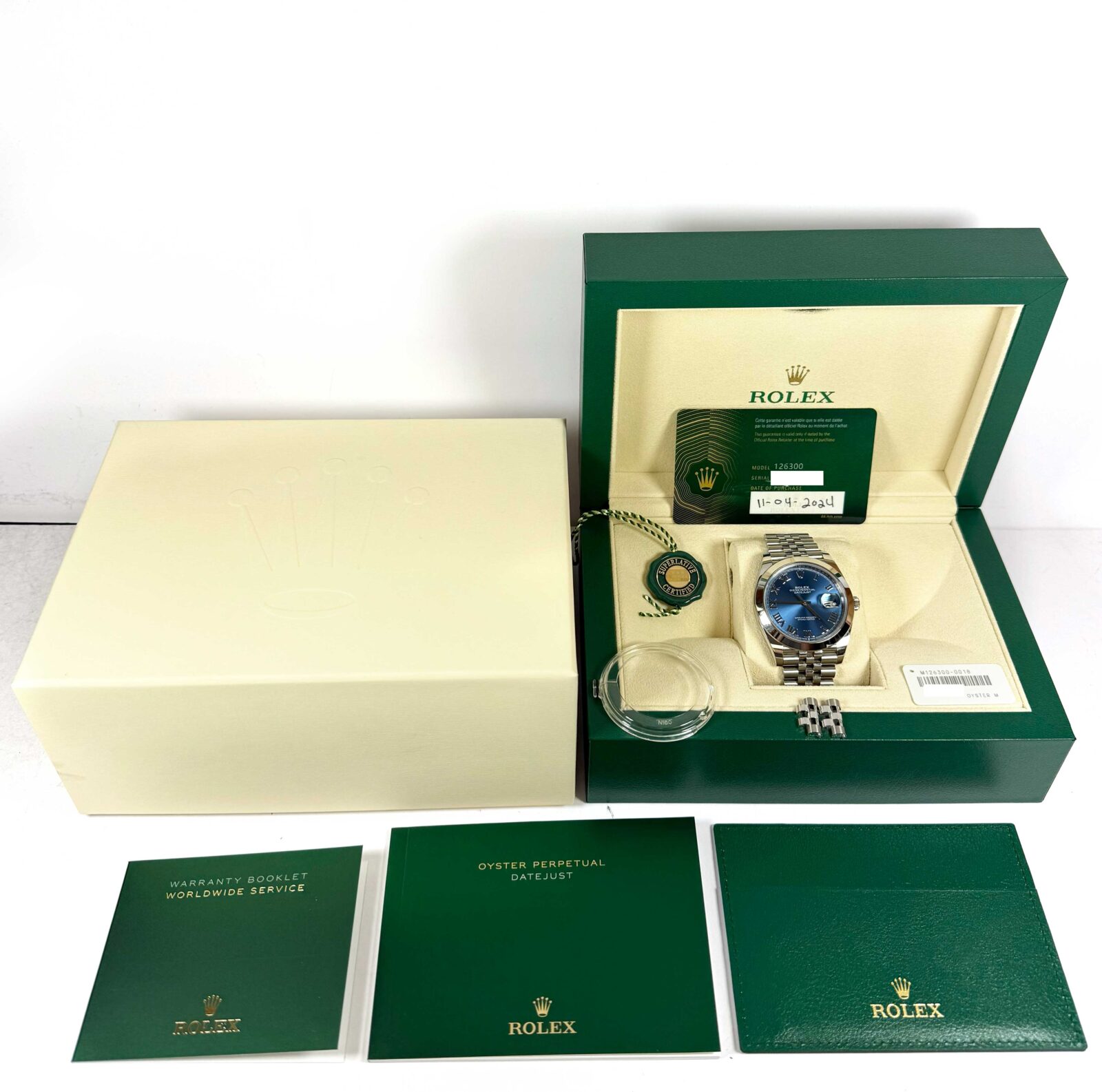 This Rolex is in excellent overall condition and comes with its box, booklets, bezel protector, hang tags, spare links, and warranty card dated April 11th, 2024 as shown in the pictures attached. This watch is in stock and available to ship immediately!