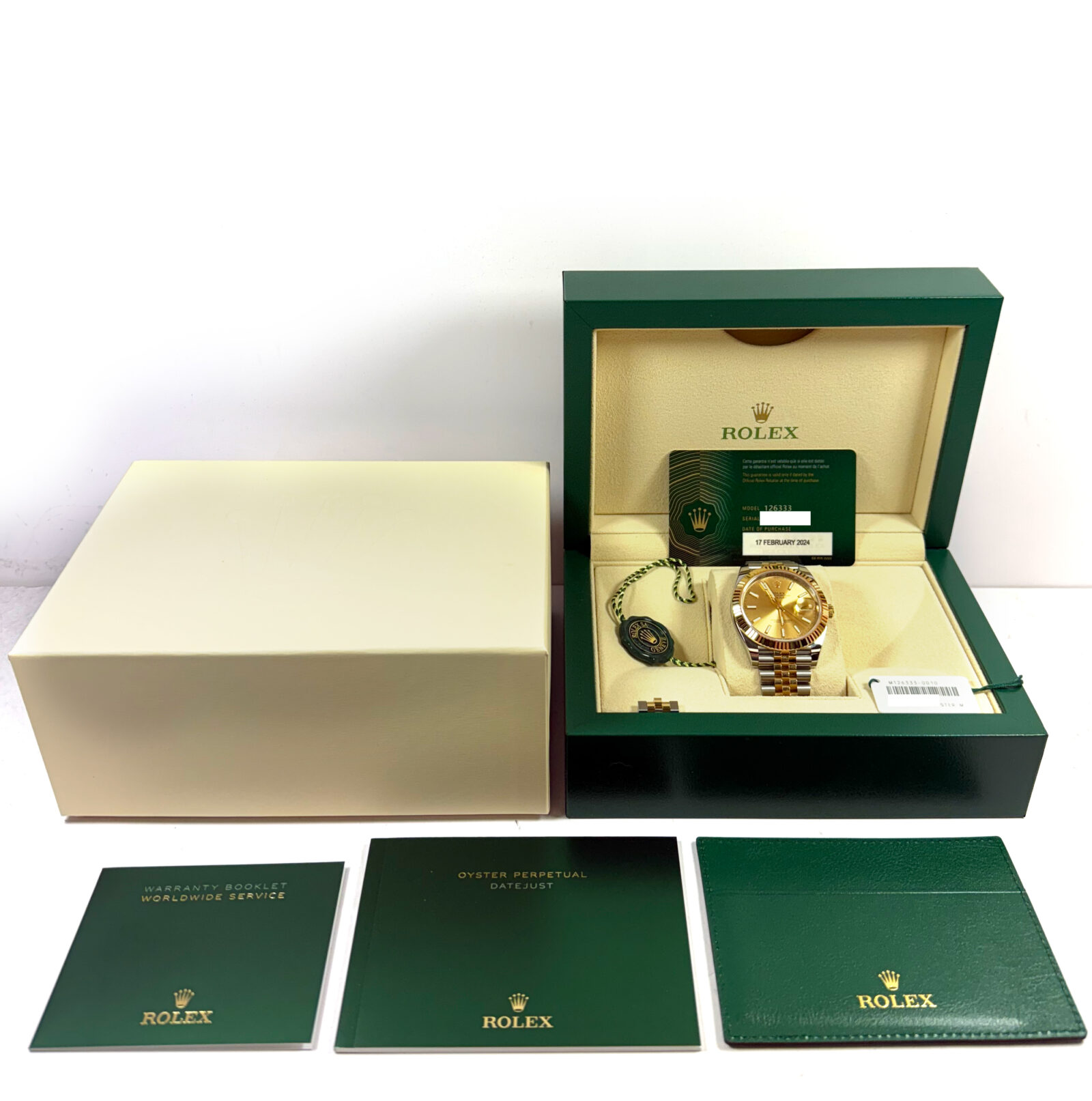 this rolex watch is in excellent overall condition showing some light signs of surface wear consistent with preowned watches. This comes with its box, booklets, hang tags, one spare link, and warranty card dated february 17th, 2024 as shown in the pictures attached. This watch is in stock and available to ship immediately!
