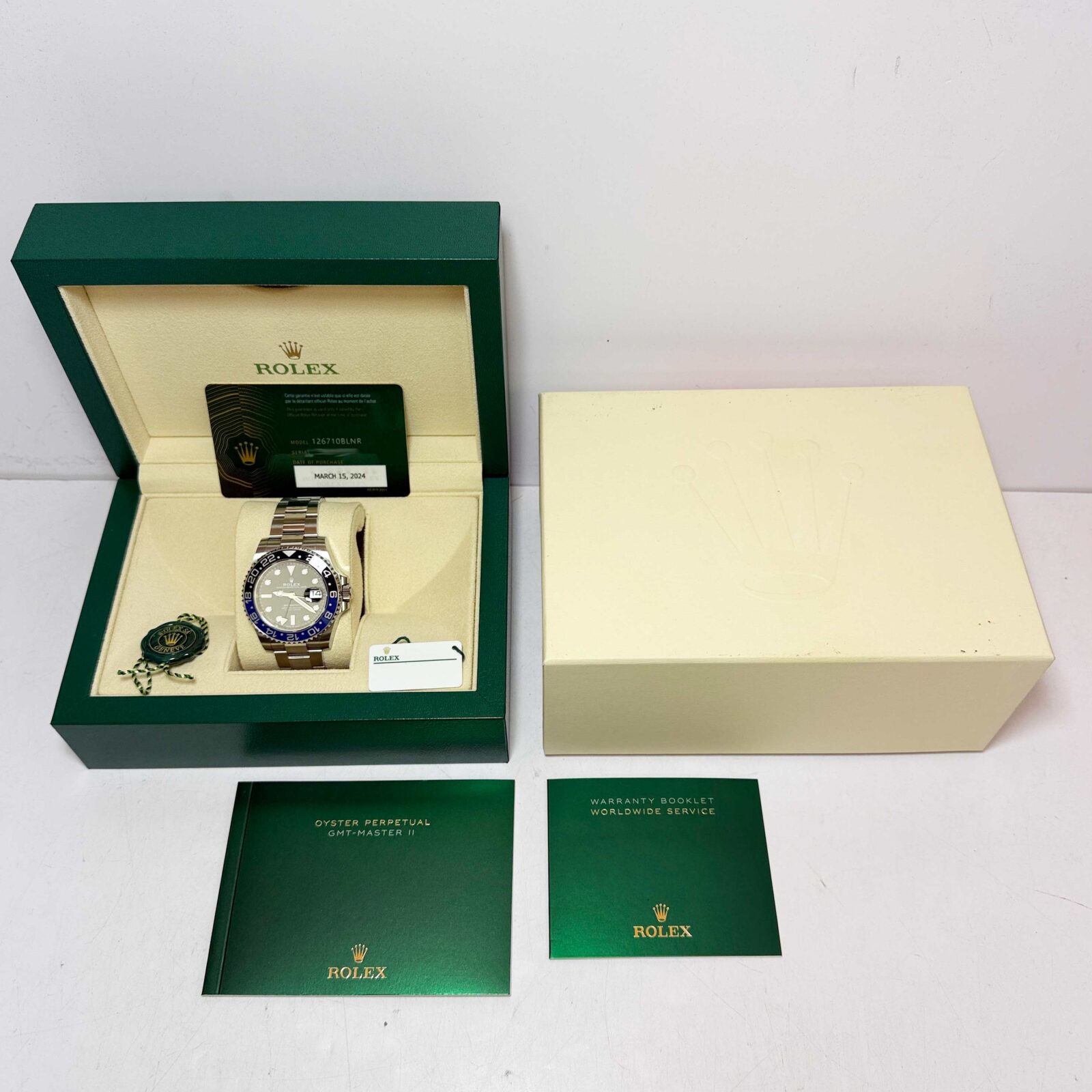 this rolex gmt-master ii watch comes with its box, booklets, hangtags, and warranty card dated march 15th, 2024. The photos shown are of the exact watch being sold and accurately represent its condition. This watch is in stock and ready to ship immediately!