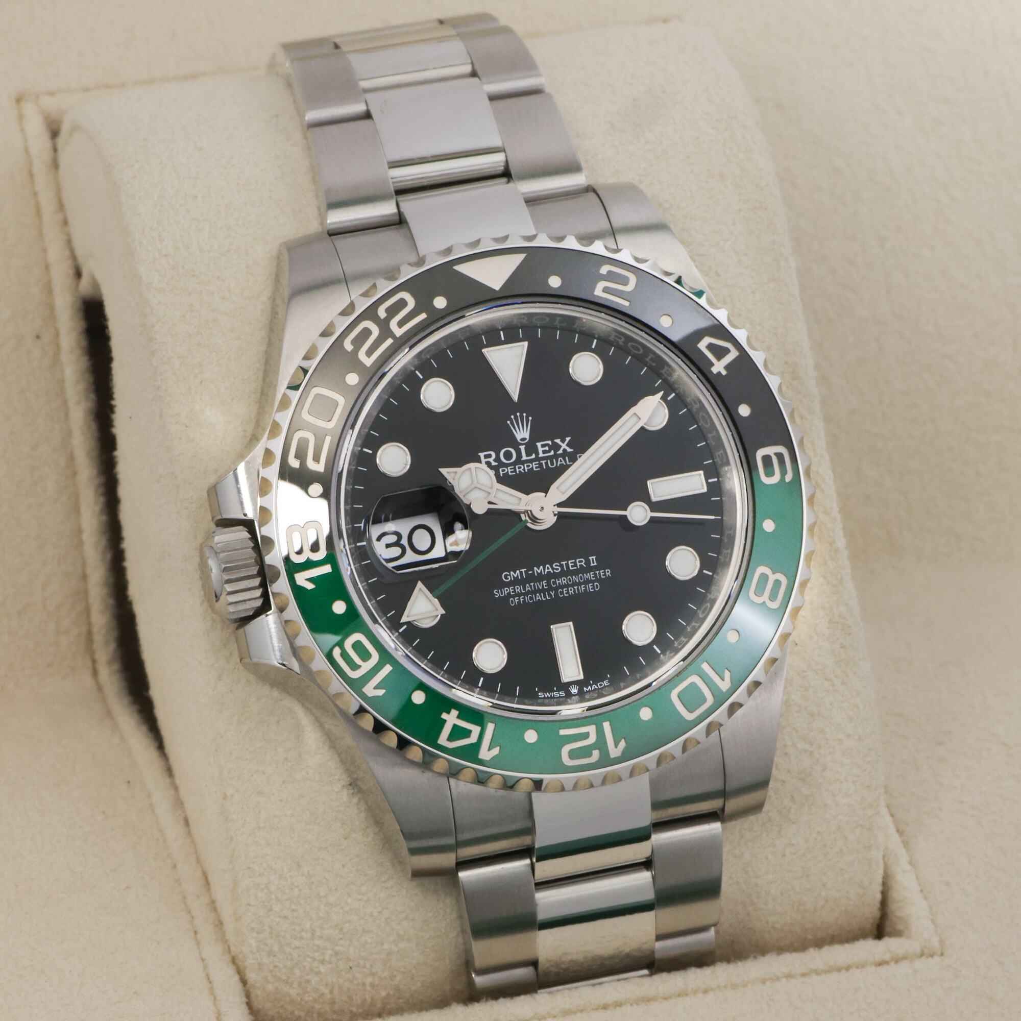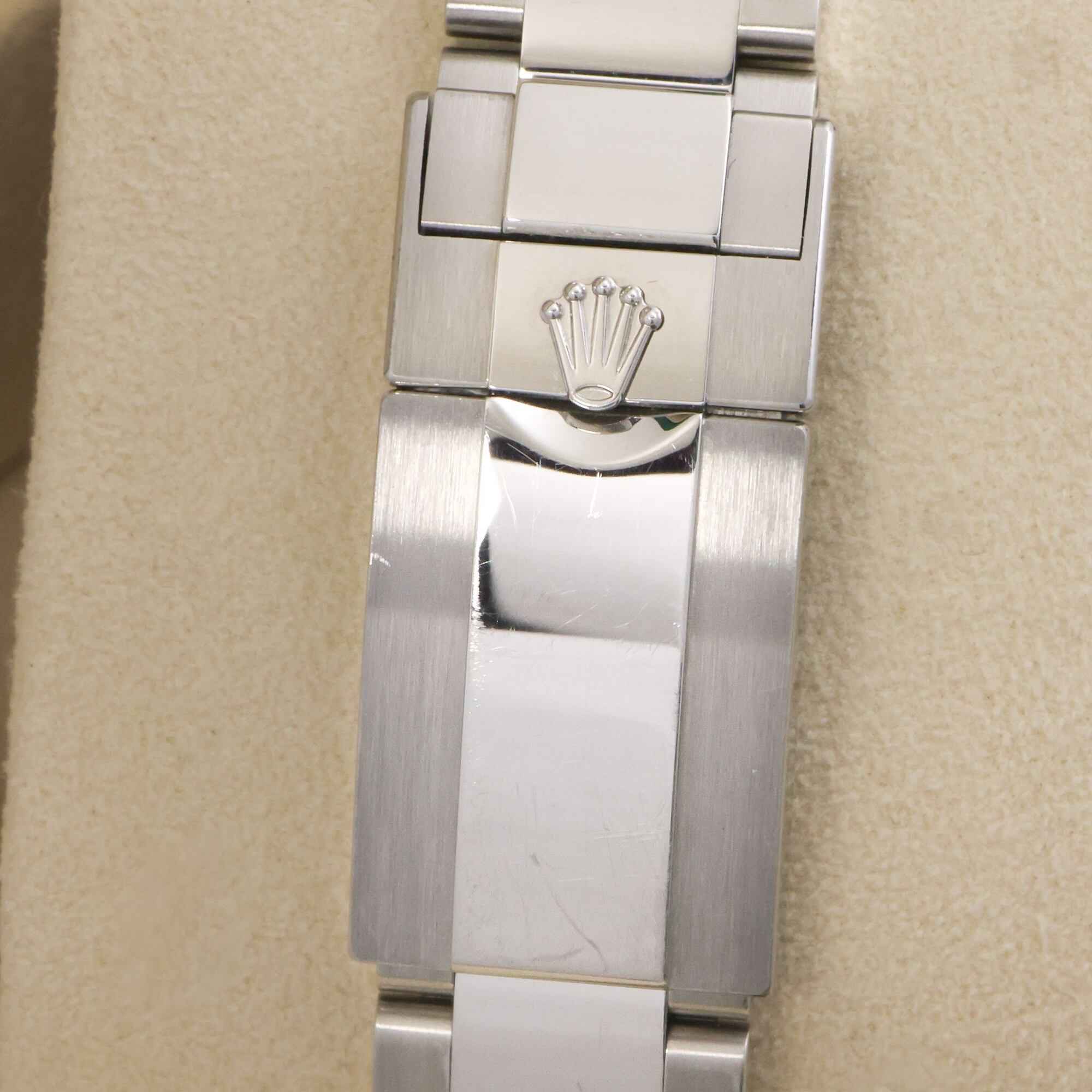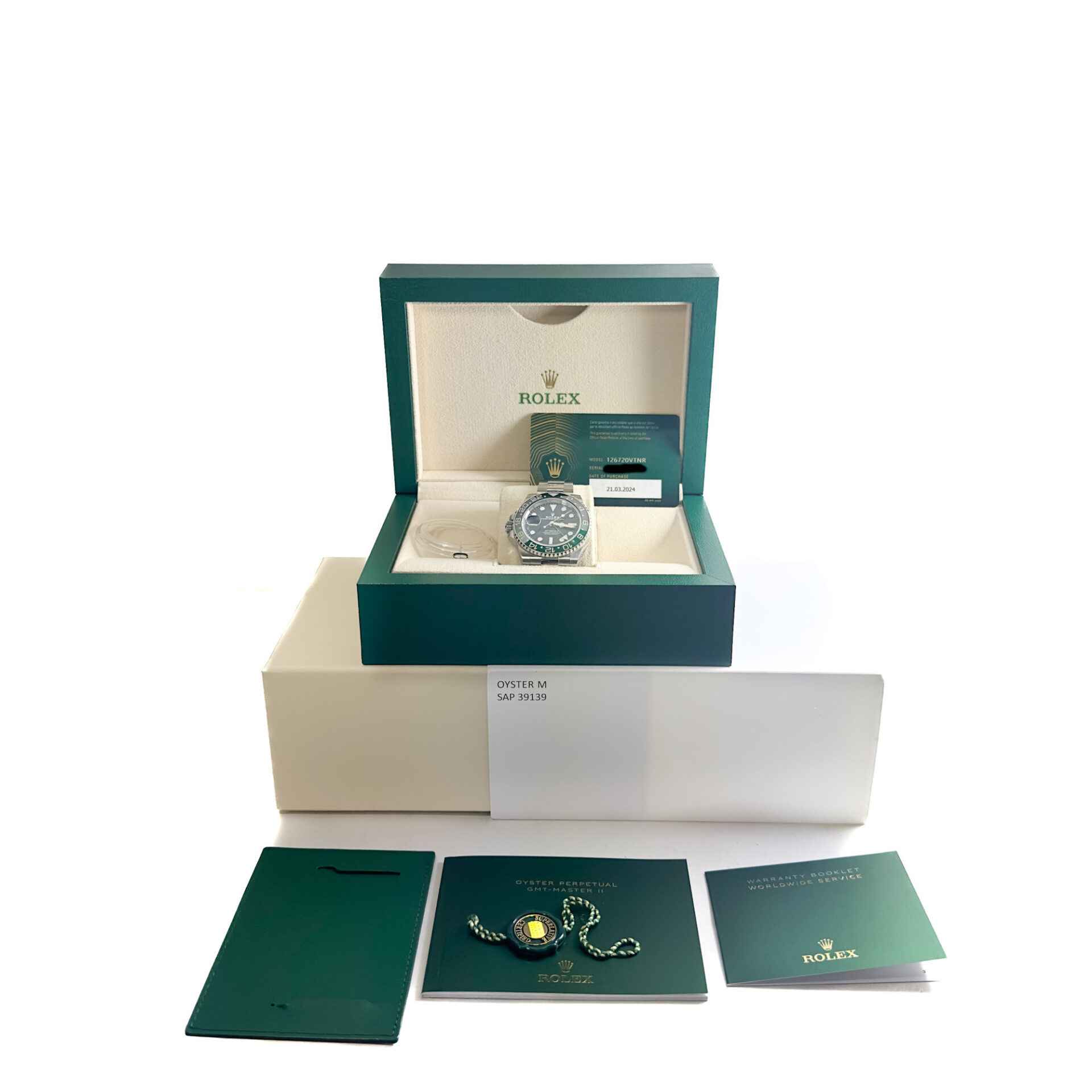 this 2024 rolex sprite is pre-owned and has been worn several times by the previous owner. We are able to polish upon request. The watch comes with its box, booklets, hang tag, bezel protector, and warranty card dated march 21, 2024.