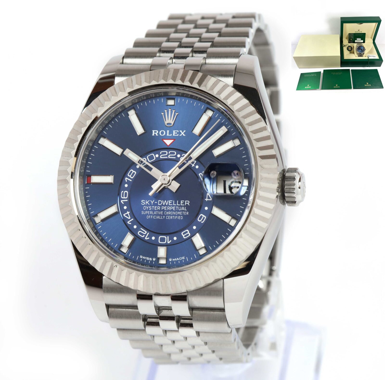 this rolex is in excellent condition and comes with its box, booklets, both hang tags, and warranty card dated november 8th, 2024 as shown in the pictures attached. This watch is in stock and available to ship immediately!