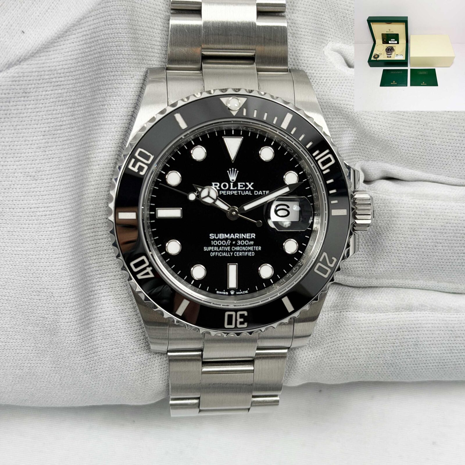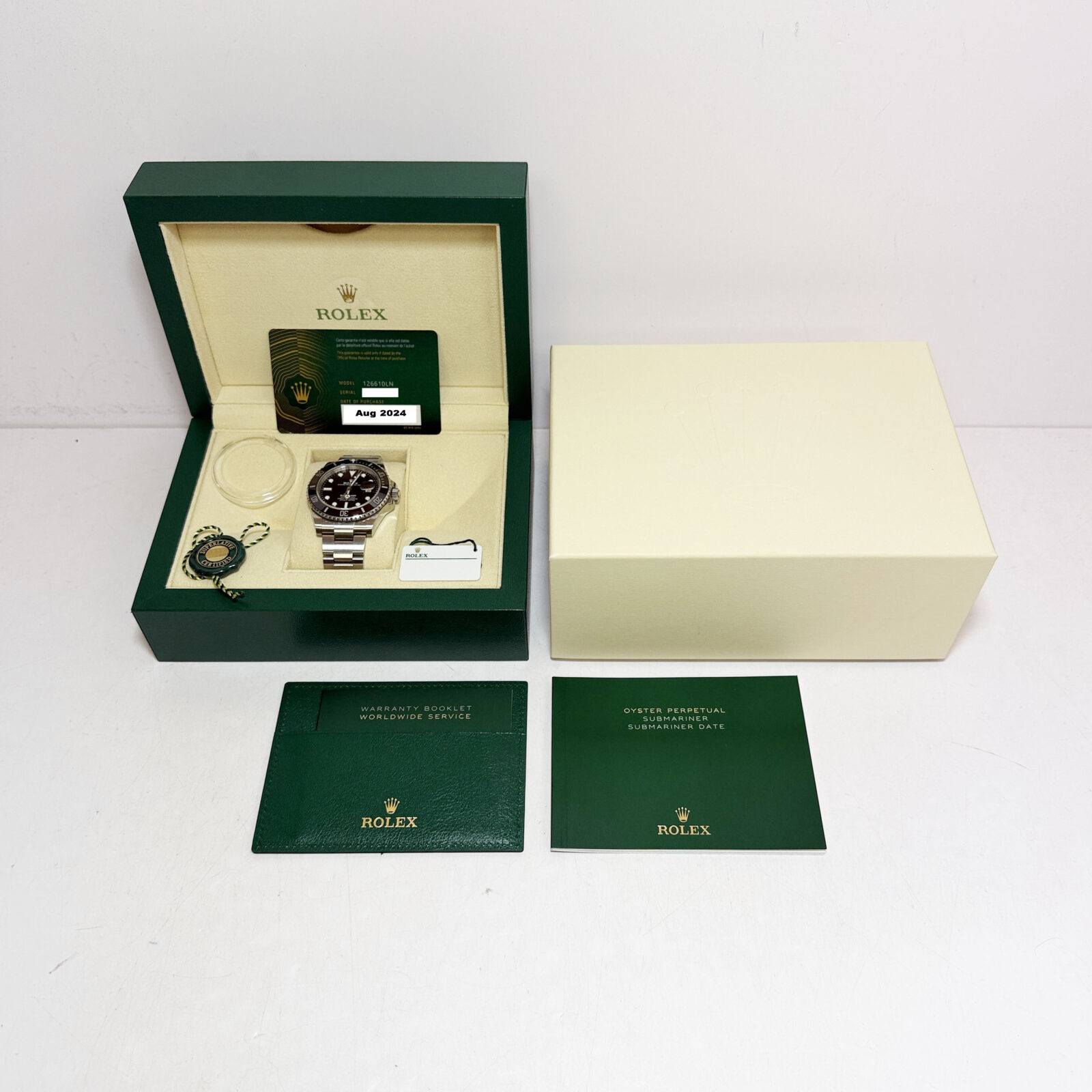 this rolex submariner watch comes with its box, booklets, hangtags, case protector, and warranty card dated august, 2024. The photos shown are of the exact watch being sold and accurately represent its condition. This watch is in stock and ready to ship immediately!