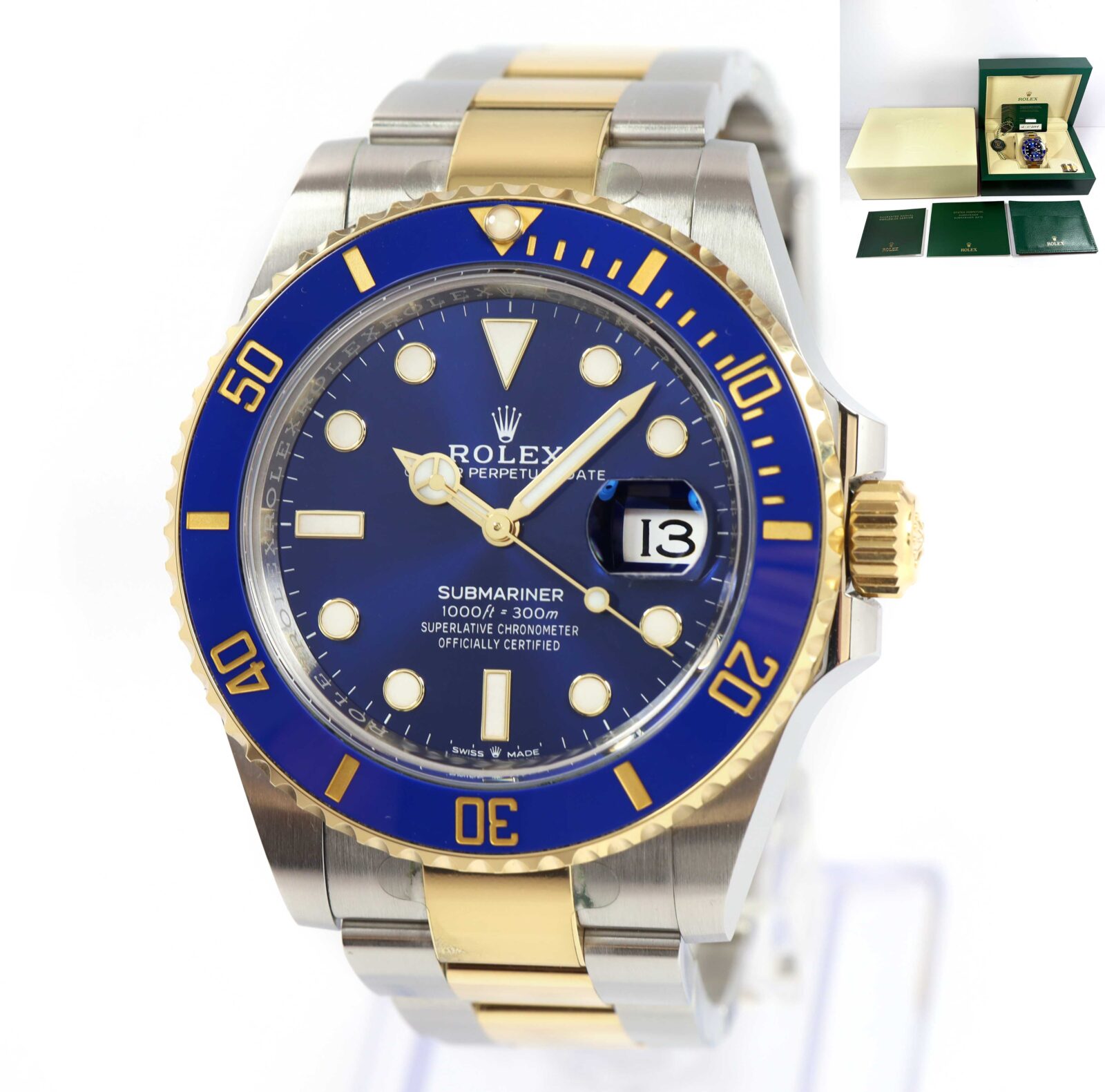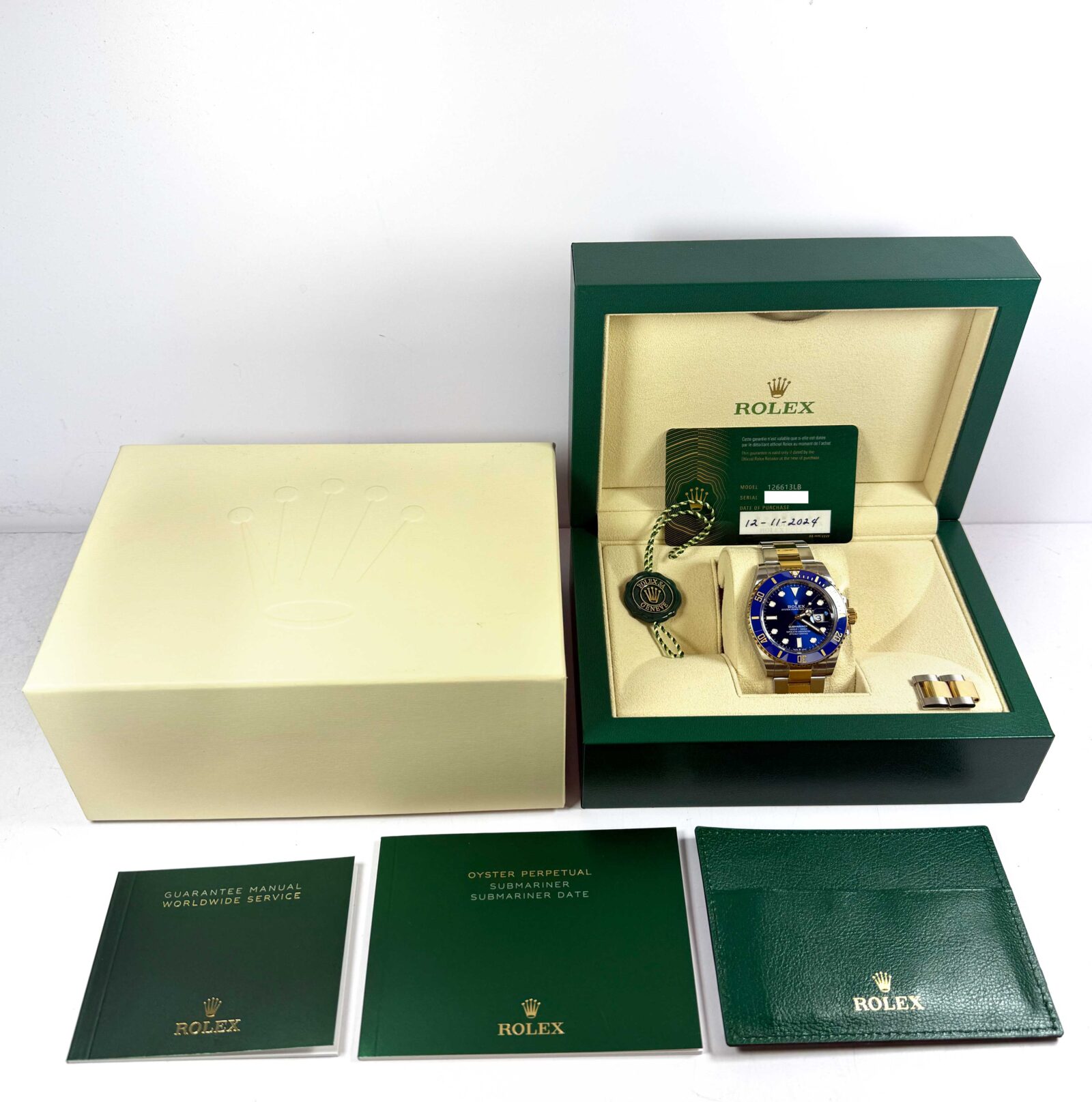 this rolex is in excellent condition and comes with its box, booklets, green hang tag, spare links, and warranty card dated november 12th, 2024 as shown in the pictures attached. This watch is in stock and available to ship immediately!