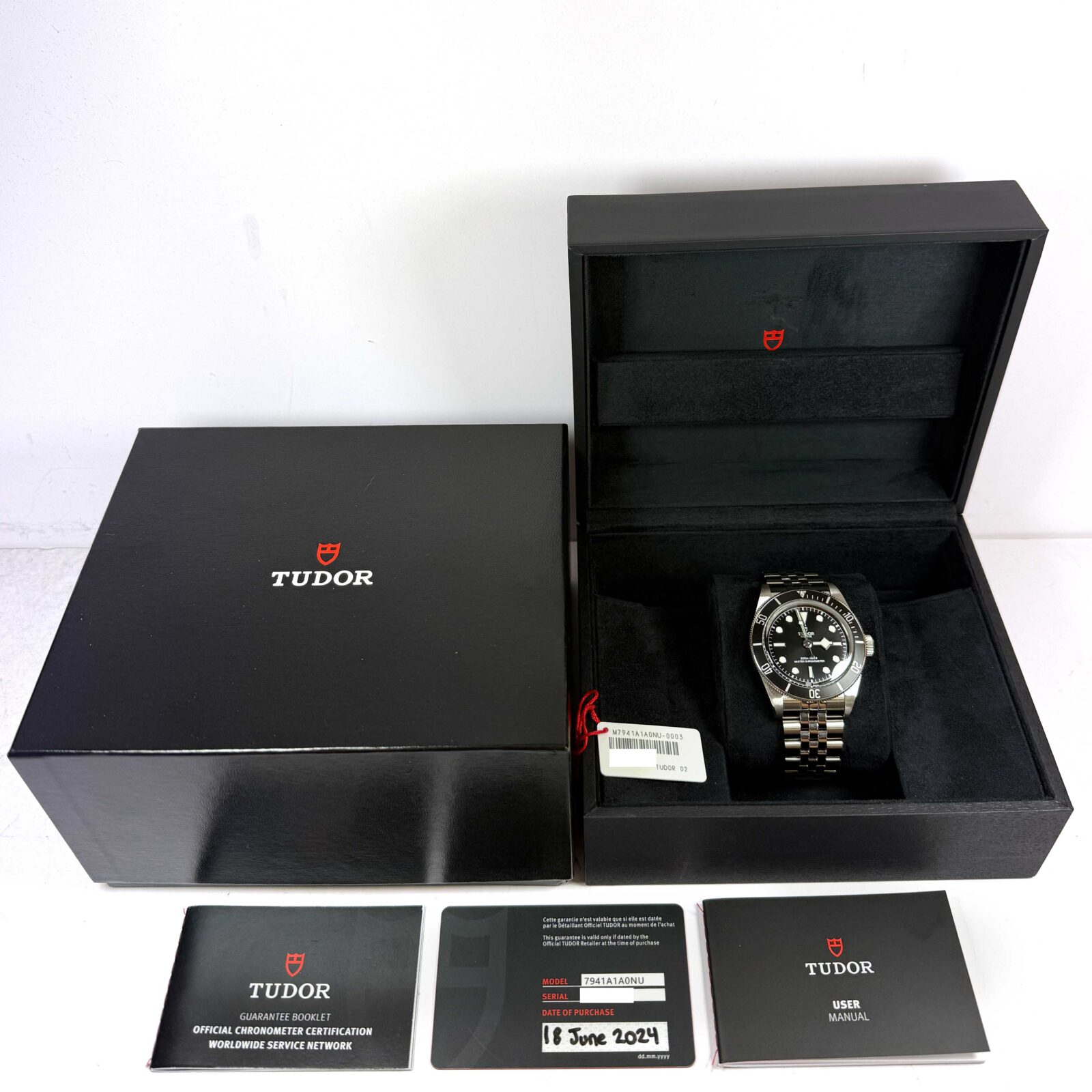 this tudor watch is in excellent condition and comes with its box, booklets, hang tag, and warranty card dated june 18th, 2024 as shown in the pictures attached. This watch is in stock and available to ship immediately!