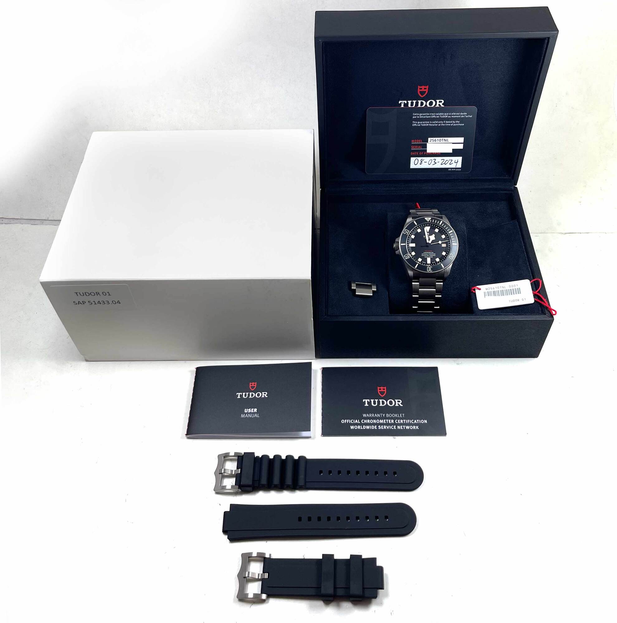 THIS TUDOR IS IN AMAZING OVERALL CONDITION WITH A SMALL NICK ON THE SIDE OF THE CASE AS SHOWN IN THE PICTURES ATTACHED. THIS COMES WITH ITS BOX, BOOKLETS, ONE SPARE LINK, HANG TAG, ADDITIONAL BLACK RUBBER STRAPS, AND WARRANTY CARD DATED AUGUST 3RD, 2024. TH...
